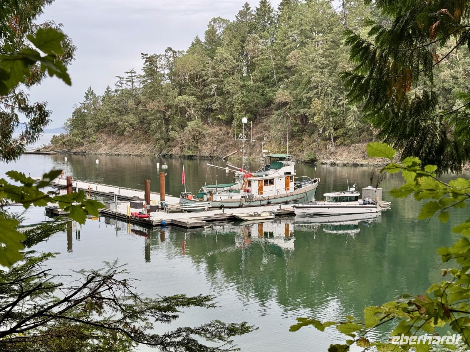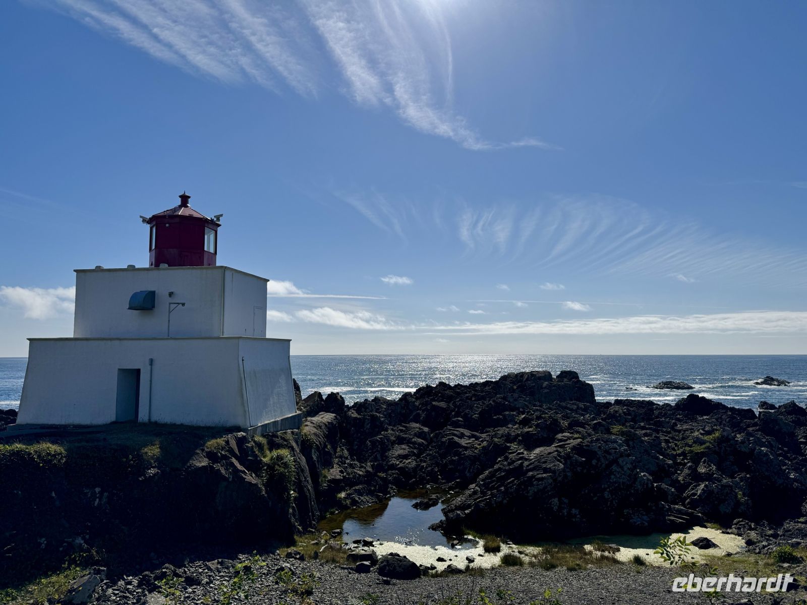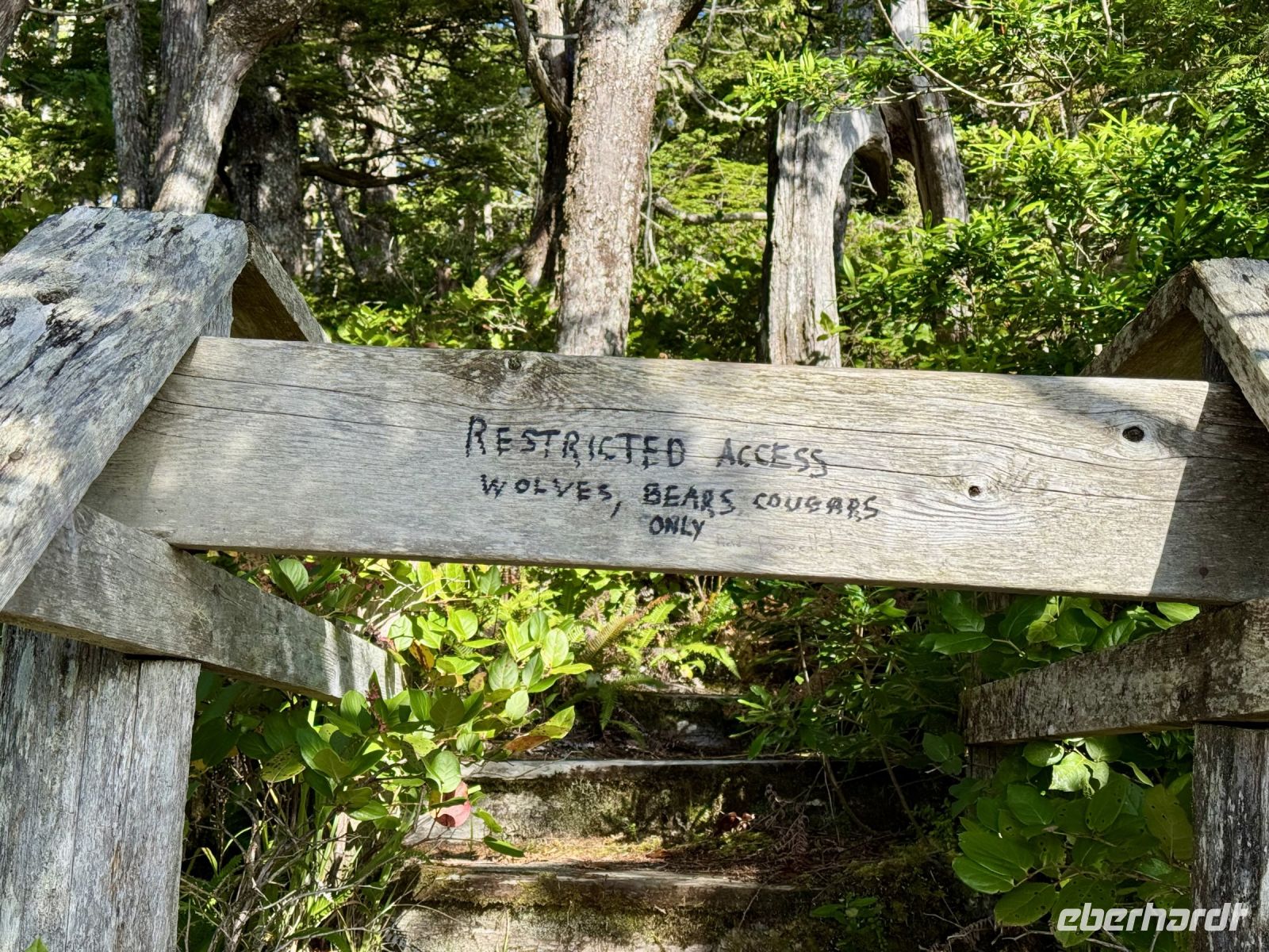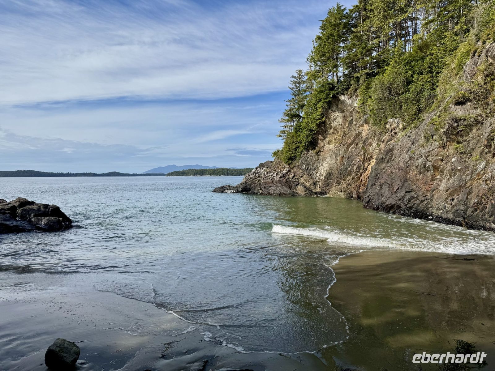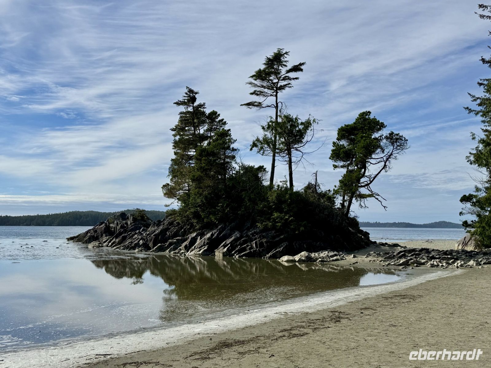 Der heutige Tag an der Westküste von Vancouver Island ist zweigeteilt: Am Vormittag erkunden wir gemeinsam den Pacific-Rim-Nationalpark, am Nachmittag haben meine Gäste wieder einmal Freizeit. Ein paar mutige Gesellen haben sich bereits für eine Walbeobachtung angemeldet; für die anderen werde ich einen zusätzlichen Spaziergang zum Tonquin Beach anbieten. Natürlich sind all diese Aktivitäten wetterabhängig, aber da brauche ich mir mit meiner Sonnenschein-Reisegruppe keine Sorgen zu machen. Also, Aufbruch zum Spaziergang durch den Regenwald! Auf Bretterpfaden laufen wir durch das dichte Unterholz, bestaunen das viele Grün in Form von Bäumen, Sträuchern, Farnen, Flechten und Moosen um uns herum und können sogar beobachten, wie der Morgentau im brennenden Schein der Sonne von den Zweigen regelrecht verdampft. Verrückt! Neben dem gemäßigten Küstenregenwald ist der Long Beach mit seinem kilometerlangen Sandstrand die zweite Attraktion des Nationalparks. Wir besuchen ihn einmal fast am südlichen und später fast am nördlichen Ende. Himmel, Ozean, Wald und Sandstrand fließen hier nahtlos ineinander über. Wir paar Menschen (es sind außer uns noch einige Individualtouristen, Camper und Surfer da) verlieren uns regelrecht auf dem breiten, kilometerlangen Küstenabschnitt. Gerade an einem so herrlichen Tag wie heute fühlt man sich an diesem magischen Ort völlig eins mit der Natur. Alle Ängste und Sorgen haben wir für den Moment am Highway zurückgelassen. Nach der Mittagspause in Tofino nehmen 13 Gäste Aufstellung am Hafen, um sich von mir zum Whale Watching zu verabschieden. Mit einem kleinen Schiff wollen sie einmal um die vorgelagerte Vargas Island fahren und dabei nach den großen Meeressäugern Ausschau halten. In der Hoffnung auf ein Wiedersehen verabschiede ich mich und laufe zurück zum Postamt von Tofino. Es ist der Treffpunkt für unsere kleine zusätzliche Wanderung durch den Regenwald zum Tonquin Beach. Er liegt am Ortsrand von Tofino unterhalb der Klippen. Vom Strand aus können wir mein Traumhaus sehen — Terrasse mit Aussicht auf das Meer, eigene Treppe hinunter zum Wasser. Nur noch 500 Reisen, dann habe ich das Geld vielleicht zusammen, oder so. Wir gehen sogar noch ein Stück weiter durch den Wald zu mehreren tollen Aussichtspunkten und drehen dann am Middle Beach um. Zurück in Tofino haben wir uns nach so viel Bewegung ein Eis mehr als verdient. Beim Abendessen im Shelter Restaurant schwärmen wir uns schließlich gegenseitig von unseren Erlebnissen vor. Während der Walbeobachtung haben meine Gäste nicht nur Grauwale, sondern auch Robben und putzige Seeotter gesehen — und das macht mich nun schon ein bisschen neidisch.