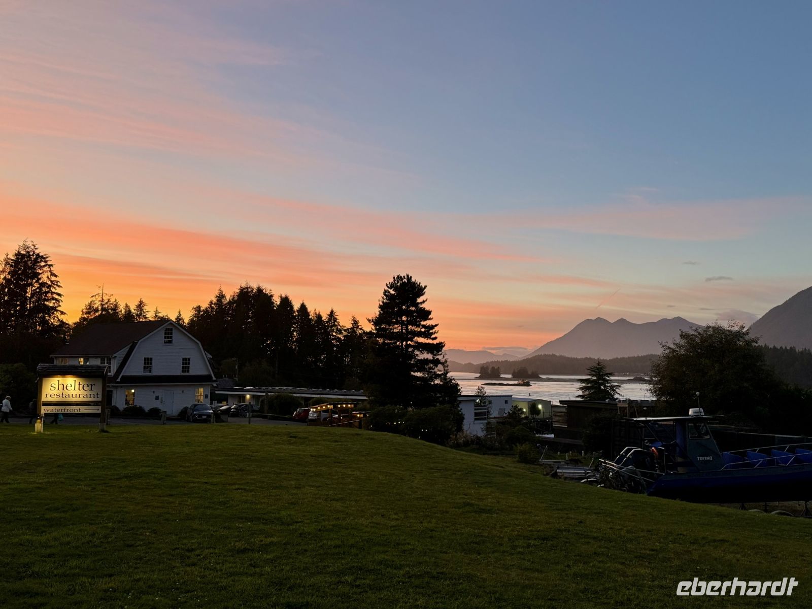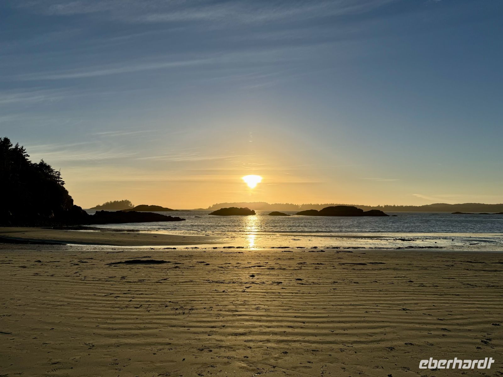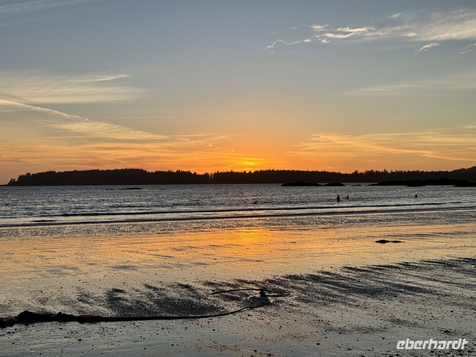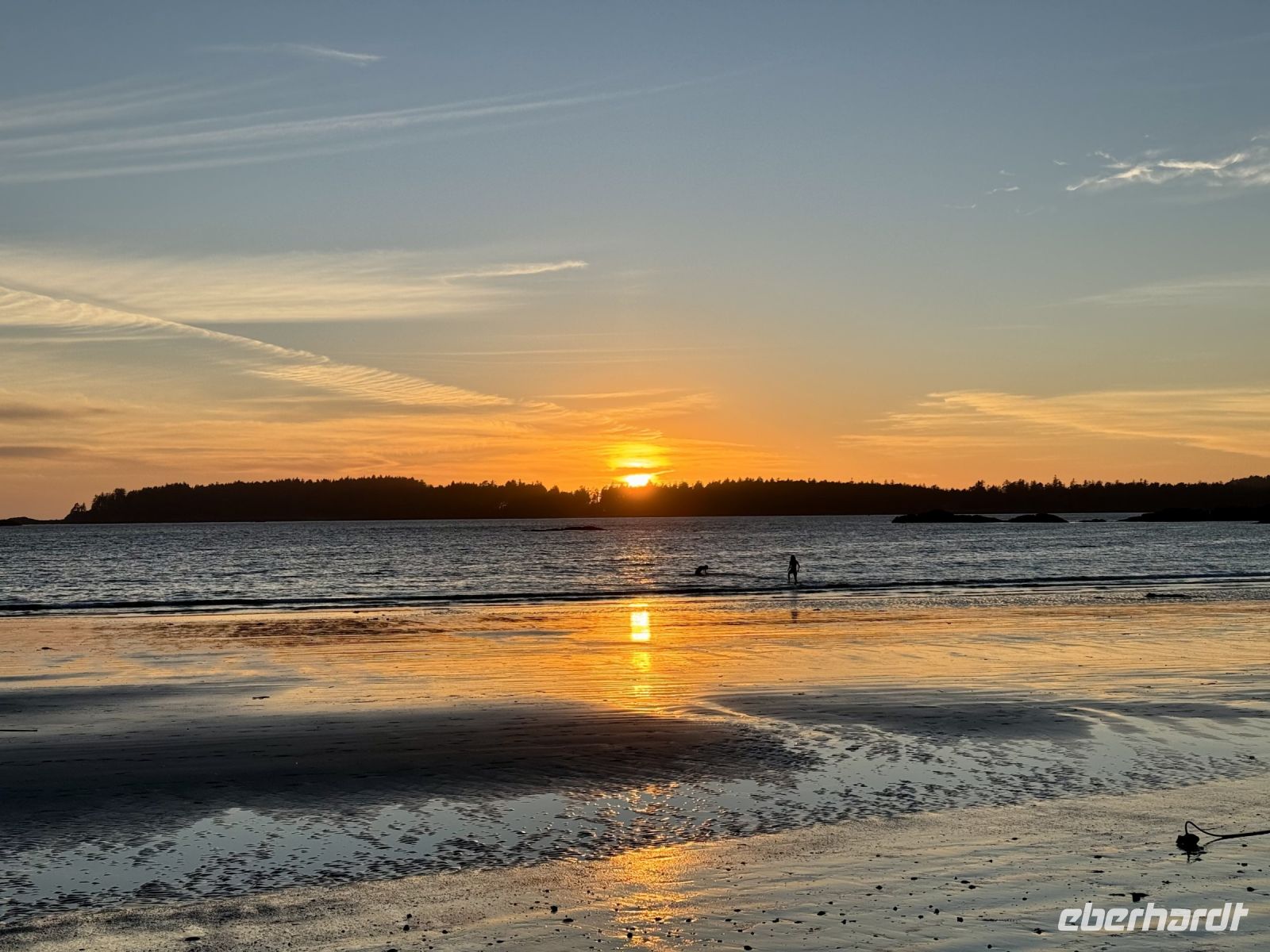 Ebenso lecker wie das Abendessen ist auch das Frühstück, das wir am Platz serviert bekommen. Meine Gäste sind begeistert von der schönen Hotelanlage und vom Sonnenaufgang. Doch Tofino wird auch schön, das weiß ich aus Erfahrung! Und ich freue mich riesig auf die Westküste von Vancouver Island. Durch die Umstellung des Reiseverlaufs wird es auch eine entspannte Fahrt. Wir haben zum Beispiel auch Zeit für einen kleinen, aber feinen zusätzlichen Waldspaziergang im Little Qualicum Falls Park. Immer auf dem Programm steht der unter dem Namen „Cathedral Grove“ bekannte Rundgang durch den Urwald aus riesigen Douglasien und Hemlock-Tannen. Die Stämme sind mit Moos bewachsen und von den Zweigen hängen Flechten. Um den größten Baum zu umfassen, bräuchten wir bestimmt sieben Personen! Über Port Alberny geht es dann weiter nach Ucluelet. Bis an die Westküste wartet nun Schwerstarbeit auf den armen Steve. Die Straße windet sich durch Berge und Wälder, wird auch recht eng an einigen Stellen — und eine Baustelle gibt es auch noch, wo die Straße gerade komplett fehlt. Dort finden zwar bei unserer Vorbeifahrt keine Arbeiten, aber immerhin zumindest eine Lagebesprechung statt. Am Ende der Strecke wartet eine T-förmige Kreuzung. Links geht es nach Ucluelet, rechts nach Tofino. Wir biegen zunächst links ab, denn ich möchte mit meinen Gästen einen weiteren Spaziergang absolvieren, und zwar den berühmten Lighthouse Loop am Leuchtturm von Ucluelet. Allerdings dürfen sich alle vorher im Ortskern noch stärken, z. B. an einem Fish-&-Chips-Stand. Toller blauer Himmel, tolles Sonnenlicht, das auf den Wellen glitzert, tolles tiefblaues Meer, tolle schroffe Felsenküste, tolle Gäste mit sooooooo viel Wetterglück! Mit anderen Worten: einfach wunderschön, der Lighthouse Loop! Ein großartiger erster Eindruck von der rauen Pazifikküste. Das weitere Tagesprogramm habe ich dann um einen Vorschlag von unserem Steve herumgebastelt, denn er möchte uns gerne zum Sonnenuntergang an den MacKenzie Beach fahren. Deshalb fahren wir nun durch den Nationalpark nach Tofino und beziehen für zwei Nächte unsere Zimmer im Hotel. Anschließend halten wir am Supermarkt im Zentrum von Tofino und machen eine Pause zum Abendessen. Schließlich brechen wir rechtzeitig zum Sonnenuntergang zu besagtem Strand auf und erwarten freudig das Schauspiel. Ja, es ist inzwischen schon ein bisschen frisch geworden, doch wir sind vorbereitet und entsprechend eingemummelt. Mein Herz schlägt jedenfalls vor Freude Purzelbäume, als die Sonne langsam hinter der Halbinsel im Meer versinkt und als Abschiedsgruß ihr orangefarbenes und rotes Licht zu uns herüberschickt.