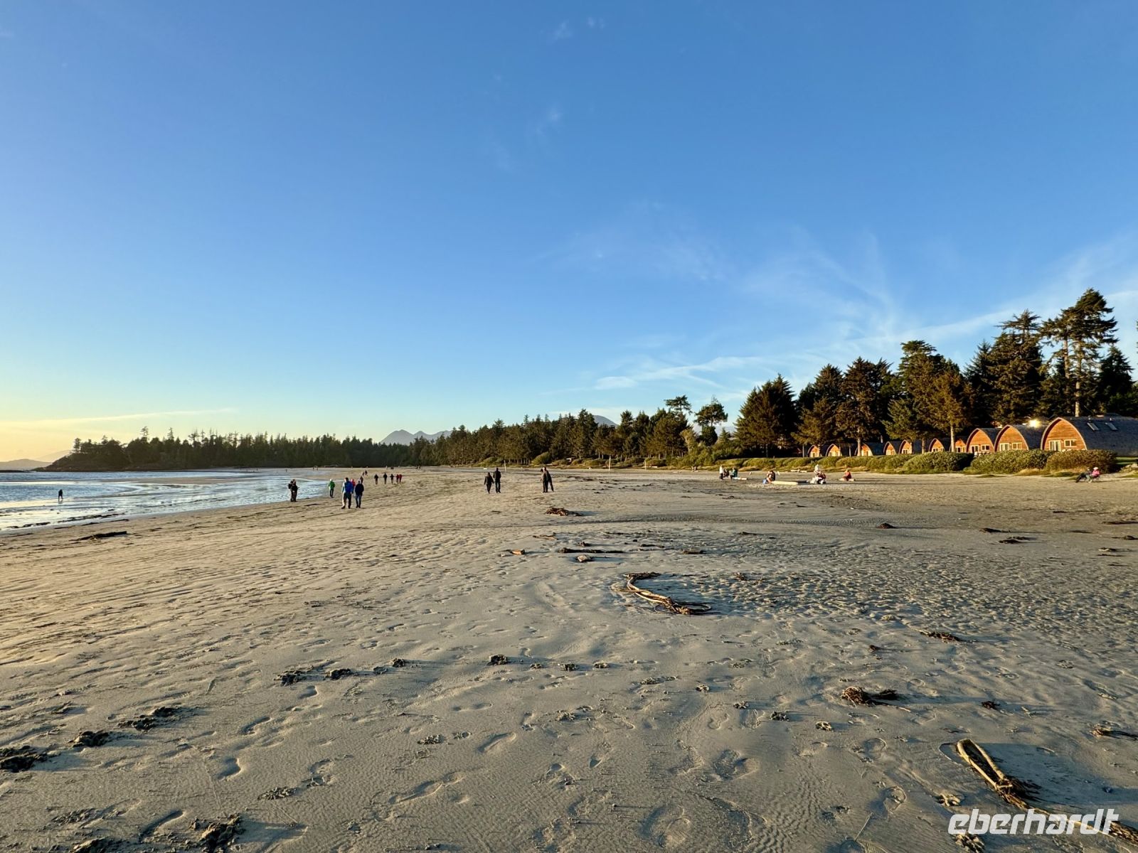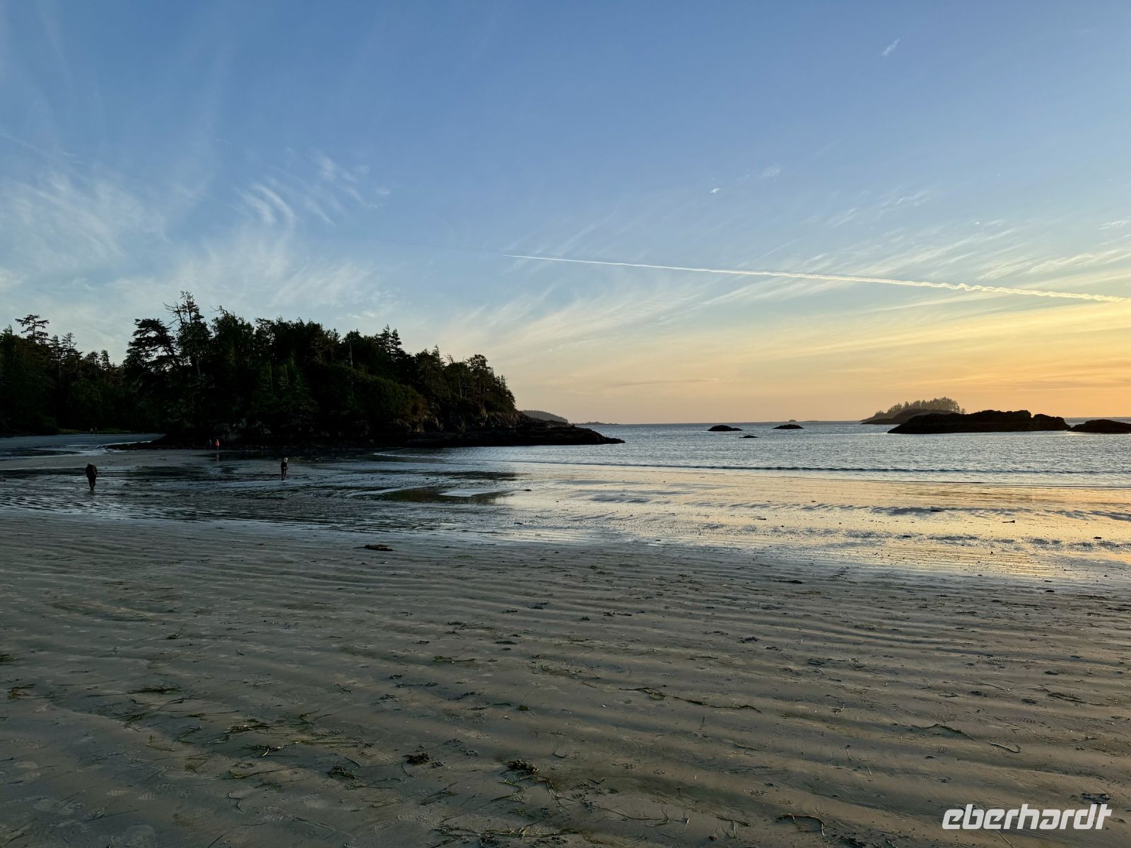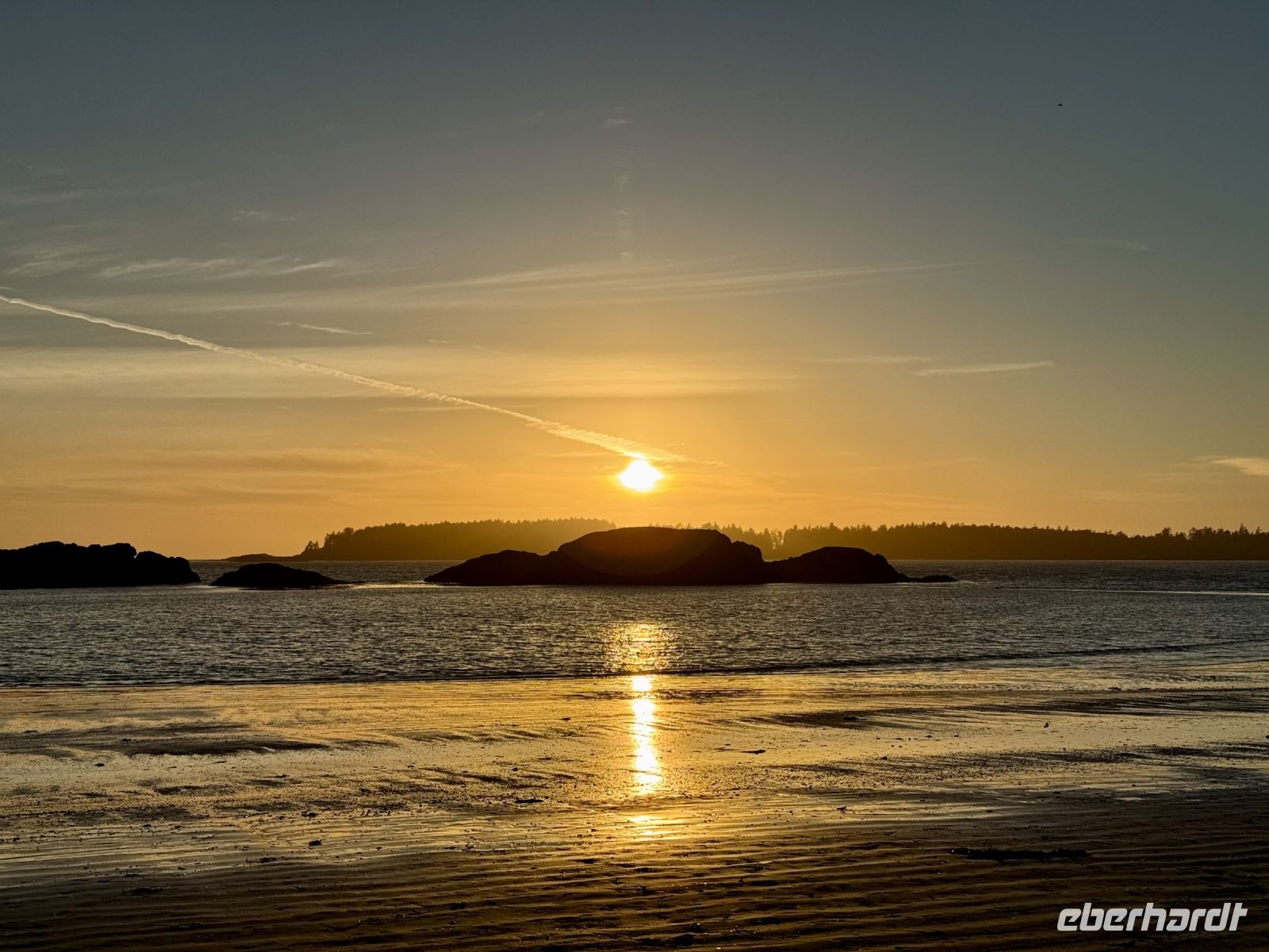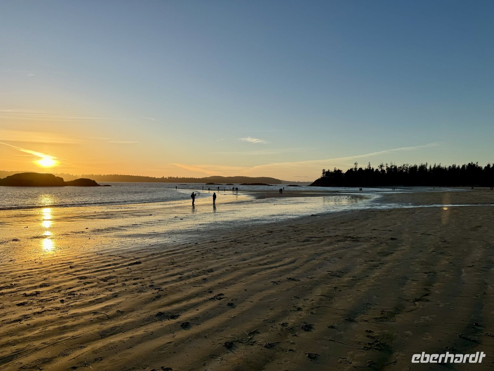 Ebenso lecker wie das Abendessen ist auch das Frühstück, das wir am Platz serviert bekommen. Meine Gäste sind begeistert von der schönen Hotelanlage und vom Sonnenaufgang. Doch Tofino wird auch schön, das weiß ich aus Erfahrung! Und ich freue mich riesig auf die Westküste von Vancouver Island. Durch die Umstellung des Reiseverlaufs wird es auch eine entspannte Fahrt. Wir haben zum Beispiel auch Zeit für einen kleinen, aber feinen zusätzlichen Waldspaziergang im Little Qualicum Falls Park. Immer auf dem Programm steht der unter dem Namen „Cathedral Grove“ bekannte Rundgang durch den Urwald aus riesigen Douglasien und Hemlock-Tannen. Die Stämme sind mit Moos bewachsen und von den Zweigen hängen Flechten. Um den größten Baum zu umfassen, bräuchten wir bestimmt sieben Personen! Über Port Alberny geht es dann weiter nach Ucluelet. Bis an die Westküste wartet nun Schwerstarbeit auf den armen Steve. Die Straße windet sich durch Berge und Wälder, wird auch recht eng an einigen Stellen — und eine Baustelle gibt es auch noch, wo die Straße gerade komplett fehlt. Dort finden zwar bei unserer Vorbeifahrt keine Arbeiten, aber immerhin zumindest eine Lagebesprechung statt. Am Ende der Strecke wartet eine T-förmige Kreuzung. Links geht es nach Ucluelet, rechts nach Tofino. Wir biegen zunächst links ab, denn ich möchte mit meinen Gästen einen weiteren Spaziergang absolvieren, und zwar den berühmten Lighthouse Loop am Leuchtturm von Ucluelet. Allerdings dürfen sich alle vorher im Ortskern noch stärken, z. B. an einem Fish-&-Chips-Stand. Toller blauer Himmel, tolles Sonnenlicht, das auf den Wellen glitzert, tolles tiefblaues Meer, tolle schroffe Felsenküste, tolle Gäste mit sooooooo viel Wetterglück! Mit anderen Worten: einfach wunderschön, der Lighthouse Loop! Ein großartiger erster Eindruck von der rauen Pazifikküste. Das weitere Tagesprogramm habe ich dann um einen Vorschlag von unserem Steve herumgebastelt, denn er möchte uns gerne zum Sonnenuntergang an den MacKenzie Beach fahren. Deshalb fahren wir nun durch den Nationalpark nach Tofino und beziehen für zwei Nächte unsere Zimmer im Hotel. Anschließend halten wir am Supermarkt im Zentrum von Tofino und machen eine Pause zum Abendessen. Schließlich brechen wir rechtzeitig zum Sonnenuntergang zu besagtem Strand auf und erwarten freudig das Schauspiel. Ja, es ist inzwischen schon ein bisschen frisch geworden, doch wir sind vorbereitet und entsprechend eingemummelt. Mein Herz schlägt jedenfalls vor Freude Purzelbäume, als die Sonne langsam hinter der Halbinsel im Meer versinkt und als Abschiedsgruß ihr orangefarbenes und rotes Licht zu uns herüberschickt.