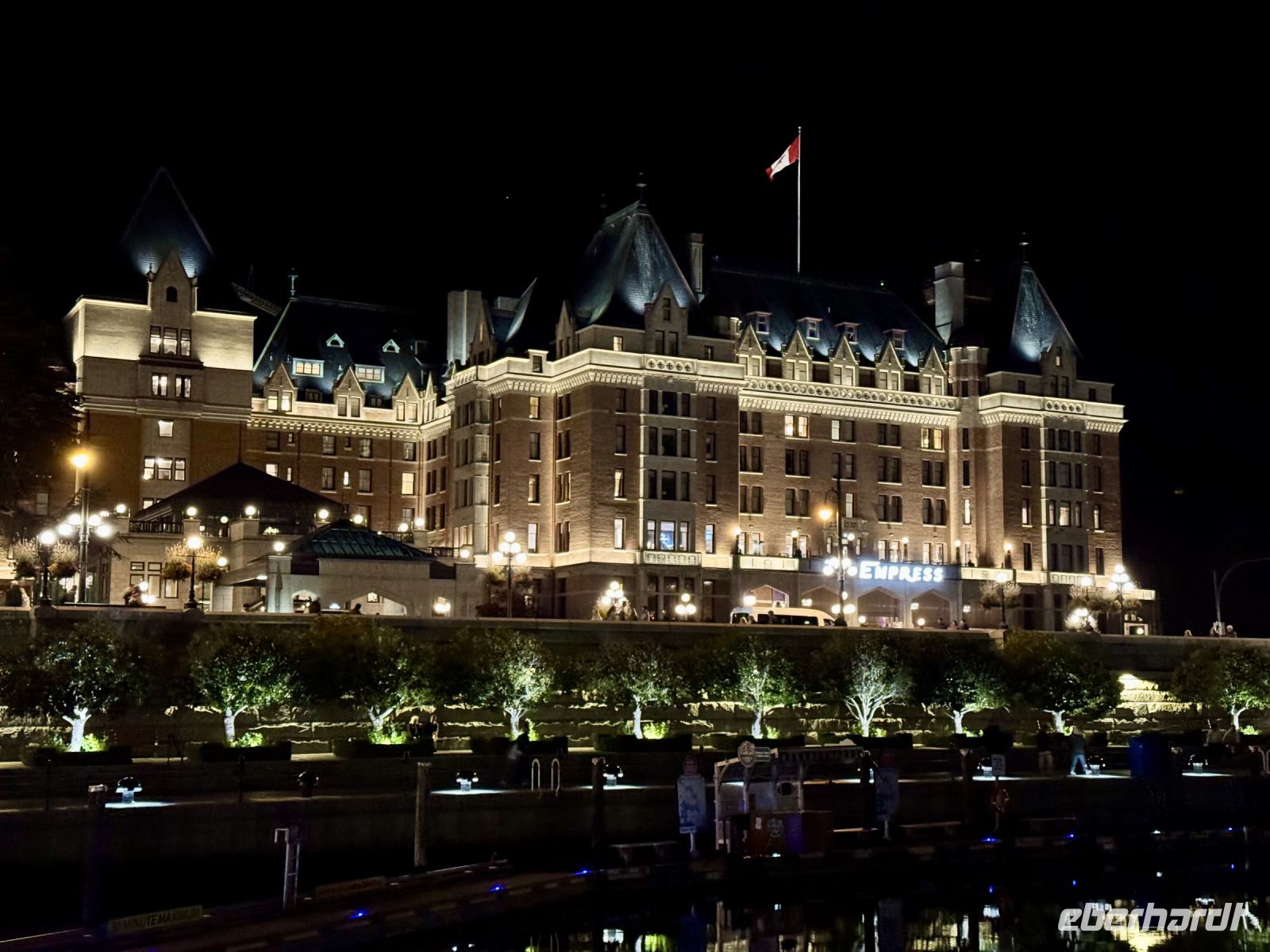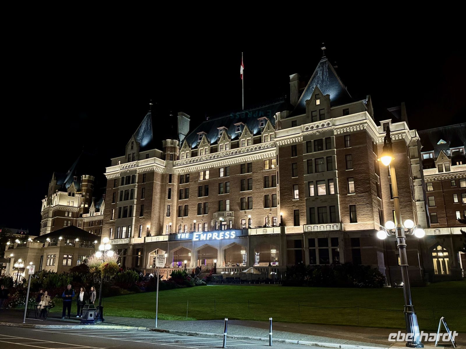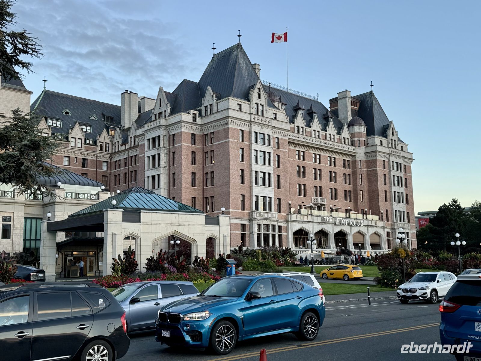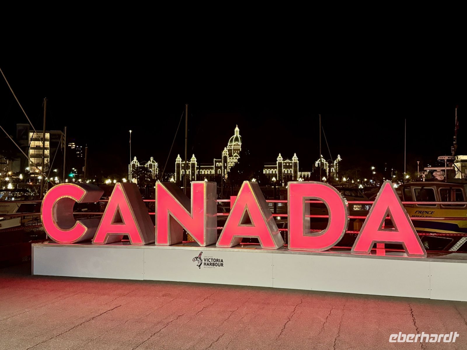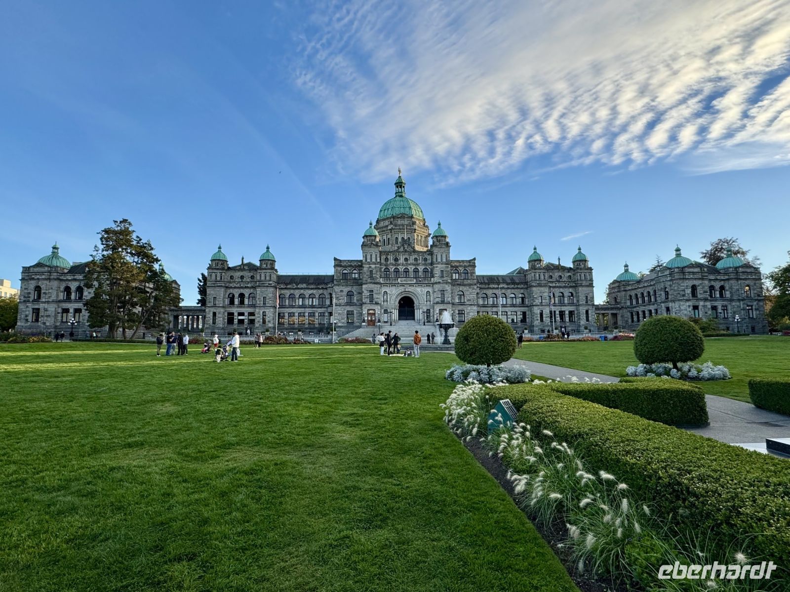 Es fällt mir schwer, die schöne Westküste von Vancouver zu verlassen. Immerhin geht es heute aber nach Victoria, in eine bunte Stadt am Meer, die ich ebenfalls sehr mag. Draußen ziehen der große Kennedy Lake sowie die herrlichen grünen Wälder und Berge vorbei. Trotz Baustelle auf dem Highway 4 kommen wir gut voran und erreichen pünktlich um 12 Uhr — also genau richtig zur Mittagszeit — den Old Farmers Market in Coombs. Die Ziegen auf dem Dach sind ja noch lustig, aber die vielen seltsamen Statuen auf dem Platz sorgen für fragende Blicke. Immerhin gibt es im Markt leckere Tomatensuppe und eine Eisdiele mit vielen Sorten. Die Markthalle in Chemainus mutet dann mit ihren Flipperautomaten und Sammelfigurenvitrinen ebenfalls etwas schrullig an. Star Wars, LEGO und Pokemon stehen hier hoch im Kurs. Aber hier wird auch wieder Eis verkauft — und Kaffee (und sogar Schweinsohren)! Den Kaffee gibt es dann zur Belohnung, nachdem wir uns den großen Teil der inzwischen weit über 40 Wandgemälde erlaufen haben, die die Geschichte des Ortes und der First Nations nacherzählen. Dank angepflanzter Ahornbäume herrscht auch ein bisschen Indian Summer in Chemainus. Über den Malahat Pass gelangen wir schließlich am späten Nachmittag auf die Saanich Peninsula und nach Victoria. Wir sind zurück in der Zivilisation und werden mit vielen bunten Blumen empfangen! Die Blütenpracht ist einer der Gründe, warum Victoria als englischste Stadt außerhalb von Großbritannien gilt. Steve parkt den Bus für einen Fotostopp ganz am Ende des Trans-Canada Highways: am Mile Zero Monument im Beacon Hill Park. Wer hier nicht bremst, stürzt über die Klippen ins Meer. Am Horizont sind bereits die Olympic Mountains im US-Bundesstaat Washington zu erkennen. Über die Uferstraße gelangen wir zurück zum Inner Harbour und zum Hotel. Nach dem Check-in spazieren wir zum Parlament von BC, zum Helmcken House hinter dem Royal Museum of British Columbia (das leider gerade restauriert wird) und in das berühmte Empress Hotel. Einige wohlsituierte Gäste sitzen dort im Restaurant beim Afternoon Tea und nippen an ihren filigranen Porzellantässchen. Morgen in den Butchart Gardens werden wir es ihnen gleichtun! Ha! Mein kleiner Rundgang endet rein zufällig am Restaurant am Hafen, wo wir zum Abendessen eingebucht sind. Auch hier werden wir gut umsorgt und verköstigt, während gegenüber das Parlamentsgebäude mit Einbruch der Nacht von vielen tausend Lampen erleuchtet wird. Der kurze Fußmarsch zurück zum Hotel kommt uns zur Verdauung sehr gelegen, könnte sogar gern länger sein, denn der Nachtisch war wieder einmal sehr reichhaltig. Andererseits fällt es schwer, nicht dem lockenden Ruf der weichen und großen Hotelbetten zu erliegen …