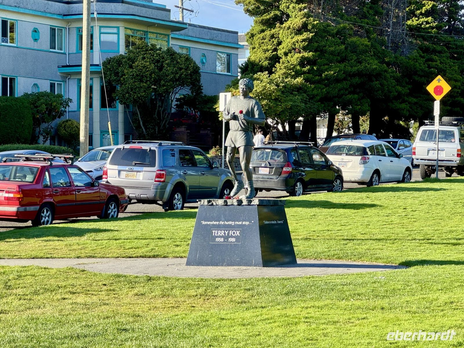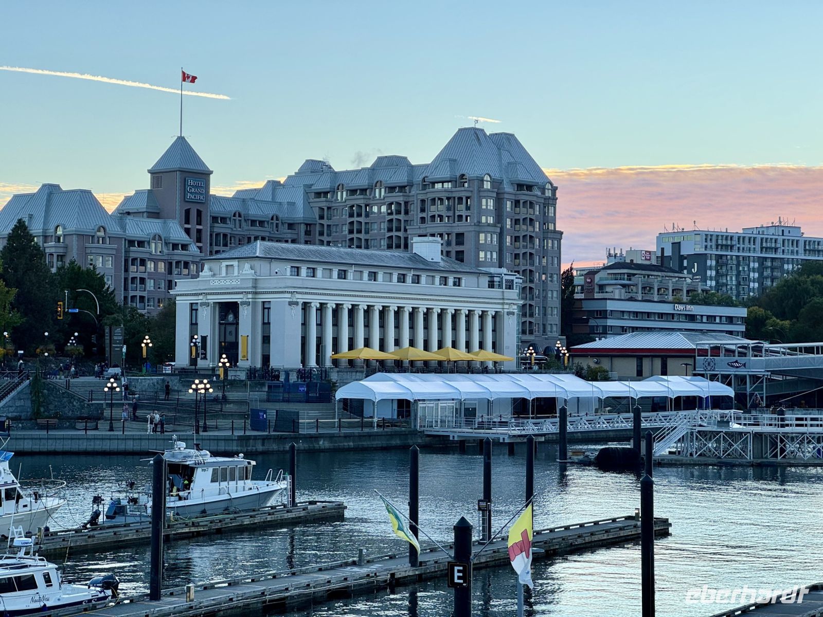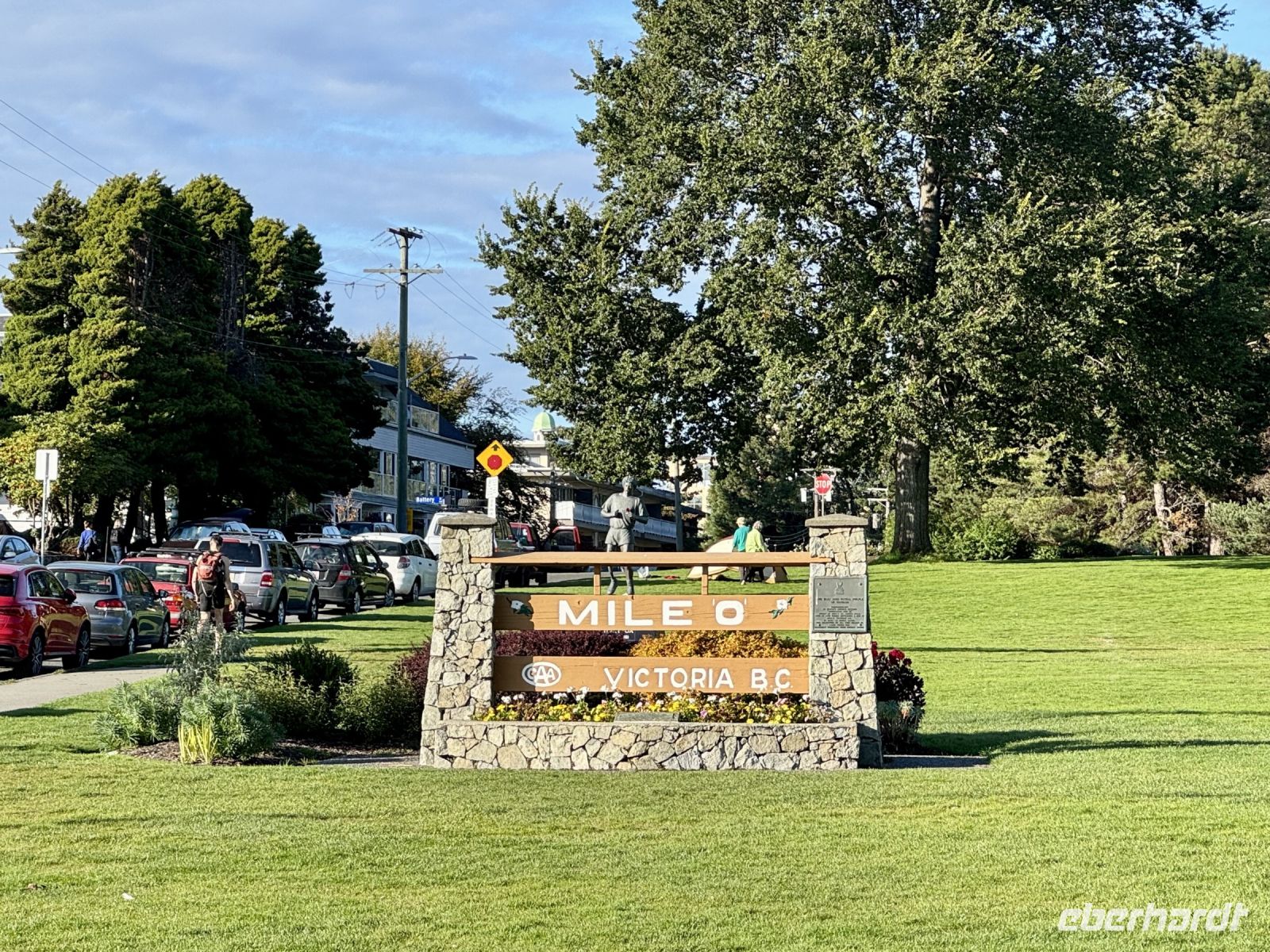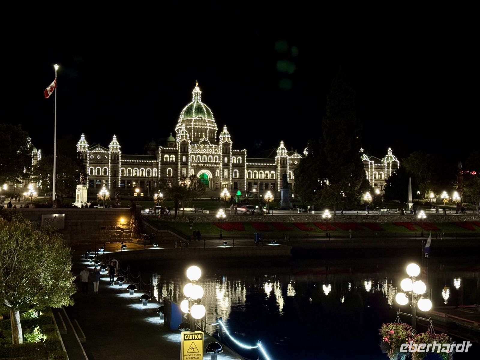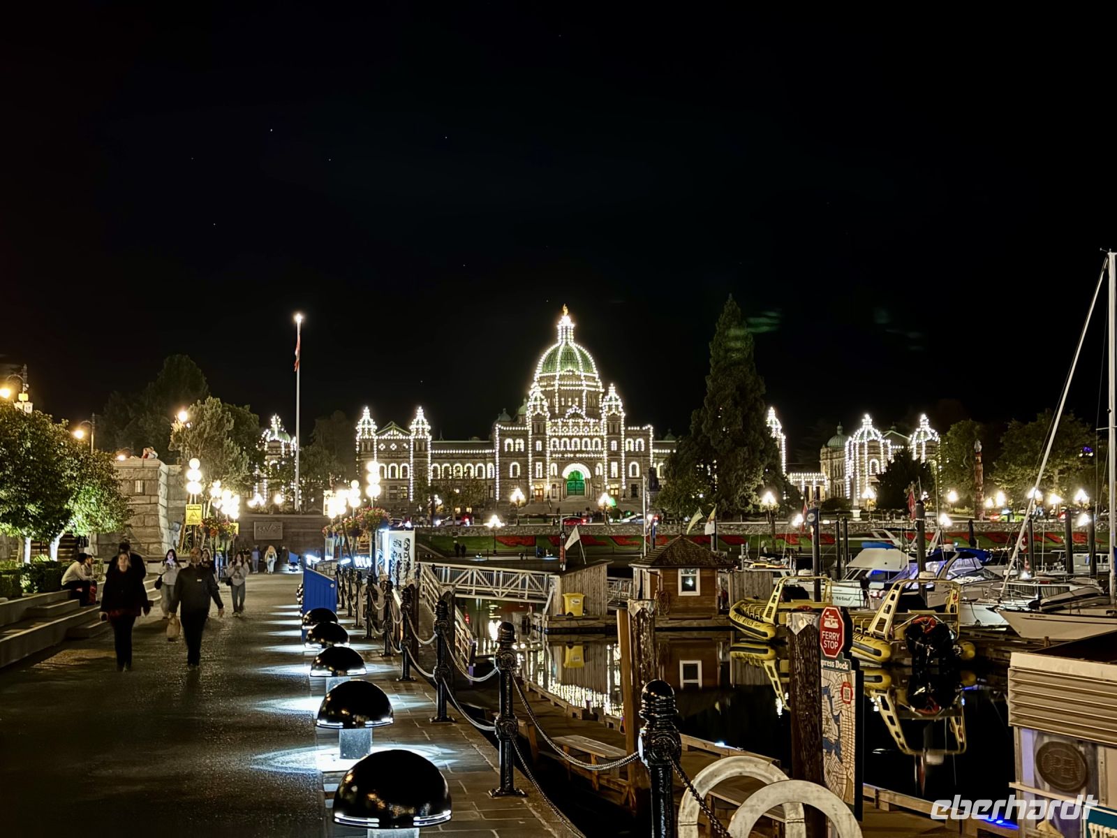 Es fällt mir schwer, die schöne Westküste von Vancouver zu verlassen. Immerhin geht es heute aber nach Victoria, in eine bunte Stadt am Meer, die ich ebenfalls sehr mag. Draußen ziehen der große Kennedy Lake sowie die herrlichen grünen Wälder und Berge vorbei. Trotz Baustelle auf dem Highway 4 kommen wir gut voran und erreichen pünktlich um 12 Uhr — also genau richtig zur Mittagszeit — den Old Farmers Market in Coombs. Die Ziegen auf dem Dach sind ja noch lustig, aber die vielen seltsamen Statuen auf dem Platz sorgen für fragende Blicke. Immerhin gibt es im Markt leckere Tomatensuppe und eine Eisdiele mit vielen Sorten. Die Markthalle in Chemainus mutet dann mit ihren Flipperautomaten und Sammelfigurenvitrinen ebenfalls etwas schrullig an. Star Wars, LEGO und Pokemon stehen hier hoch im Kurs. Aber hier wird auch wieder Eis verkauft — und Kaffee (und sogar Schweinsohren)! Den Kaffee gibt es dann zur Belohnung, nachdem wir uns den großen Teil der inzwischen weit über 40 Wandgemälde erlaufen haben, die die Geschichte des Ortes und der First Nations nacherzählen. Dank angepflanzter Ahornbäume herrscht auch ein bisschen Indian Summer in Chemainus. Über den Malahat Pass gelangen wir schließlich am späten Nachmittag auf die Saanich Peninsula und nach Victoria. Wir sind zurück in der Zivilisation und werden mit vielen bunten Blumen empfangen! Die Blütenpracht ist einer der Gründe, warum Victoria als englischste Stadt außerhalb von Großbritannien gilt. Steve parkt den Bus für einen Fotostopp ganz am Ende des Trans-Canada Highways: am Mile Zero Monument im Beacon Hill Park. Wer hier nicht bremst, stürzt über die Klippen ins Meer. Am Horizont sind bereits die Olympic Mountains im US-Bundesstaat Washington zu erkennen. Über die Uferstraße gelangen wir zurück zum Inner Harbour und zum Hotel. Nach dem Check-in spazieren wir zum Parlament von BC, zum Helmcken House hinter dem Royal Museum of British Columbia (das leider gerade restauriert wird) und in das berühmte Empress Hotel. Einige wohlsituierte Gäste sitzen dort im Restaurant beim Afternoon Tea und nippen an ihren filigranen Porzellantässchen. Morgen in den Butchart Gardens werden wir es ihnen gleichtun! Ha! Mein kleiner Rundgang endet rein zufällig am Restaurant am Hafen, wo wir zum Abendessen eingebucht sind. Auch hier werden wir gut umsorgt und verköstigt, während gegenüber das Parlamentsgebäude mit Einbruch der Nacht von vielen tausend Lampen erleuchtet wird. Der kurze Fußmarsch zurück zum Hotel kommt uns zur Verdauung sehr gelegen, könnte sogar gern länger sein, denn der Nachtisch war wieder einmal sehr reichhaltig. Andererseits fällt es schwer, nicht dem lockenden Ruf der weichen und großen Hotelbetten zu erliegen …