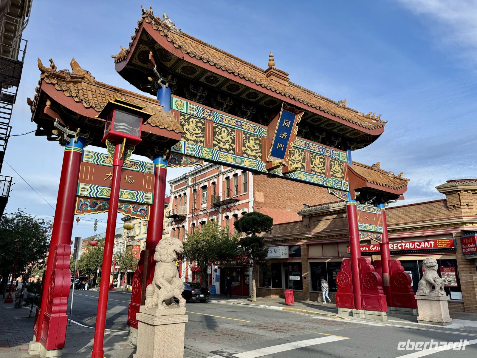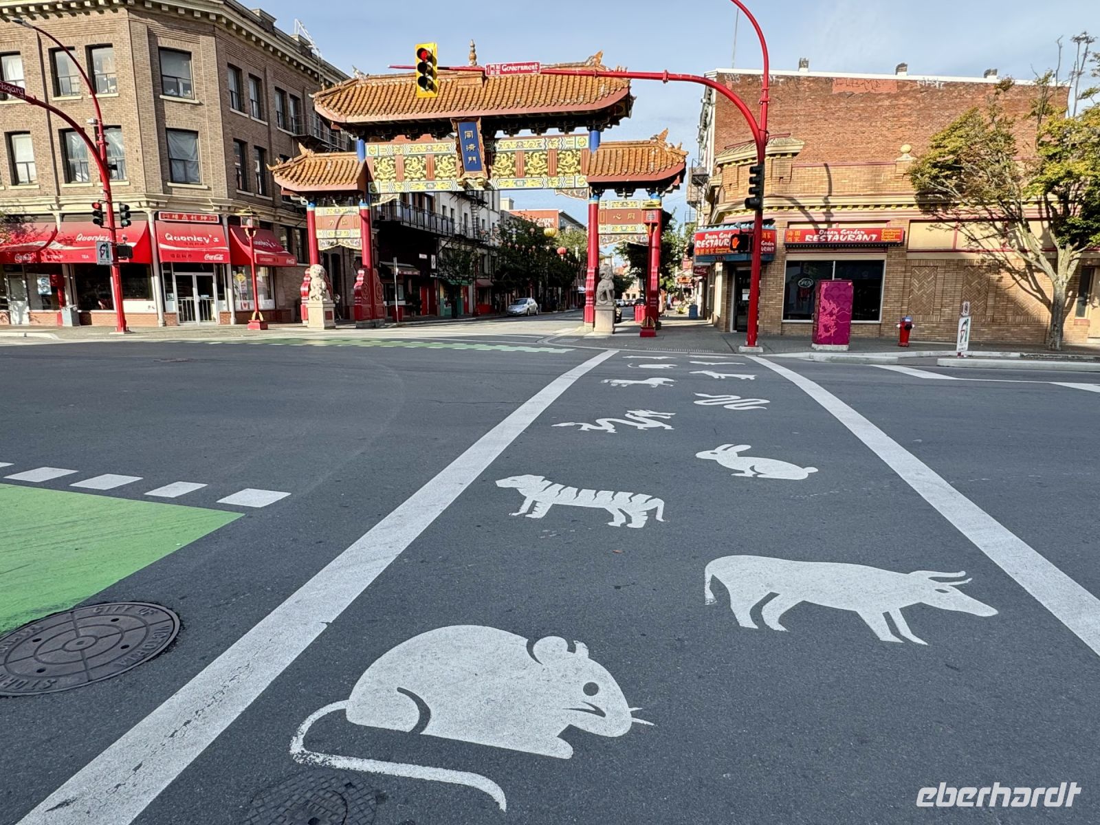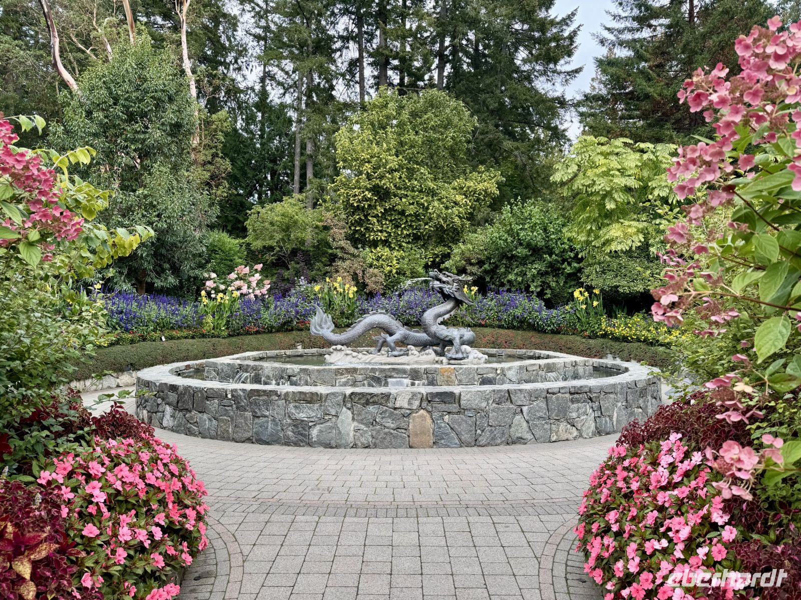 Nach vier Nächten auf Vancouver Island wartet am Vormittag ein weiteres echtes Highlight auf uns: die weltberühmten Butchart Gardens. Auf dem Weg dorthin halten wir kurz in der Chinatown von Victoria und bestaunen das majestätische Tor sowie die Fußgängerüberwege mit Tierkreiszeichen. Um 10 Uhr an einem Sonntag sind die Butchart Gardens noch vergleichsweise leer, füllen sich aber gegen Mittag immer mehr. Deshalb sollten wir die Zeit gut nutzen, denn es gibt viel zu sehen: den ursprünglichen Senkgarten, den Italienischen Garten, den Japanischen Garten. Später fängt es wider Erwarten doch schon leicht zu regnen an, aber überall werden durchsichtige Regenschirme zum Ausleihen verteilt. Das ist wirklich sehr aufmerksam! Gegen den mittäglichen Hungeranfall wird uns im ehemaligen Studierzimmer der Familie Butchart der Afternoon Tea serviert. Alles sieht so hübsch aus, dass wir die Etageren schnell fotografieren müssen, bevor wir uns auf die vielen kleinen Köstlichkeiten stürzen. Am Ende bleibt mehr übrig als gedacht — gerade der Schokoladenkuchen ist wieder sehr mächtig! Wie viele Kalorien da wohl verbacken sind? Wollen wir am liebsten gar nicht wissen, denn wir haben ja (noch) Urlaub! Freundlicherweise bekommen wir Schächtelchen zum Einpacken für den kleinen Hunger unterwegs. Für den Augenblick sind wir jedoch alle satt und zufrieden, selbst ich lasse den obligatorischen Pflichtbesuch beim Gelato-Stand heute ausfallen. Einige Minuten können wir anschließend noch durch die prächtigen Gärten schlendern, bevor uns Steve zurück am Bus erwartet. Es ist leider schon sein letzter Tag mit uns — seine freundliche Art wird uns morgen fehlen! Bis Vancouver muss/darf/soll er uns noch fahren, weshalb wir in Richtung Swartz Bay aufbrechen, von wo aus die Fähre nach Tsawassen geht. Ein bisschen windig ist es während der Überfahrt, vor allem die erste Hälfte durch die Gulf Islands ist aber trotzdem wie immer sehr schön. Zurück auf dem Festland haben wir heute leider vor Einbruch der Dunkelheit nur noch Zeit für einen Abstecher zum Queen Elizabeth Park und anschließend zum Stanley Park. (Unsere ursprüngliche Fährverbindung eine Stunde eher wurde gestrichen.) Im QEP wird mal wieder geheiratet bzw. werden, trotz starken Windes, Hochzeitsfotos von Brautpaaren gemacht. Eine Braut guckt auch schon ganz mürrisch drein. Wir hingegen sind ganz verzückt ob der schönen Aussicht auf die Downtown und die Berge im Hintergrund. Quer durch die ganze Stadt geht es dann noch zum riesigen Stanley Park, wo wir erneut die Aussicht auf die Downtown, die Totempfähle, die kleine Meerjungfrau mit Taucherbrille und die Lions Gate Bridge bewundern. Am Prospect Point zollen wir schon einmal dem lieben Steve unseren Respekt und unsere Anerkennung für die wirklich gute Arbeit und herzliche Betreuung während der letzten Tage seit Calgary. Seine herzliche Art wird uns ab morgen fehlen. Pflichtbewusst bringt er uns natürlich noch zu unserem letzten Hotel der Reise an der English Bay. Dann entlassen wir ihn (endlich) zu seiner Frau, die sicher schon sehnsüchtig auf ihn wartet. Wir hingegen beziehen unsere Zimmer und stürzen uns auf der Suche nach einem Abendessen ins Nachtleben von Vancouver.