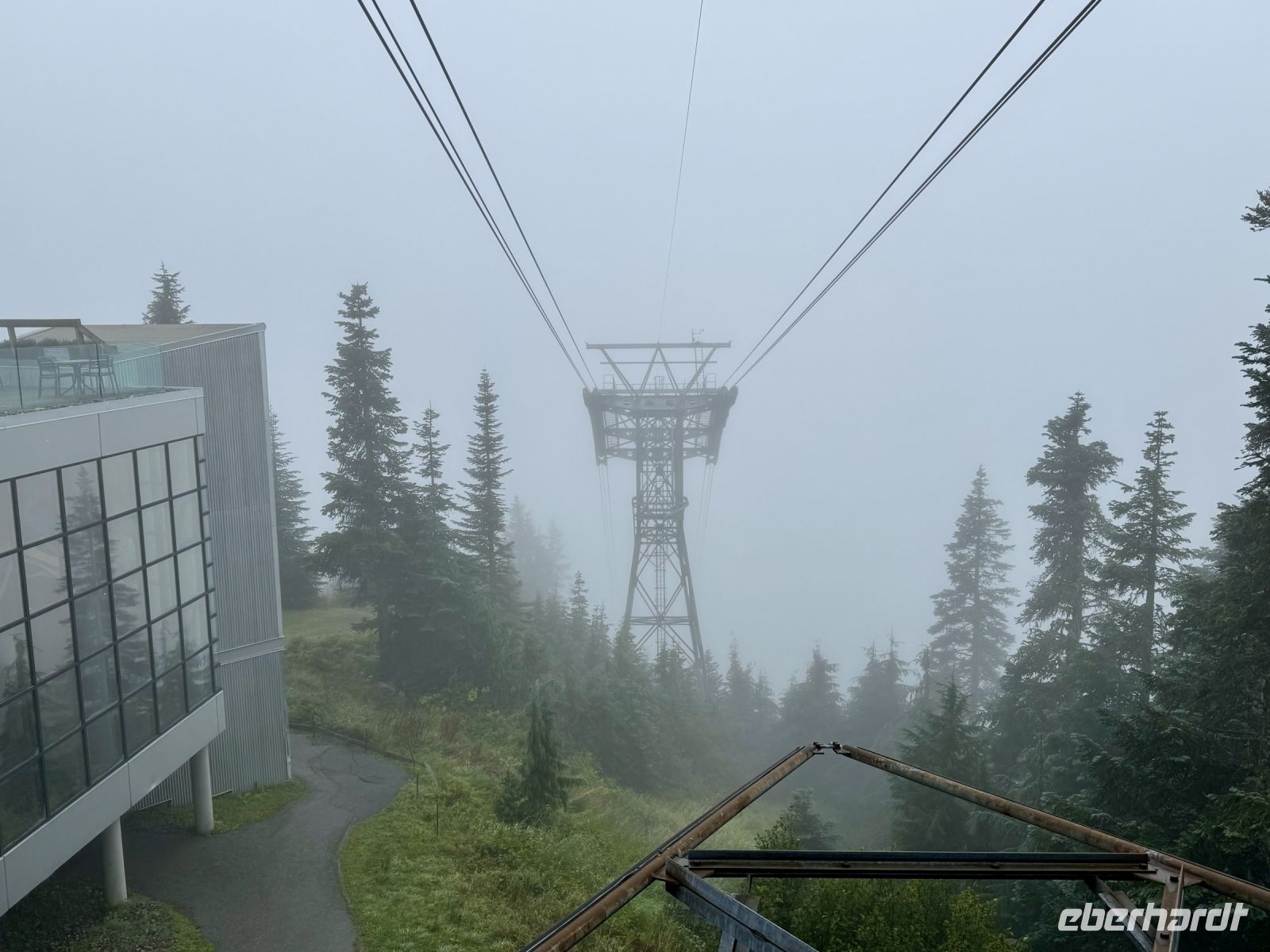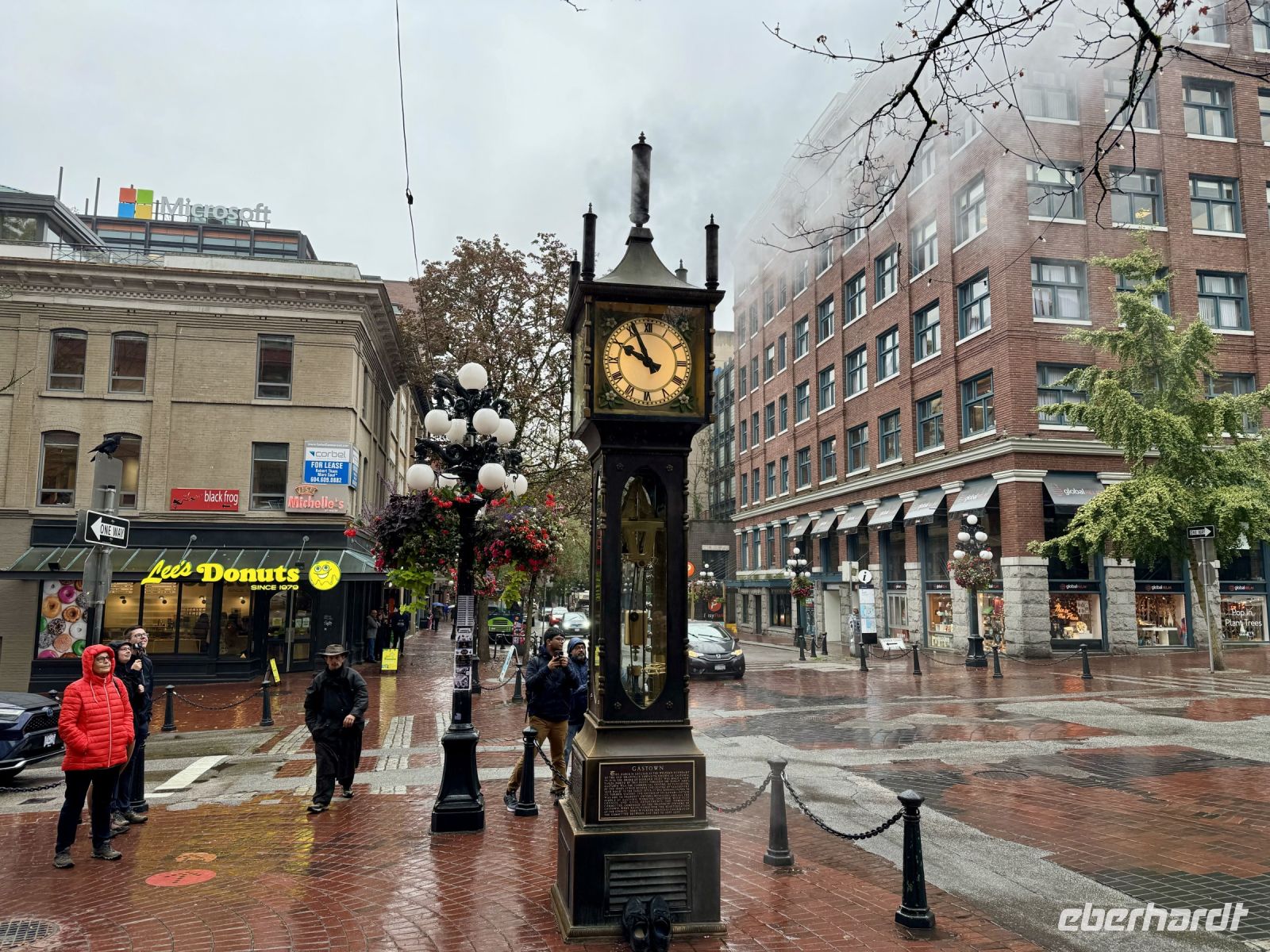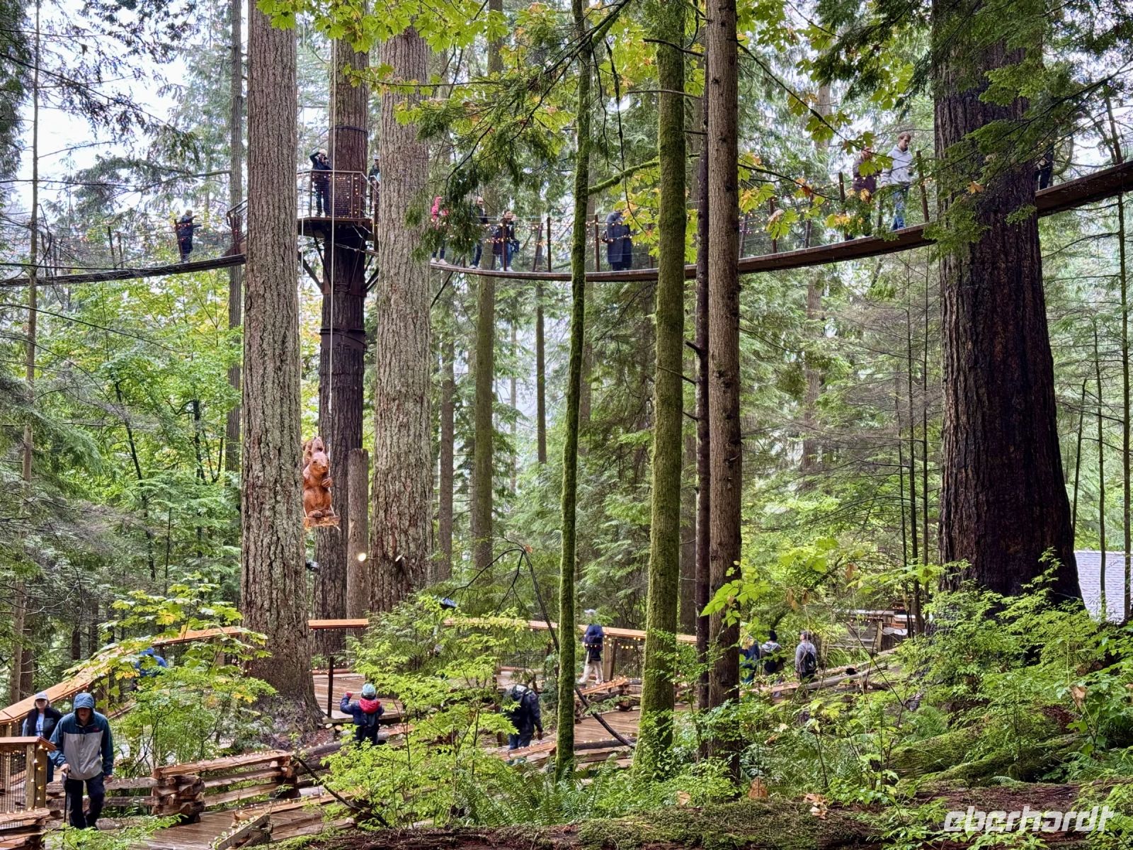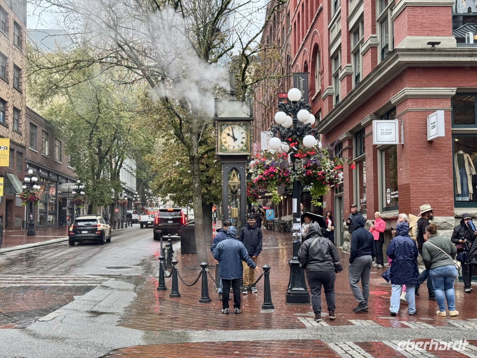 Ein bisschen freue ich mich innerlich darüber, dass es in Vancouver den ganzen Vormittag über regnet. So glauben mir meine Gäste wenigstens, dass die Großstadt am Pazifik als sehr verregnet bekannt ist. Auch die Sache mit dem Regenwald wirkt nun glaubhaft. Das heutige Wetter ist somit vor allem eines: authentisch. Wir haben zunächst noch zwei Programmpunkte der Stadtrundfahrt nachzuholen, bevor wir über die Lions Gate Bridge zum fakultativen Ausflug nach North Vancouver aufbrechen. Da wäre zum einen ein Abstecher in die Chinatown, wo wir uns das Millennium Gate anschauen, zum anderen der obligatorische Besuch im Altstadtviertel Gastown, wo wir mal wieder großes Glück haben und einen Parkplatz in der Nähe der berühmten Dampfuhr finden. So können wir aussteigen und der Westminster-Melodie lauschen. Die Uhr geht zwar falsch, aber der Dampf steigt zur richtigen Zeit auf. Ein kleines Mysterium. Am Olympic Cauldron setzen wir nach Absprache alle Gäste ab, die den Ausflug nicht gebucht haben. Sie haben nun für den Rest des Tages Freizeit und können z. B. den Canada Place, die Altstadt und die Downtown erkunden. Alle anderen fahren mit mir zur Capilano Suspension Bridge. Hier ist schon alles für den Herbst dekoriert. Der Nebel und die Wolken über dem Tal tragen ihren Teil zur mystischen Atmosphäre bei. Lichterketten und Kürbisse wecken die Vorfreude auf Halloween. Wir besuchen anschließend eine Aufzuchtstation für Lachse und lernen dabei einiges über deren Lebenszyklus. Ein kleiner Waldspaziergang zum Cleveland Dam bringt unseren Kreislauf in Schwung. Zum Abschluss wartet der Hausberg von Vancouver auf uns: der Grouse Mountain. Sehen tun wir allerdings oben erstmal gar nichts, denn der ganze Gipfel steckt heute in den Wolken. Dafür sehen die beiden Restaurants ganz einladend aus. Mein innerlicher Hobbit hat auch seit geraumer Zeit schon wieder Hunger. Die beiden Grizzlys Grinder und Coola hoffentlich nicht, denn die Zäune ihrer Anlage auf dem Berg sehen für mich immer so aus, als ob sie einem ausgewachsenen Braunbären in vollem Lauf wenig entgegenzusetzen hätten. Als Waisenkinder aufgefunden, leben sie aber schon viele Jahre ohne Zwischenfall auf dem Grouse Mountain. Während der Rückfahrt mit der Seilbahn zur Talstation werden wir schließlich für unsere Geduld belohnt und bekommen das herrliche Panorama von Vancouver, d. h. Stanley Park, Downtown und English Bay, zu Gesicht. Na also, hat sich der Ausflug zum Grouse Mountain doch noch gelohnt. Der Regen hat ja auch schon lange aufgehört, sodass meine Gäste vom Hotel aus die verbleibenden Stunden Freizeit ihres letzten Nachmittags/Abends in Kanada genießen können.