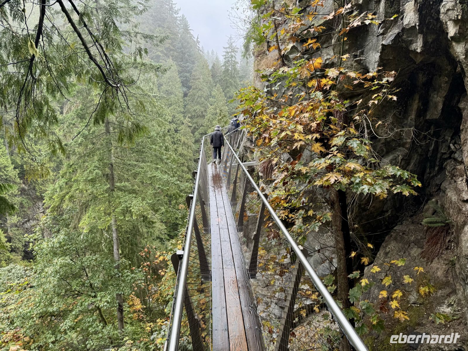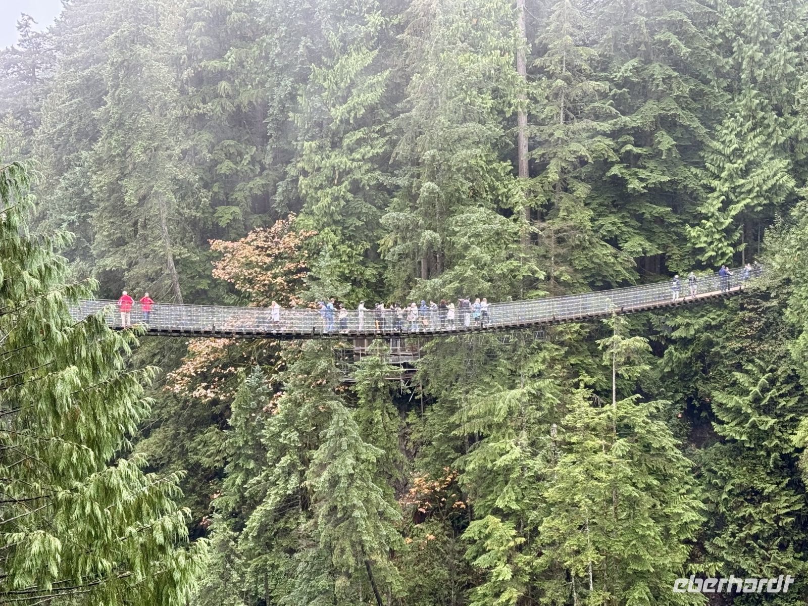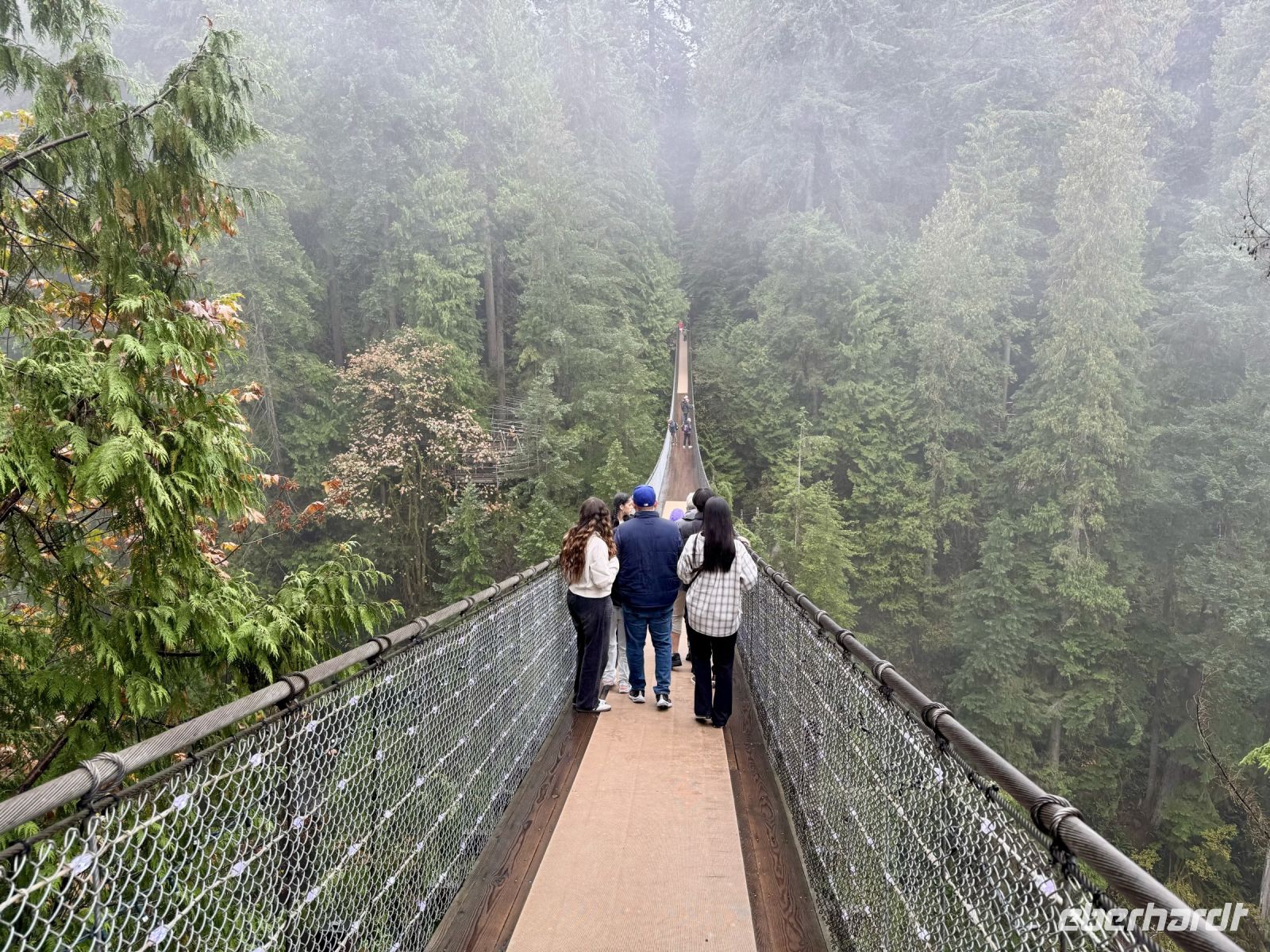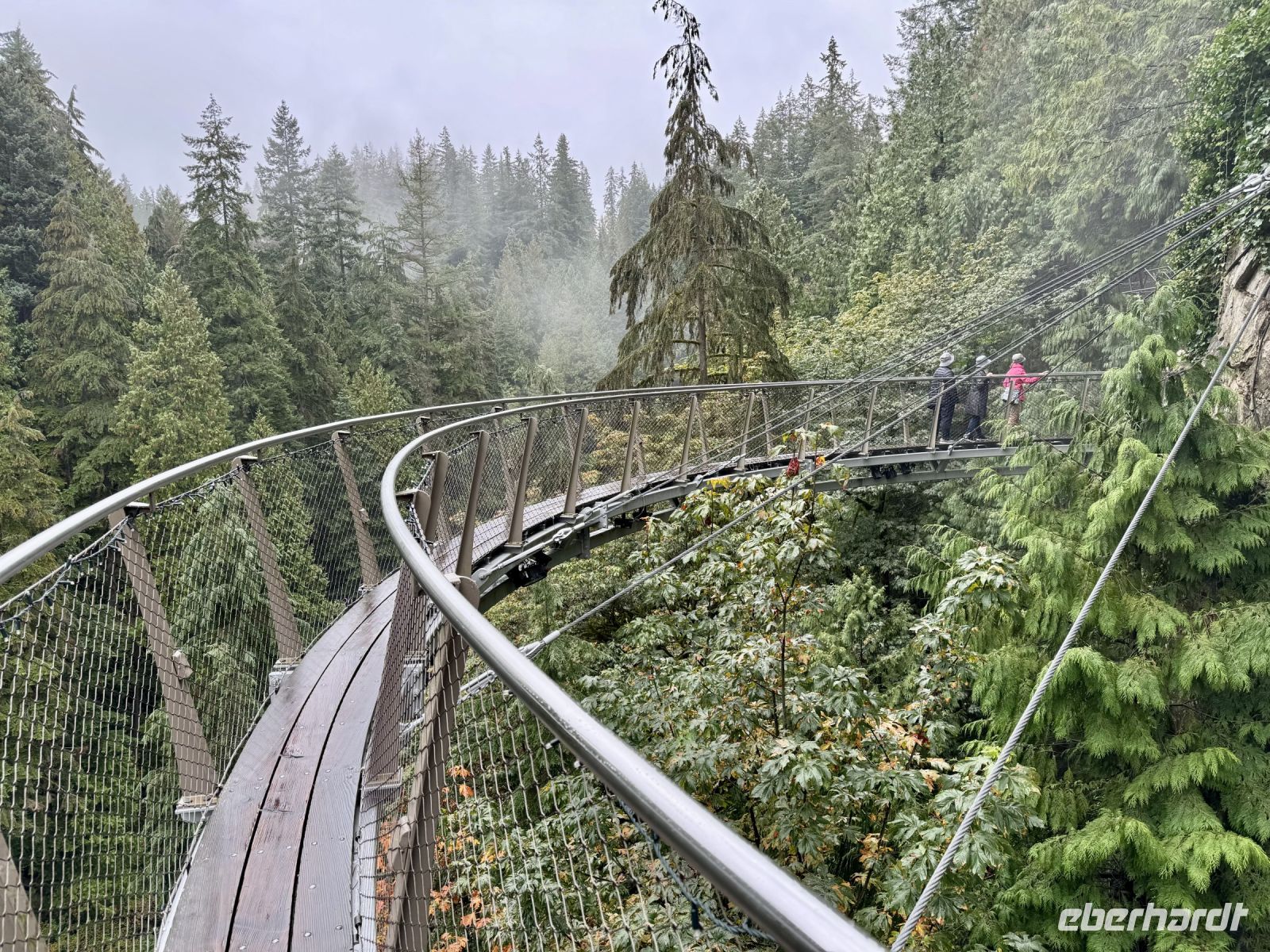Ein bisschen freue ich mich innerlich darüber, dass es in Vancouver den ganzen Vormittag über regnet. So glauben mir meine Gäste wenigstens, dass die Großstadt am Pazifik als sehr verregnet bekannt ist. Auch die Sache mit dem Regenwald wirkt nun glaubhaft. Das heutige Wetter ist somit vor allem eines: authentisch. Wir haben zunächst noch zwei Programmpunkte der Stadtrundfahrt nachzuholen, bevor wir über die Lions Gate Bridge zum fakultativen Ausflug nach North Vancouver aufbrechen. Da wäre zum einen ein Abstecher in die Chinatown, wo wir uns das Millennium Gate anschauen, zum anderen der obligatorische Besuch im Altstadtviertel Gastown, wo wir mal wieder großes Glück haben und einen Parkplatz in der Nähe der berühmten Dampfuhr finden. So können wir aussteigen und der Westminster-Melodie lauschen. Die Uhr geht zwar falsch, aber der Dampf steigt zur richtigen Zeit auf. Ein kleines Mysterium. Am Olympic Cauldron setzen wir nach Absprache alle Gäste ab, die den Ausflug nicht gebucht haben. Sie haben nun für den Rest des Tages Freizeit und können z. B. den Canada Place, die Altstadt und die Downtown erkunden. Alle anderen fahren mit mir zur Capilano Suspension Bridge. Hier ist schon alles für den Herbst dekoriert. Der Nebel und die Wolken über dem Tal tragen ihren Teil zur mystischen Atmosphäre bei. Lichterketten und Kürbisse wecken die Vorfreude auf Halloween. Wir besuchen anschließend eine Aufzuchtstation für Lachse und lernen dabei einiges über deren Lebenszyklus. Ein kleiner Waldspaziergang zum Cleveland Dam bringt unseren Kreislauf in Schwung. Zum Abschluss wartet der Hausberg von Vancouver auf uns: der Grouse Mountain. Sehen tun wir allerdings oben erstmal gar nichts, denn der ganze Gipfel steckt heute in den Wolken. Dafür sehen die beiden Restaurants ganz einladend aus. Mein innerlicher Hobbit hat auch seit geraumer Zeit schon wieder Hunger. Die beiden Grizzlys Grinder und Coola hoffentlich nicht, denn die Zäune ihrer Anlage auf dem Berg sehen für mich immer so aus, als ob sie einem ausgewachsenen Braunbären in vollem Lauf wenig entgegenzusetzen hätten. Als Waisenkinder aufgefunden, leben sie aber schon viele Jahre ohne Zwischenfall auf dem Grouse Mountain. Während der Rückfahrt mit der Seilbahn zur Talstation werden wir schließlich für unsere Geduld belohnt und bekommen das herrliche Panorama von Vancouver, d. h. Stanley Park, Downtown und English Bay, zu Gesicht. Na also, hat sich der Ausflug zum Grouse Mountain doch noch gelohnt. Der Regen hat ja auch schon lange aufgehört, sodass meine Gäste vom Hotel aus die verbleibenden Stunden Freizeit ihres letzten Nachmittags/Abends in Kanada genießen können.