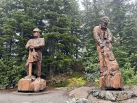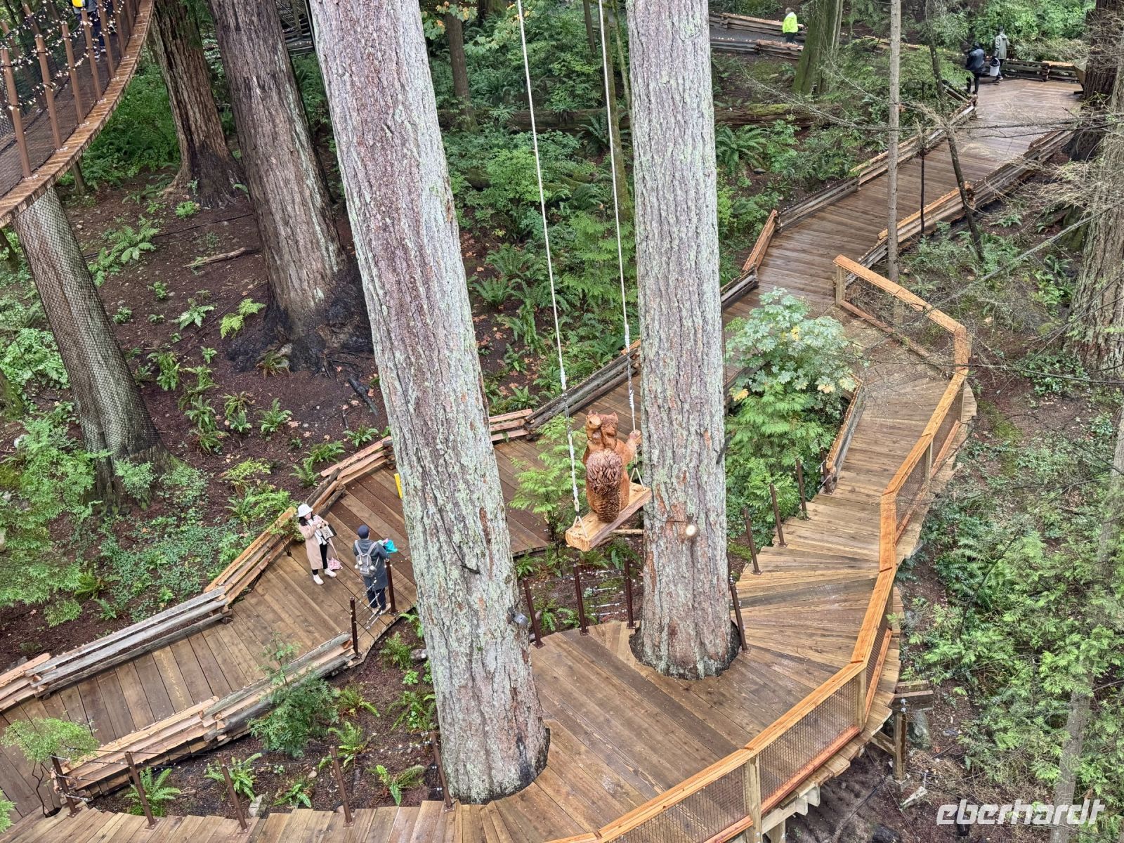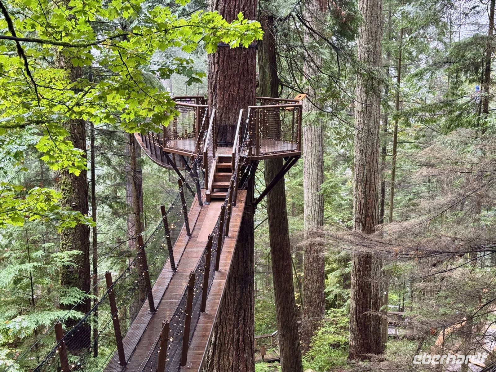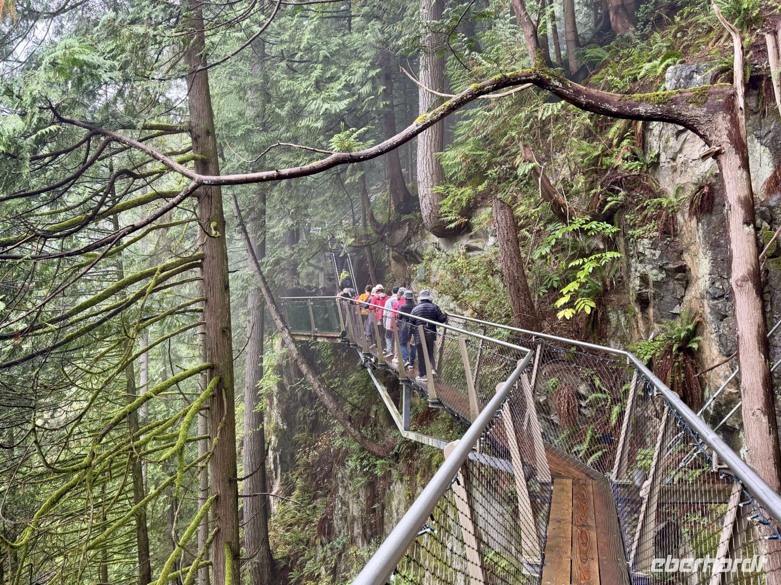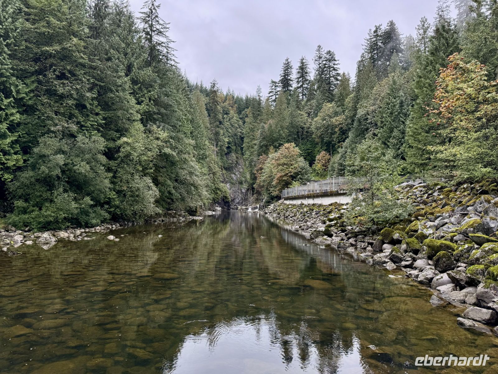 Ein bisschen freue ich mich innerlich darüber, dass es in Vancouver den ganzen Vormittag über regnet. So glauben mir meine Gäste wenigstens, dass die Großstadt am Pazifik als sehr verregnet bekannt ist. Auch die Sache mit dem Regenwald wirkt nun glaubhaft. Das heutige Wetter ist somit vor allem eines: authentisch. Wir haben zunächst noch zwei Programmpunkte der Stadtrundfahrt nachzuholen, bevor wir über die Lions Gate Bridge zum fakultativen Ausflug nach North Vancouver aufbrechen. Da wäre zum einen ein Abstecher in die Chinatown, wo wir uns das Millennium Gate anschauen, zum anderen der obligatorische Besuch im Altstadtviertel Gastown, wo wir mal wieder großes Glück haben und einen Parkplatz in der Nähe der berühmten Dampfuhr finden. So können wir aussteigen und der Westminster-Melodie lauschen. Die Uhr geht zwar falsch, aber der Dampf steigt zur richtigen Zeit auf. Ein kleines Mysterium. Am Olympic Cauldron setzen wir nach Absprache alle Gäste ab, die den Ausflug nicht gebucht haben. Sie haben nun für den Rest des Tages Freizeit und können z. B. den Canada Place, die Altstadt und die Downtown erkunden. Alle anderen fahren mit mir zur Capilano Suspension Bridge. Hier ist schon alles für den Herbst dekoriert. Der Nebel und die Wolken über dem Tal tragen ihren Teil zur mystischen Atmosphäre bei. Lichterketten und Kürbisse wecken die Vorfreude auf Halloween. Wir besuchen anschließend eine Aufzuchtstation für Lachse und lernen dabei einiges über deren Lebenszyklus. Ein kleiner Waldspaziergang zum Cleveland Dam bringt unseren Kreislauf in Schwung. Zum Abschluss wartet der Hausberg von Vancouver auf uns: der Grouse Mountain. Sehen tun wir allerdings oben erstmal gar nichts, denn der ganze Gipfel steckt heute in den Wolken. Dafür sehen die beiden Restaurants ganz einladend aus. Mein innerlicher Hobbit hat auch seit geraumer Zeit schon wieder Hunger. Die beiden Grizzlys Grinder und Coola hoffentlich nicht, denn die Zäune ihrer Anlage auf dem Berg sehen für mich immer so aus, als ob sie einem ausgewachsenen Braunbären in vollem Lauf wenig entgegenzusetzen hätten. Als Waisenkinder aufgefunden, leben sie aber schon viele Jahre ohne Zwischenfall auf dem Grouse Mountain. Während der Rückfahrt mit der Seilbahn zur Talstation werden wir schließlich für unsere Geduld belohnt und bekommen das herrliche Panorama von Vancouver, d. h. Stanley Park, Downtown und English Bay, zu Gesicht. Na also, hat sich der Ausflug zum Grouse Mountain doch noch gelohnt. Der Regen hat ja auch schon lange aufgehört, sodass meine Gäste vom Hotel aus die verbleibenden Stunden Freizeit ihres letzten Nachmittags/Abends in Kanada genießen können.