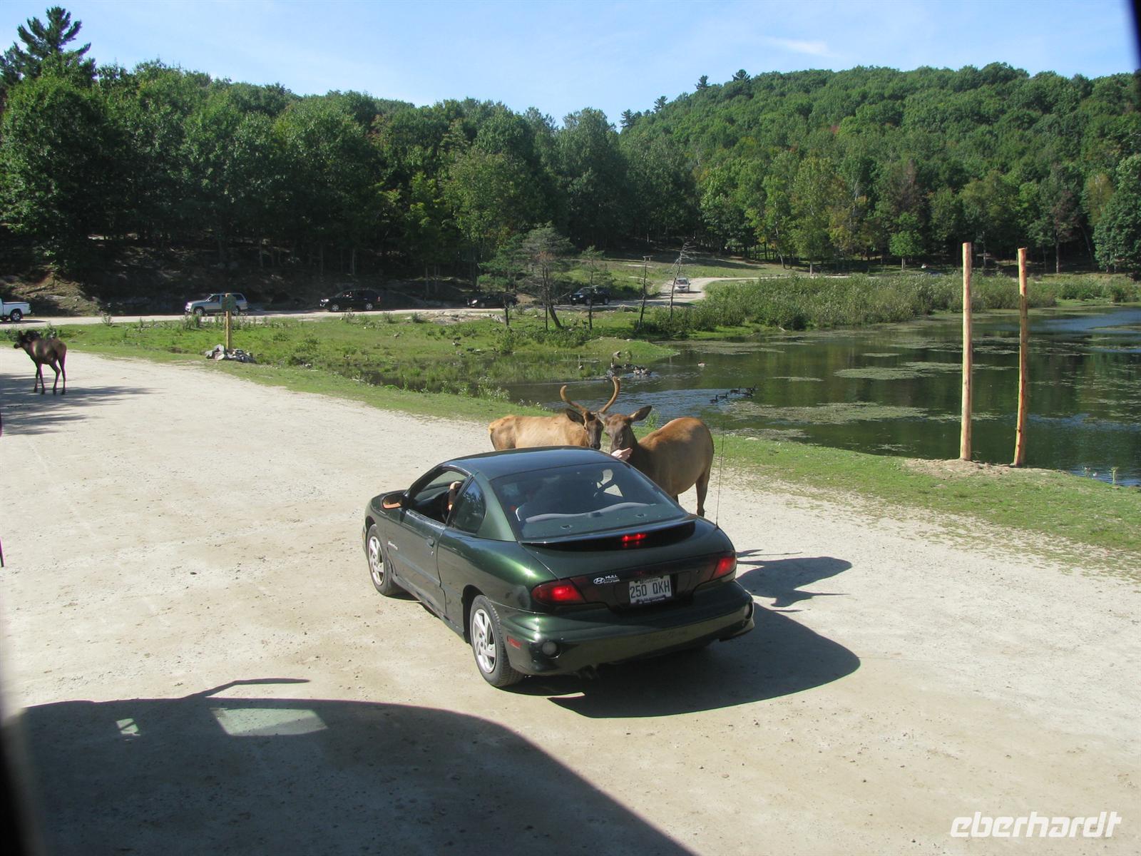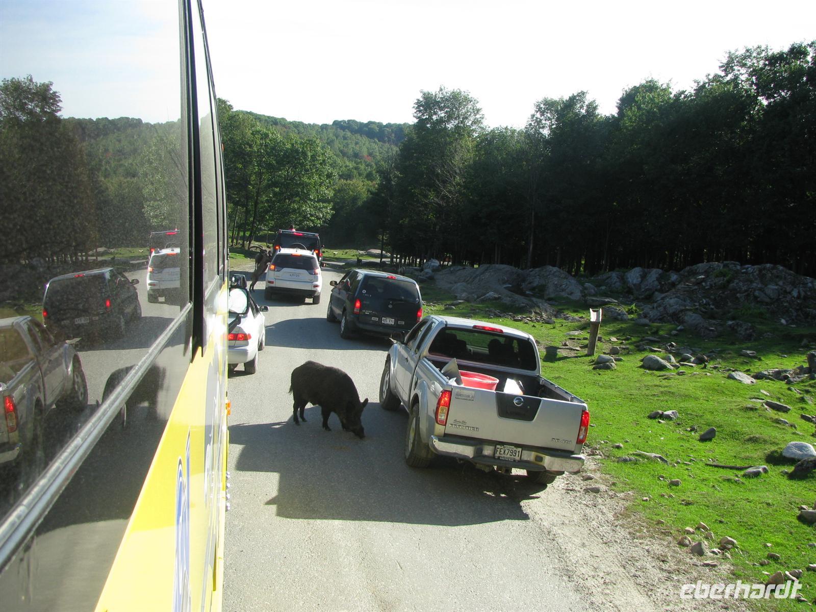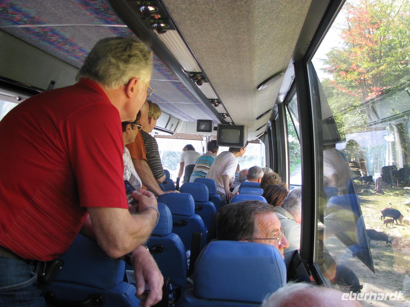 Heute packten wir wieder unsere Koffer und machten uns auf den Weg nach Ottawa. Um die Mittagszeit erreichten wir das Luxushotel Montebello, welches ein einstiges Eisenbahnhotel gewesen ist. Uns erwartete ein reichhaltiges Mittagsbuffet, welches wir in einem wunderschönen rustikalen Ambiente einnahmen. Nicht weit entfernt befand sich der Omega-Tierpark. Mit dem Bus fuhren wir durch den großen Park und konnten viele Tiere beobachten. Brigitta organisierte einige Möhren, mit denen wir die hungrigen Wapiti-Hirsche füttern konnten. Doch auch andere Tiere wie Wildschweine, Waschbären, Rehe, Wölfe und Bären waren zu sehen. Phil öffnete sogar die Fenster, damit wir besser fotografieren konnten.