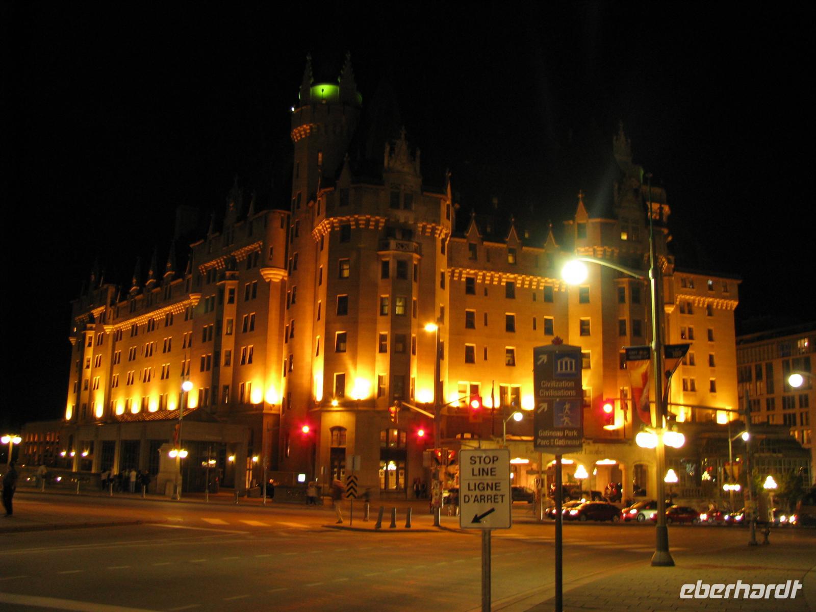 Gegen Abend erreichten wir Ottawa. Bevor wir das Hotel erreichten, unternahm Brigitta mit uns bereits eine erste kleine Stadtrundfahrt. Sie freute sich sehr, dass sie in ihrer Heimatprovinz Ontario nun endlich selbst die Führungen übernehmen durfte. Nach dem Zimmerbezug im zentralen Hotel spazierte ich mit einigen Gästen durch die Stadt. Wir sahen uns die Lobby des Eisenbahnhotels Chateau Laurier an und kehrten in einem italienischen Restaurant in der Fußgängerpassage ein. Gerade als wir dort gemütlich bei einem Bier saßen, fing eine Dudelsackkapelle an zu spielen ? die Feuerwehrkapelle aus Montreal. Natürlich waren wir sehr geehrt über diese monumentale Begrüßung. J Zur Musik traten wir den Rückweg an und legten einen Fotostopp am Regierungsgebäude ein.