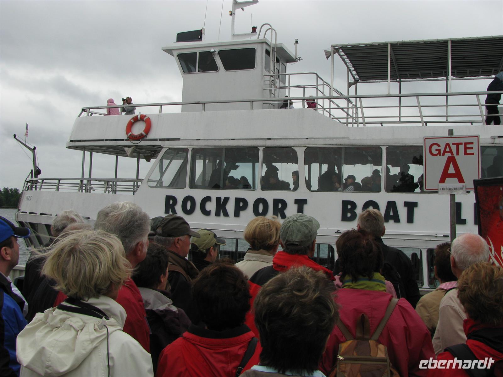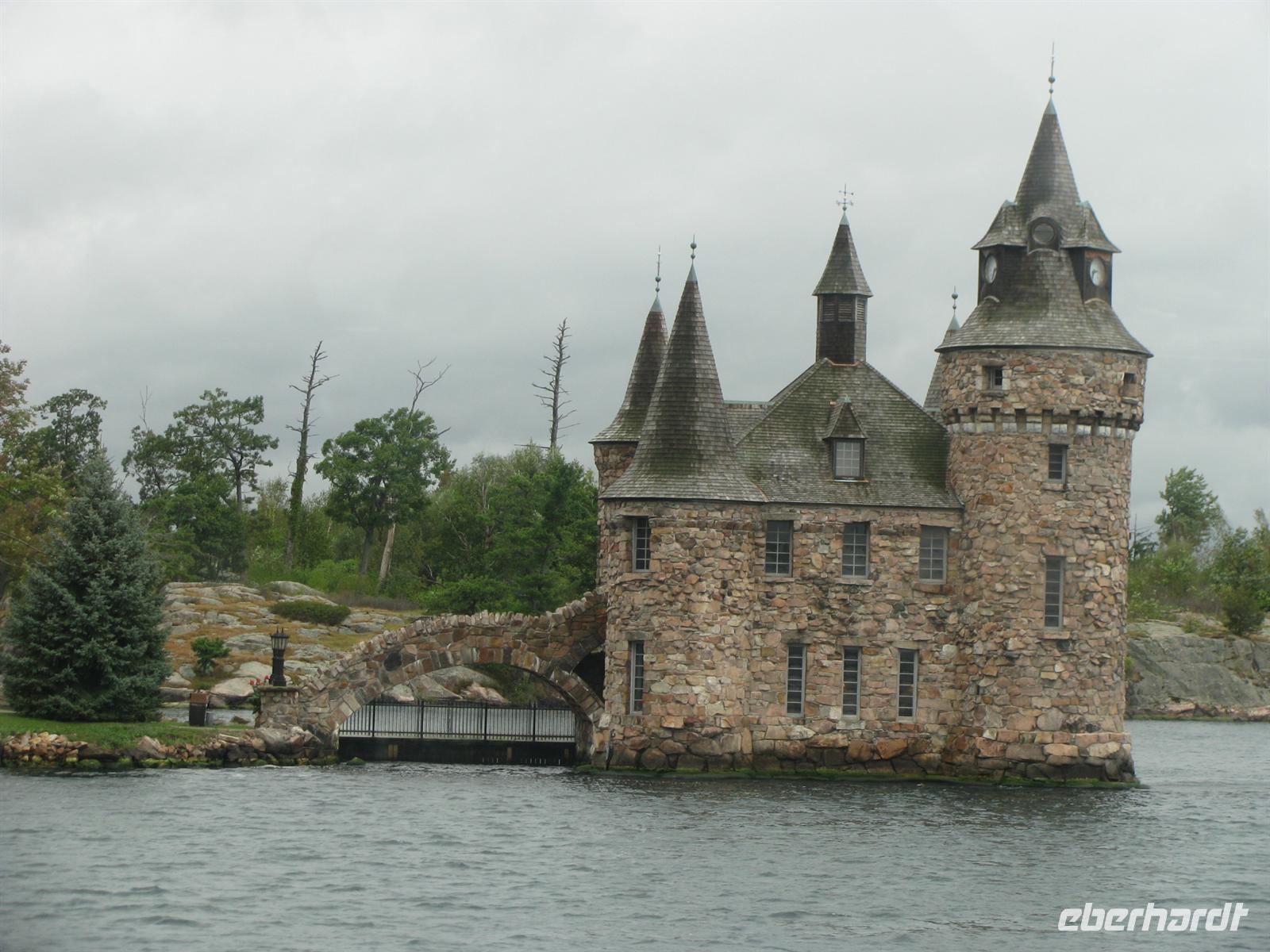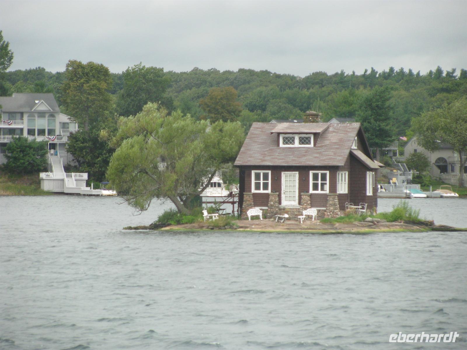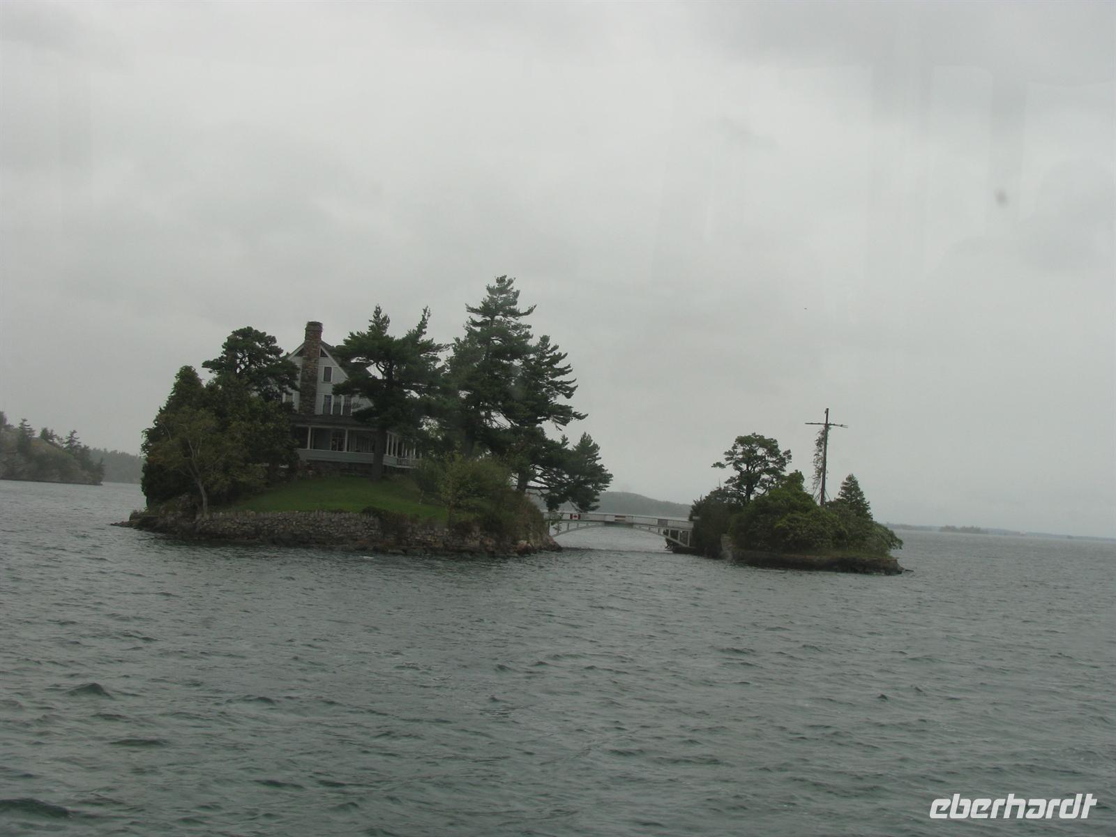 Nicht weit entfernt befindet sich Rockport, ein Hafenstädtchen, von wo aus wir eine Bootsfahrt zu den 1000 Inseln unternahmen. Vorher nahmen wir dort ein Mittagessen mit Blick auf die See ein. Tatsächlich sind es aber weit mehr als 1000 Inseln. Zu den spektakulärsten gehören unter anderem die ?Grenzinsel?. Ein Italiener besitzt eine größere und eine kleinere Insel, die beide durch eine Brücke verbunden sind. Erstere repräsentiert selbstverständlich Kanada und letztere die USA. Hauptfotomotiv ist das Schloss von Mr. Bould. Eine Nachbarinsel ist die sogenannte Schwiegermutterinsel, eine Insel so groß, dass gerade ein Haus passt. Angeblich hat er die Schwiegermutter im Frühling dorthin gebracht und im Herbst abgeholt ? sie konnte nicht schwimmen.