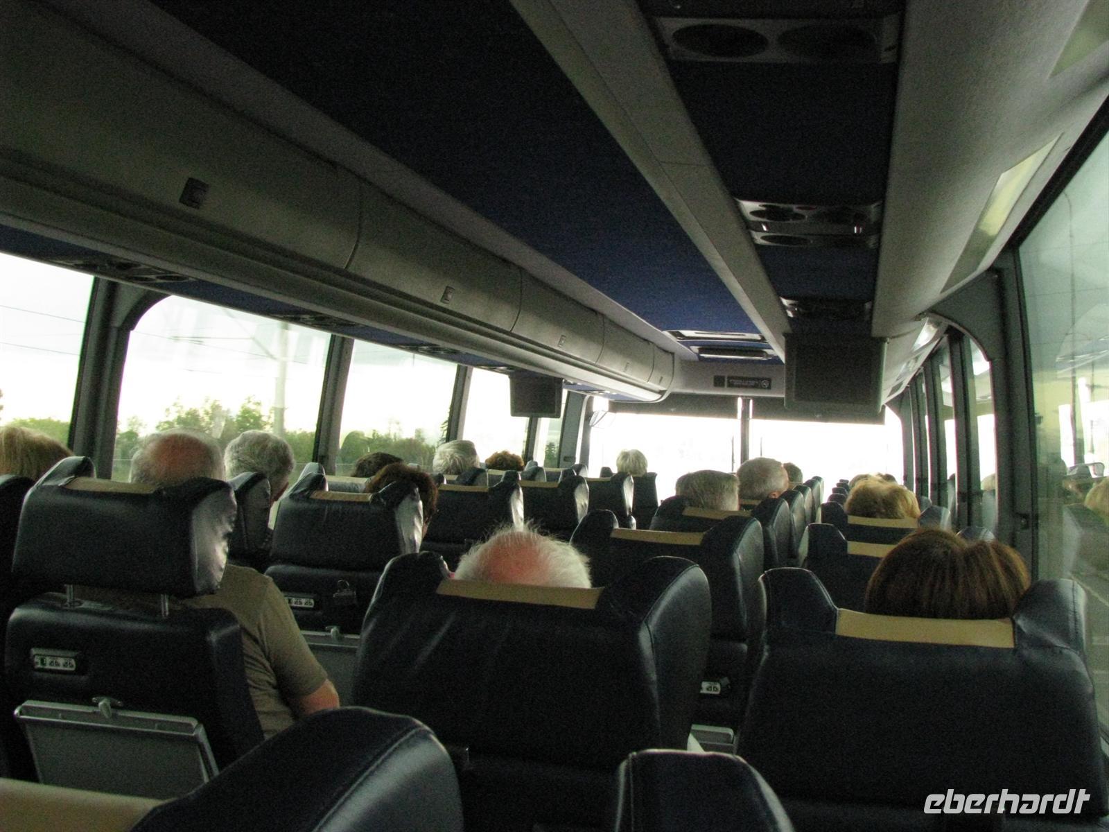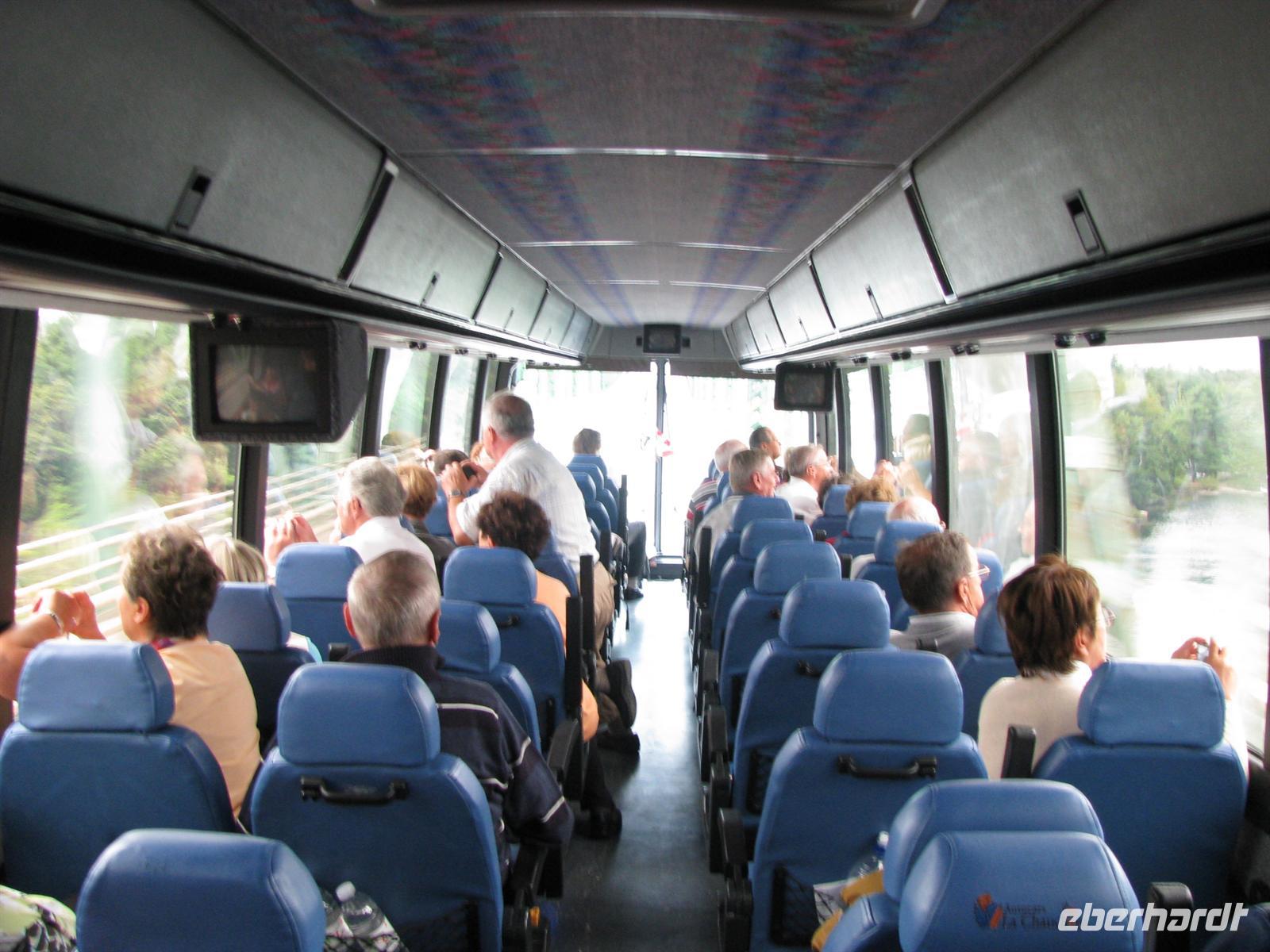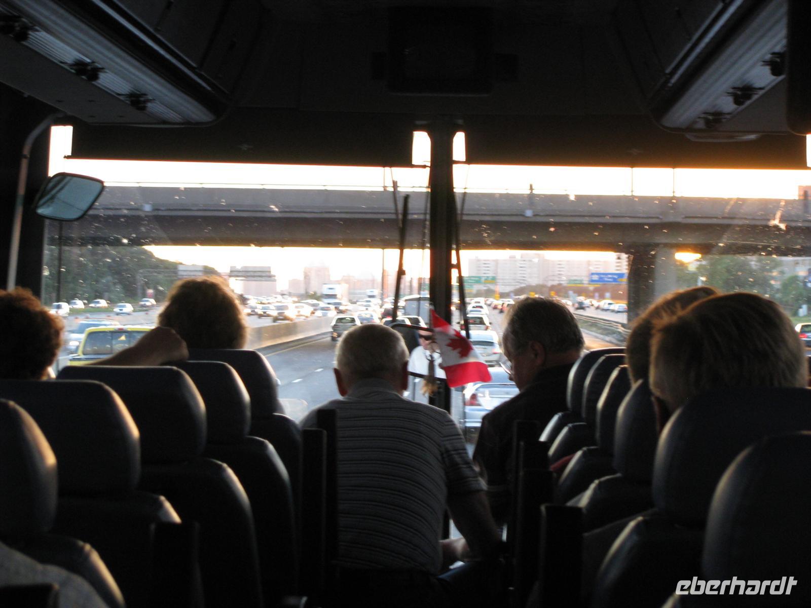 Der große Tag war endlich gekommen und am Flughafen Dresden traf der Großteil der Gruppe zusammen. Einige waren bequem per Haustür-Transfer-Service abgeholt wurden und andere reisten individuell an. Nach einer kurzen Vorstellung checkten wir gemeinsam am Automaten ein und gaben unsere Koffer auf. Im Restaurant Chili nahmen wir ein reichhaltiges Frühstück ein, bevor wir uns an Bord des Flugzeugs nach Frankfurt begaben. Am Gate zum Weiterflug wurde unsere Reisegruppe von 24 Personen komplett, als wir auf die Gäste trafen, die ab Leipzig geflogen. Auf dem siebeneinhalbstündigen Flug nach Montreal half ich den Gästen beim Ausfüllen der Einreisekarten. Endlich angekommen, bekamen wir sechs Stunden Zeit geschenkt, waren also theoretisch nur anderthalb Stunden unterwegs. Am Ausgang wurden wir bereits von Brigitta, unserer örtlichen Reiseleiterin begrüßt. Sie kam ursprünglich aus Hamburg, lebte aber schon seit mehr als 50 Jahren in ihrer Wahlheimat Kanada. Wir marschierten zu unserem Rundreisebus und wurden von Phil, dem Busfahrer begrüßt.