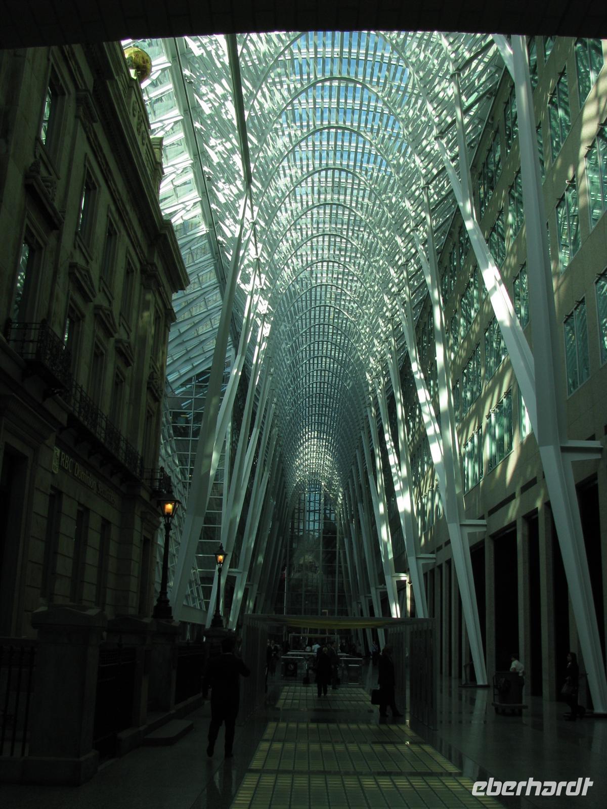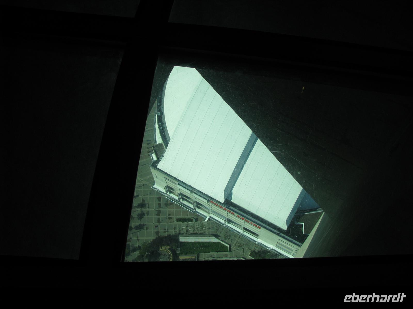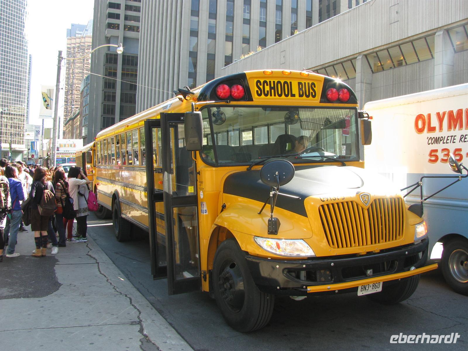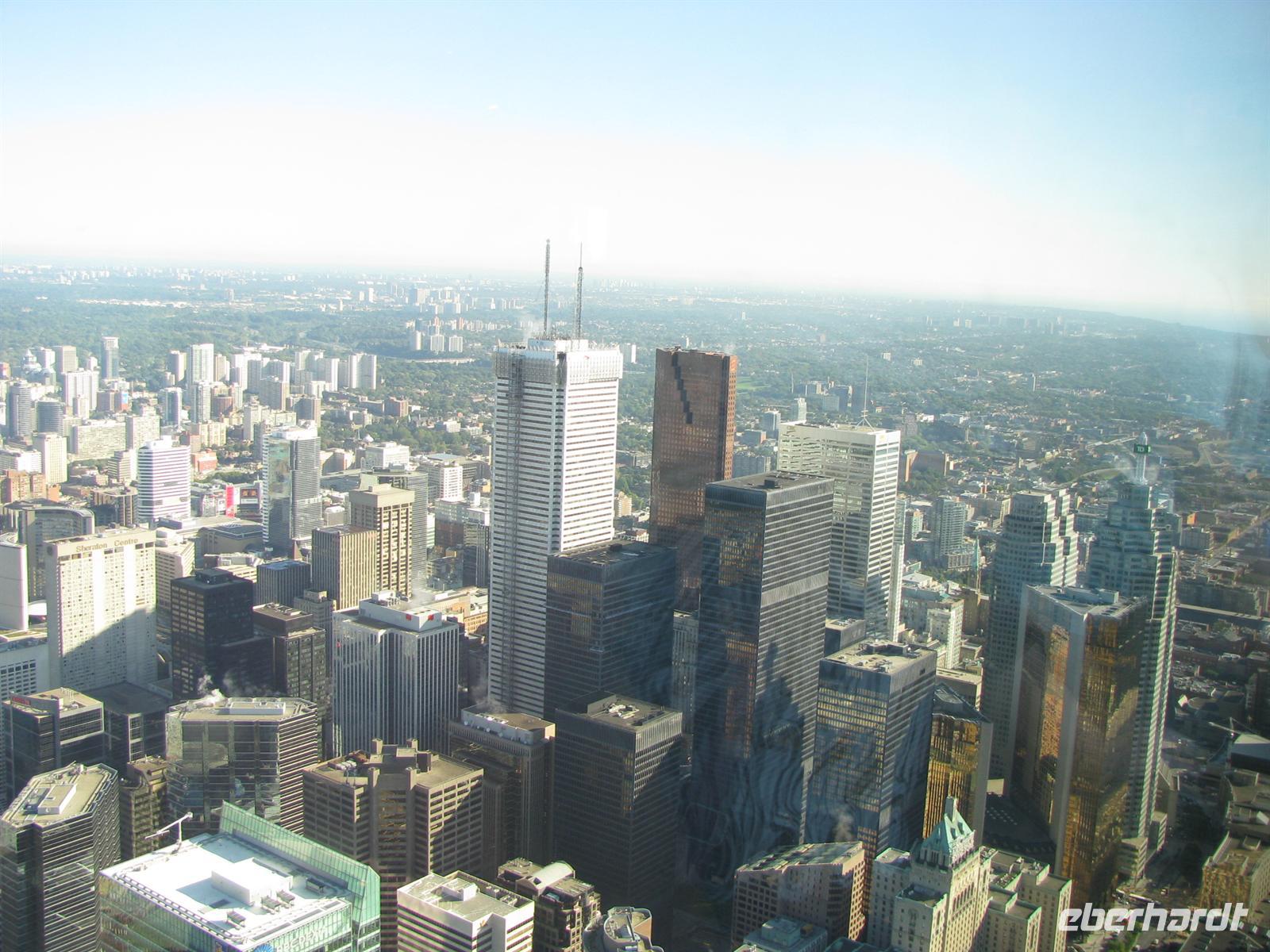 Etwas gewöhnungsbedürftig war das Plastikgeschirr und -besteck zum Frühstück. Aufgrund der zentralen Lage kann sich das Hotel keine Küche leisten, deshalb wurde auf Einwegartikel zurückgegriffen. Dies tat jedoch dem Frühstück keinen Abbruch, denn es war reichhaltig und sehr schmackhaft. Wir begannen die Stadtrundfahrt durch die Innenstadt. Brigitta zeigte uns das Eaton Centre, ein großes Einkaufszentrum. Nur kurze Zeit später standen wir bereits vor dem zweithöchsten freistehenden Gebäude der Welt: dem CN-Tower. Wir fuhren mit einem gläsernen Fahrstuhl auf dreihundert Meter Höhe. Besonderes Highlight war die Glasplattform, von der aus man geradewegs nach unten schauen konnte. Mutig wagten sich viele auf die Fläche und machten Fotos. Anschließend fuhren wir weiter, vorbei an der City Hall und besichtigten das Parlamentsgebäude.