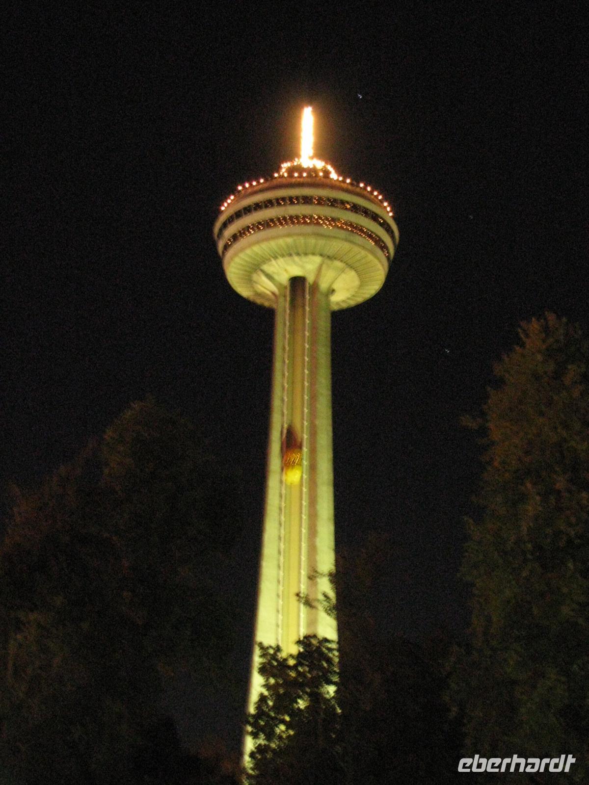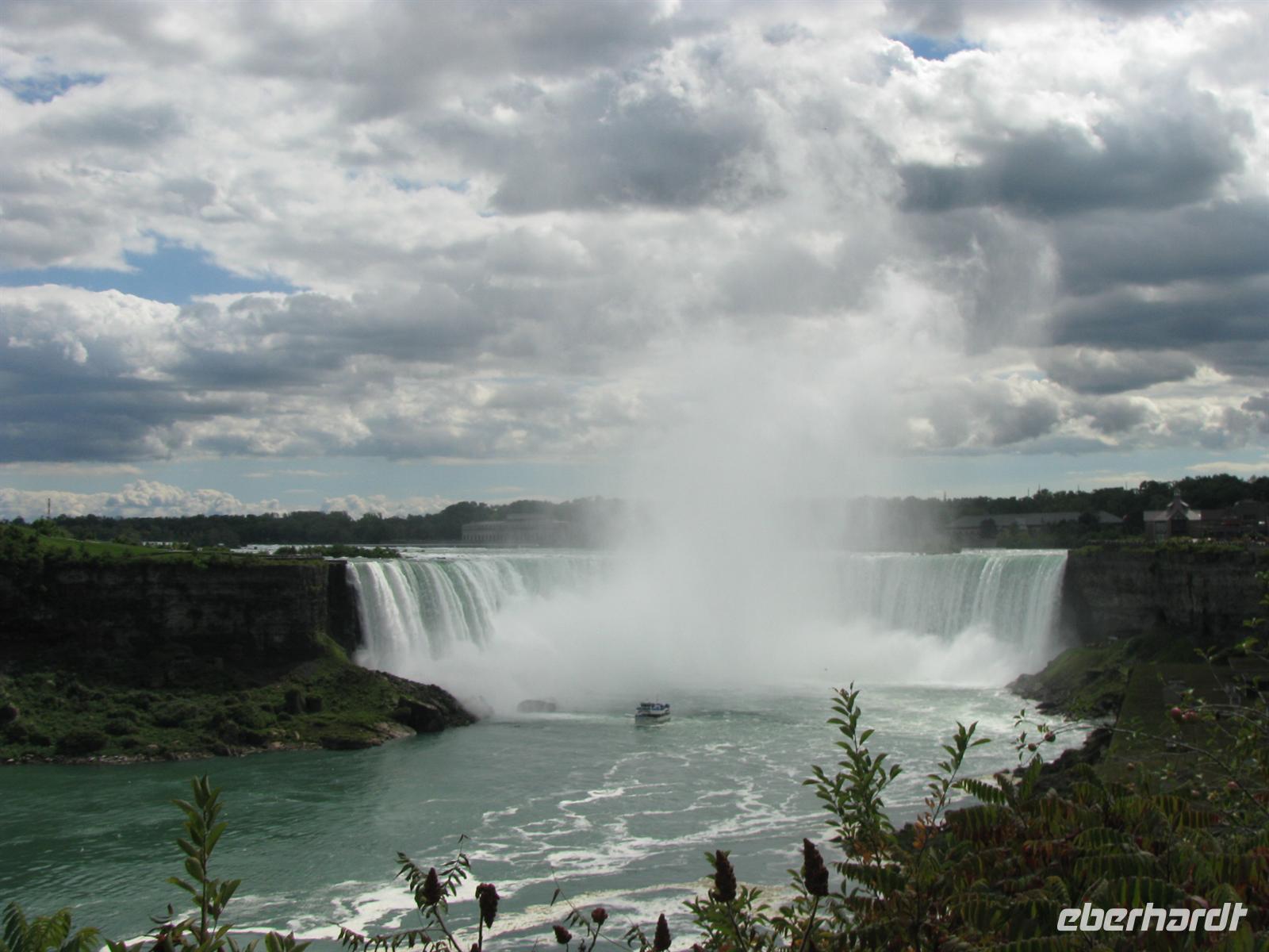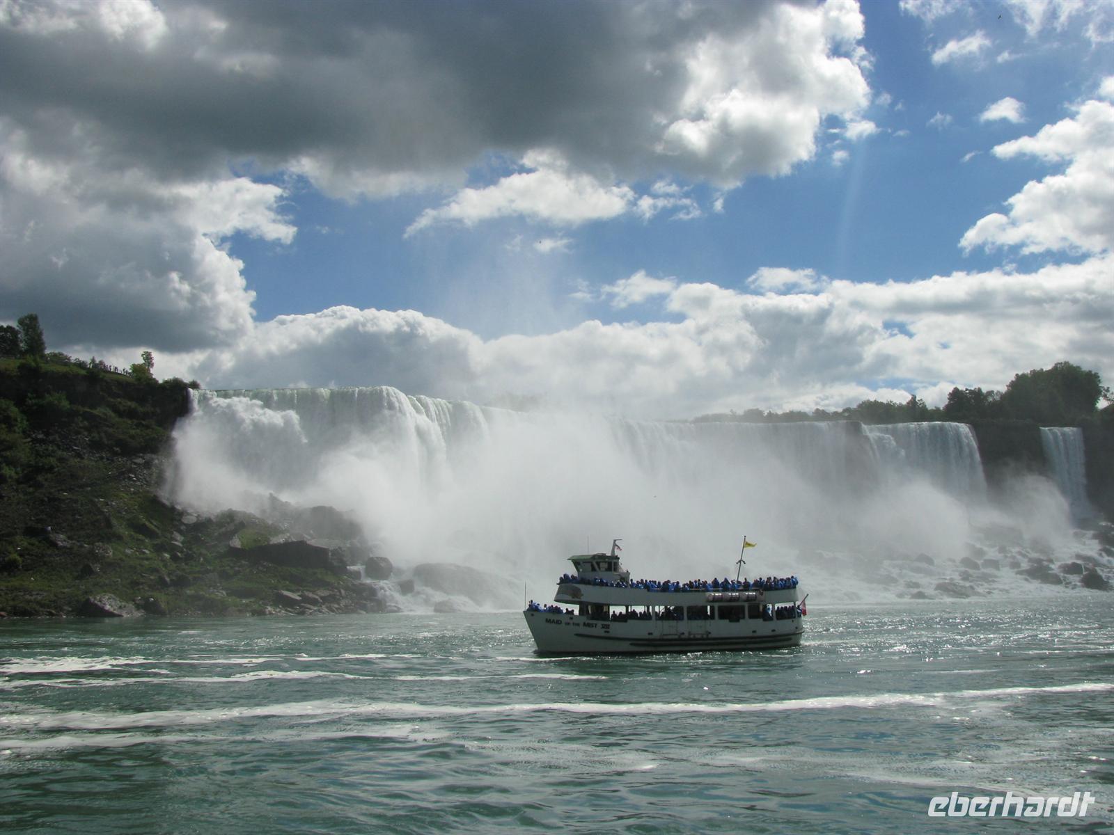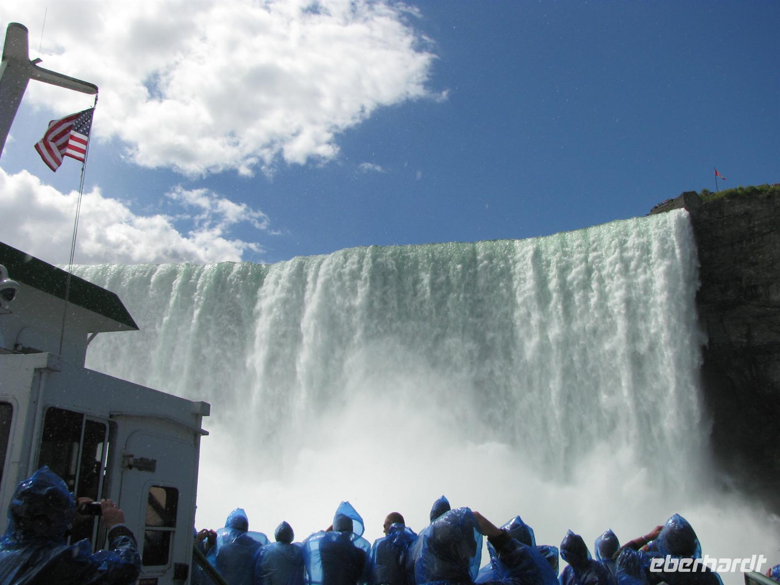 Etwas später erreichten wir die Niagara-Fälle. Wir wurden ausgestattet mit hübschen blauen Regencapes, die eher an Mülltüten erinnerten und bestiegen das Boot "Maid of the Mist". Da wir sehr schnell an Bord waren, sicherten wir uns gute Plätze auf dem Oberdeck. Die Kameras mussten gut verstaut werden, damit diese von der Gischt nicht kaputt gingen. Es war gewaltig, wie wir direkt bis an das kanadische "Hufeisen" fuhren und vom Wasser nassgespritzt wurden. Nach diesem unglaublichen Erlebnis spazierten wir entlang der Promenade an den amerikanischen Fällen vorbei bis zu den kanadischen Fällen. Direkt dort, wo das Wasser in die Tiefe stürzte, standen wir und ließen uns von dem Naturspektakel faszinieren. Später fuhren wir ins Hotel, das "The Oaks overlooking the Falls", welches in unmittelbarer Nähe zu den Fällen lag. Nach kurzem Frischmachen trafen wir uns wieder, um zum Abendessen zu fahren. Das Besondere: Das Abendessen fand im Skylon Tower, einem Aussichtspunkt mit Blick auf die Niagara-Fälle, statt. Während dem köstlichen Essen und einem Gläschen Wein überblickten wir die Fälle. Nun mussten wir uns auch von Reiseleiterin Brigitta und Busfahrer Phil verabschieden. Ich überreichte den beiden im Namen der Gruppe das Trinkgeld. Nach dem Essen unternahm ich mit einigen Gästen einen Spaziergang zu den beleuchteten Fällen, die abwechselnd in weißem, roten und grünen Licht erstrahlten. Erst spät erreichten wir das Hotel, wo wir unsere Koffer packen mussten.