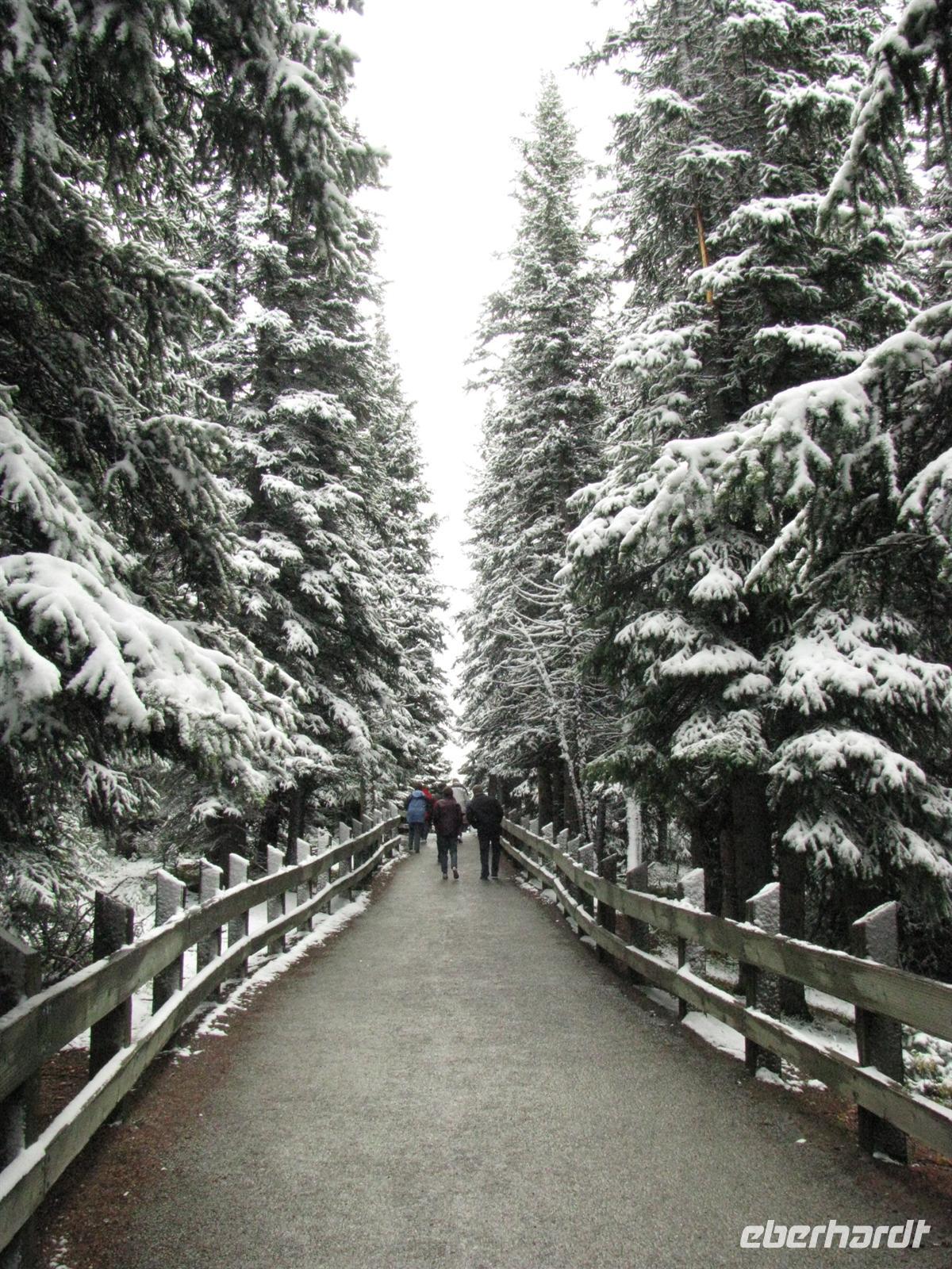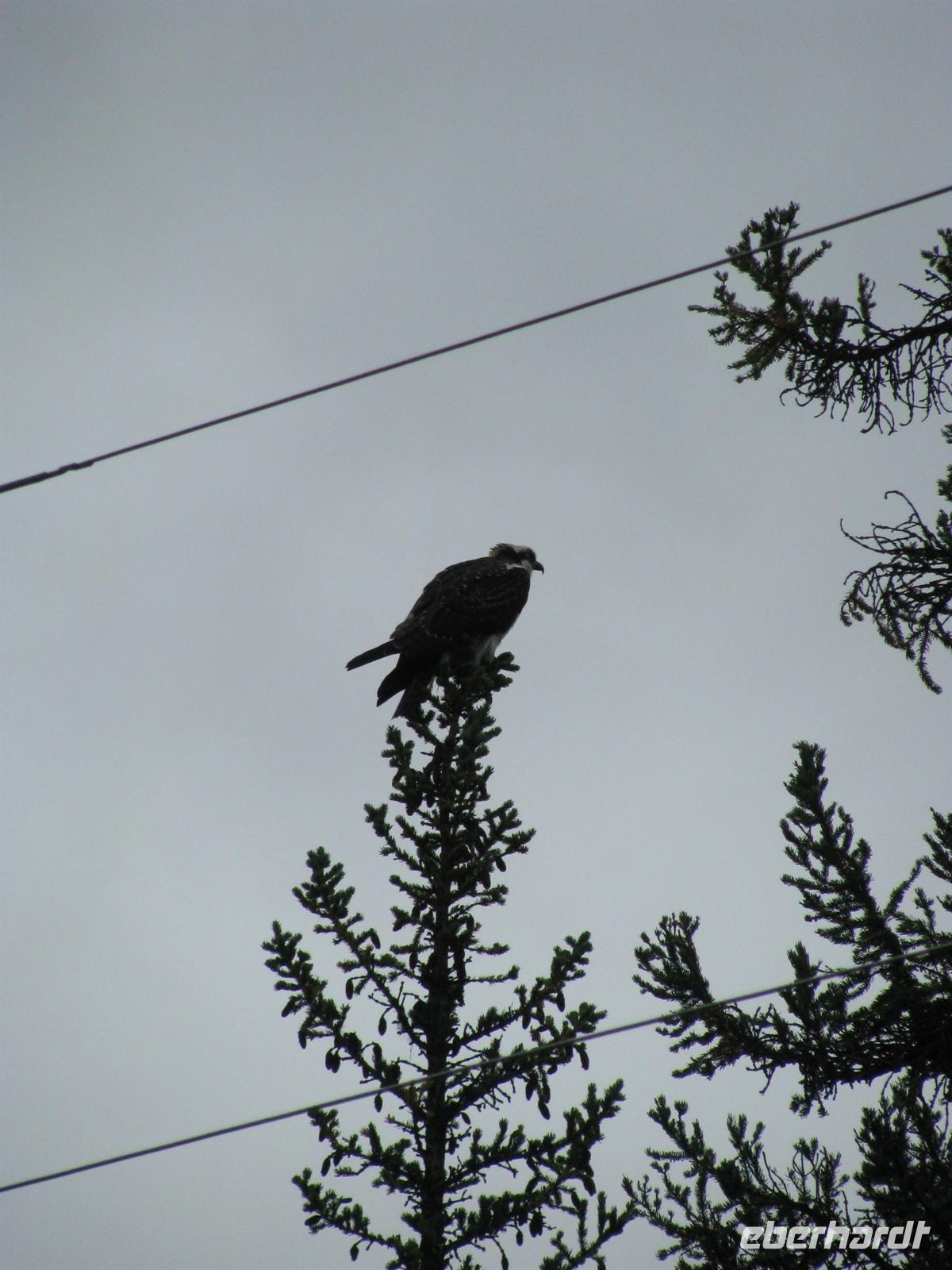 Das Frühstück war eines der besten der ganzen Reise: Wir bekamen Toastbrot, das je zur Hälfte Schwarz- und Weißbrot war. Wir erkundeten am Morgen die beiden Regenwaldgebiete der Insel. Auf Holzwegen liefen wir durch den "Dschungel". Es war sehr interessant, Regenwald in solch nördlichen Gebieten zu begegnen. Es war nicht heiß wie in den Tropen, sondern angenehm kühl. Besonders interessant waren die großen Mammutbäume, die entweder aufrecht standen oder bereits seit zig Jahren umgekippt waren. Die Bäume waren sogar um einiges größer als der Schiefe Turm von Pisa. Gleich auf der anderen Straßenseite befand sich ein weiterer Trail, auf dem man einen ca. einstündigen Spaziergang durch den Regenwald unternehmen konnte. Anschließend fuhren wir zum Long Beach und spazierten dem Pazifik entgegen. Drei besonders mutige Gäste gingen sogar ins kalte Nass. Wir übrigen begnügten uns mit einem kurzen "Hand ins Wasser halten". Besonders viele Muscheln gab es nicht, dennoch nahmen wir das ein oder andere Stück mit. Später fuhren wir nach Tofino, ein hübsches Künstlerstädtchen. Wir besuchten das Atelier "Eagle Aerie Gallery" mit wunderschöner Indianerkunst. Nach einer Stunde Freizeit fuhren wir wieder in die Lodge zurück. Abendessen gab es heute direkt in der Lodge. Wir hatten die Wahl zwischen Lachs und Steak, wie so oft schon. Das Essen war hervorragend.