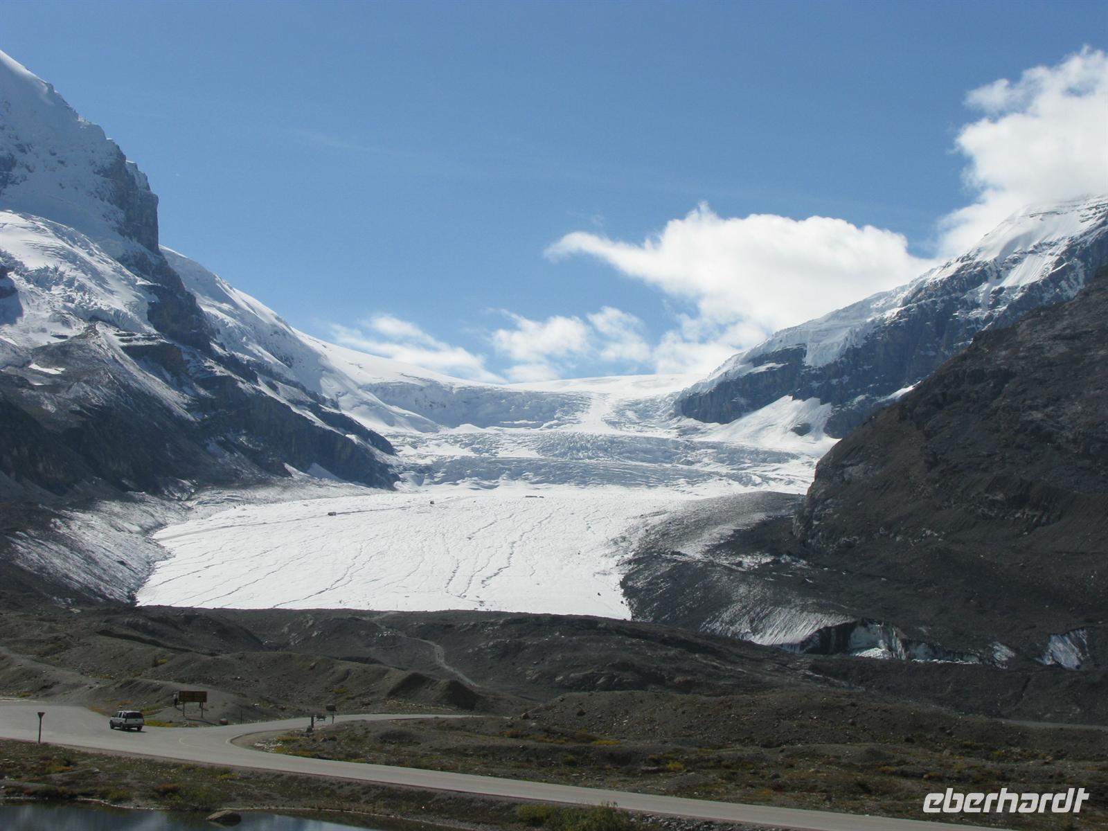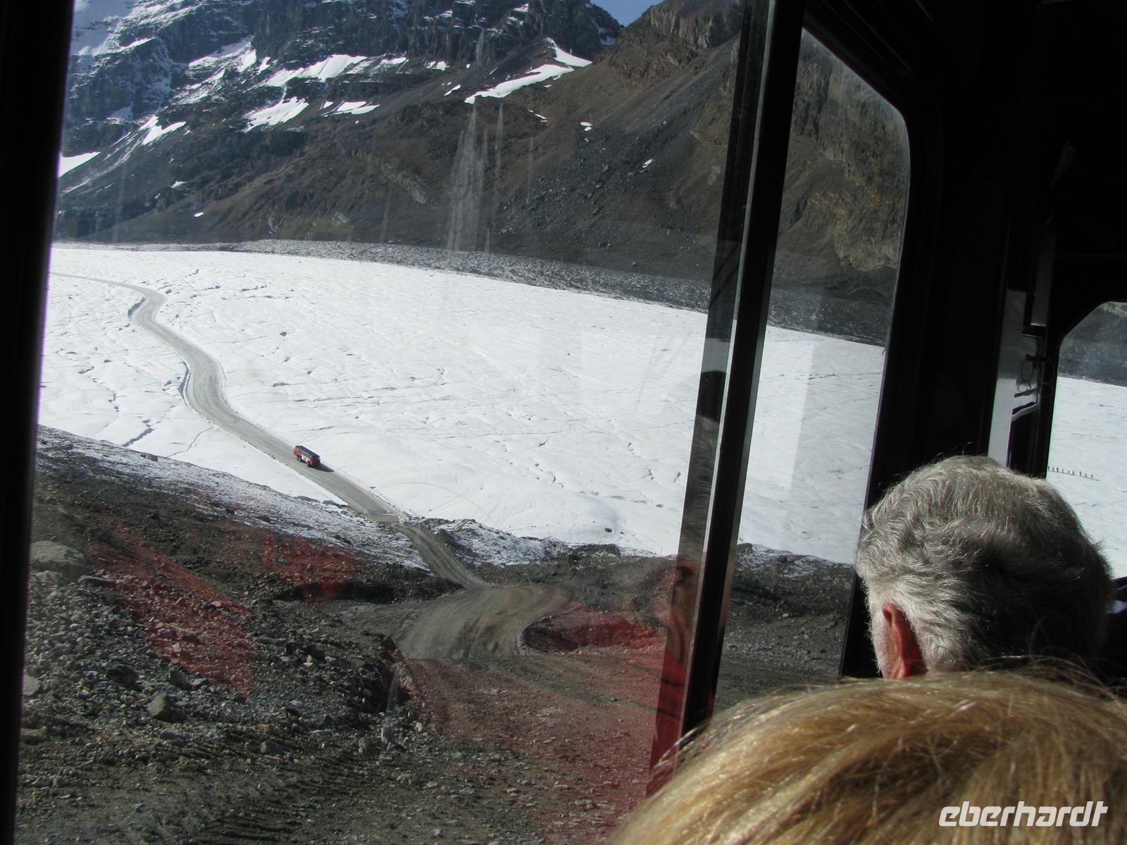 Heute hieß es wieder Koffer packen und weiter ging die Reise! Während der Fahrt auf dem Highway entdeckten wir sogar Wapitis! Wunderschöne Landschaft zog an uns vorüber und unterwegs hielten wir für Fotos am Bow Lake oder am Two Jack Lake. Nach dem Mittag erreichten wir das Besucherzentrum des Icefield Parkway. Dies ist ein Gletscher, den die Gäste fakultativ besuchen konnten. Der Großteil hatte sich auch dafür entschieden und so fuhren wir mit einem Transferbus bis zum Rand der Gletscherzunge. Anschließend stiegen wir um in ein Schneemobil, mit dem wir über den Gletscher fuhren. Diese Mobile kosten rund 500.000 kanadische Dollar und es gibt weltweit nur ca. 5 Stück davon. Ganz langsam fuhren wir mit diesem Gefährt zur Mitte des Gletschers. Dort stiegen wir aus und genossen die Aussicht! Trotz Schnee war es nicht kalt, es war sogar regelrecht mild. Dort auf dem Plateau waren wir von allen Seiten von Schnee umgeben. Mit vielen Eindrücken fuhren wir wieder zurück und setzten unsere Fahrt fort. In unserer Unterkunft für die nächsten zwei Tage, der "Sunwapta Lodge" wurden wir herzlich mit heißer Schokolade empfangen. Nachdem alle ihre Zimmer bezogen und sich eingerichtet hatten, unternahmen wir einen Spaziergang zum naheliegenden Wasserfall Sunwapta Falls. Hierfür mussten wir wissen, dass man mindestens zu zweit unterwegs sein sollte, da es in der Gegend Bären gab. Nur leider bekamen wir keinen zu sehen - was vielleicht auch unser Glück war. Im Restaurant des Hotels gab es am Abend ein deftiges Barbecue. Anschließend erklärte uns Heidi, eine deutsche Biologin, viel Interessantes über die kanadischen Tiere. Cong, unser Busfahrer, musste hinhalten und wurde mit Pappnase, Kissen uns Handschuhen zum Bär.