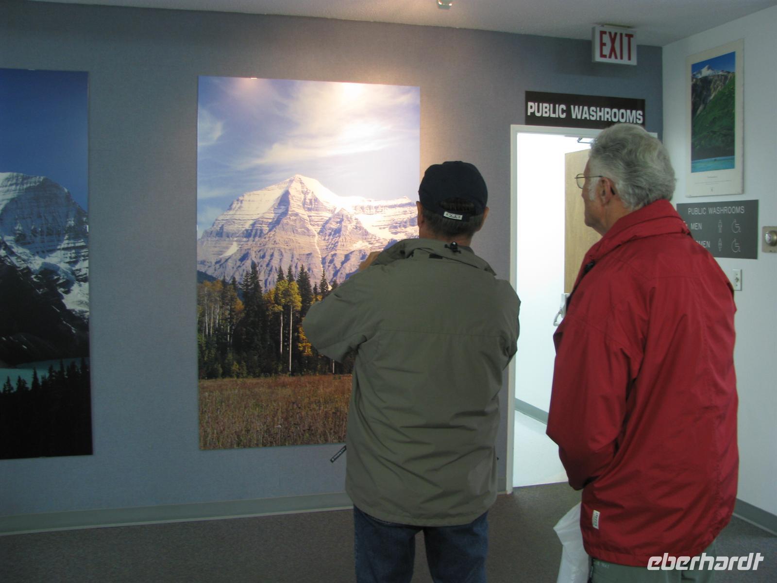 Mit gepackten Koffern setzten wir unsere Reise Richtung Westen fort und überschritten nach ca. 2 Stunden Fahrt die Grenze zur Provinz British Columbia, wobei uns durch die Zeitverschiebung eine weitere Stunde "schenkte". Wir erreichten das Mount Robson-Besucherzentrum, doch leider war das Wetter wieder nicht sonderlich gut. Zum Glück hatten wir bereits gestern von der Gondel aus den höchsten Berg der kanadischen Rockys erblickt, denn heute war nicht ein Stück zu sehen. Im Untergeschoss war zumindest eine schöne Ausstellung zu sehen. Da wir heute wieder große Strecken zurücklegen mussten, erreichten wir unsere Lodge in Clearwater erst am frühen Nachmittag. Nach der Zimmerverteilung und kurzer Freizeit fuhren wir zu zwei schönen Wasserfällen: Den Helmcken und Dawson Falls. Anschließend fuhren wir zur "Wells Gray Guest Ranch", auf der wir das heutige Abendessen einnahmen. Kurz bevor wir die Ranch erreichten, kamen uns drei Cowboys auf Pferden entgegen und geleiteten uns bis zum Eingang der Ranch. Nun konnten die Gäste ihre Cowboy-Fähigkeiten unter Beweis stellen und sich in den Sattel der Pferde schwingen. Mit Cowboyhut und Pistole posierten wir stolz für ein Bild. Jetzt konnten wir den Abend angehen: In der urigen Gaststube nahmen wir Platz und lauschten der Country-Band, die live für uns und einige andere Gäste spielte. Bier und Wein gab es an der Bar, Steak und andere Leckereien gab es draußen am Grill. Es war ein wunderbar uriger Abend - der schönste der ganzen Reise. Durch die lebensfrohe Country-Musik wippten wir wie von allein mit und amüsierten uns köstlich. Am schönsten war ohne Frage das Servieren des Nachtischs, wofür sich zwei Männer aus der Reisegruppe bereit erklärt hatten. Kaum waren die beiden im Nachbarzimmer verschwunden, kamen aus ebendiesem Raum zwei vollbusige Saloon-Tänzerinnen. Wir schunkelten zu Musik wie "Country Roads" und "Ghost Riders in the Sky". Der Abend war viel zu früh zu Ende und wir fuhren wieder ins Hotel zurück.