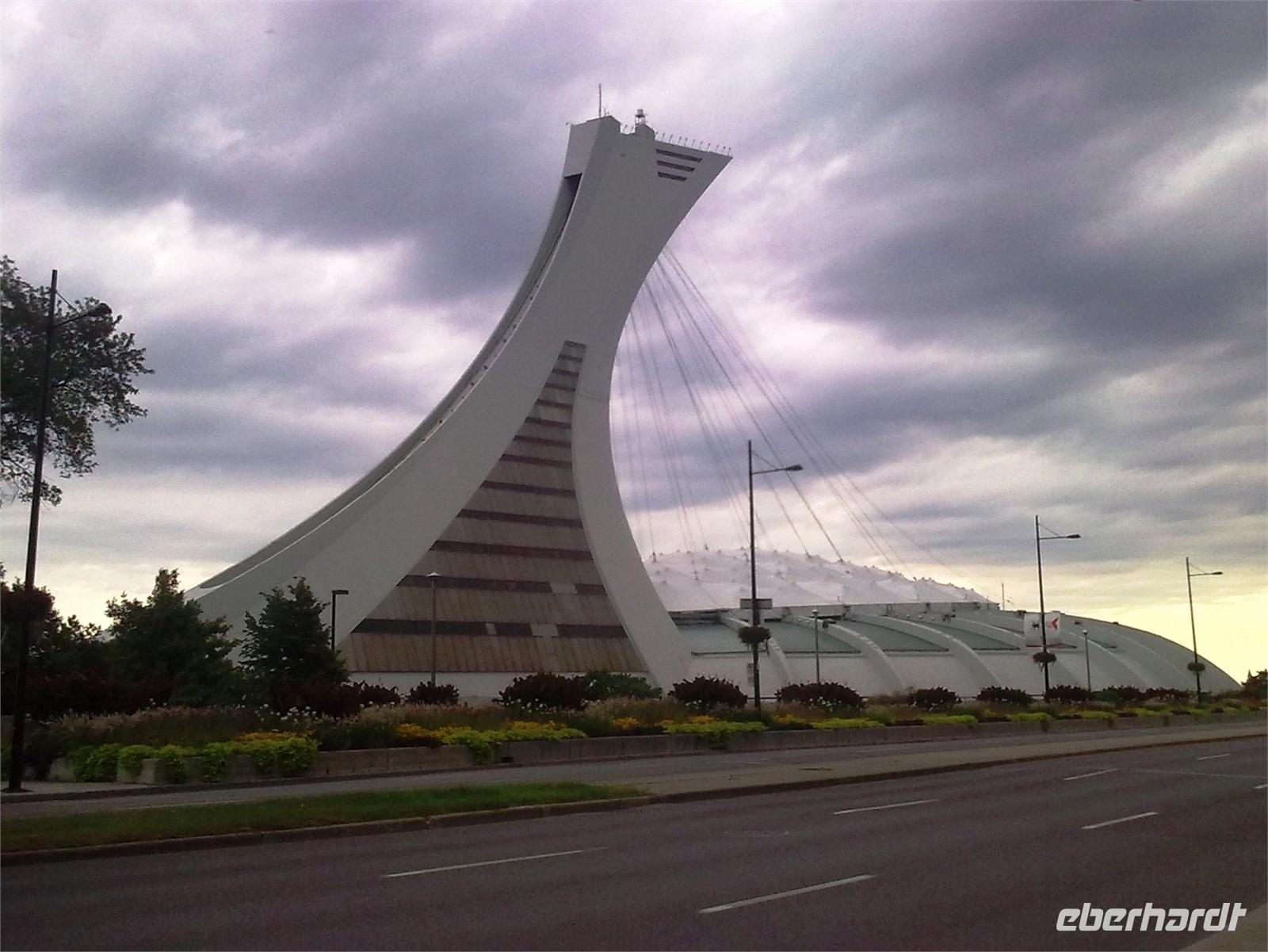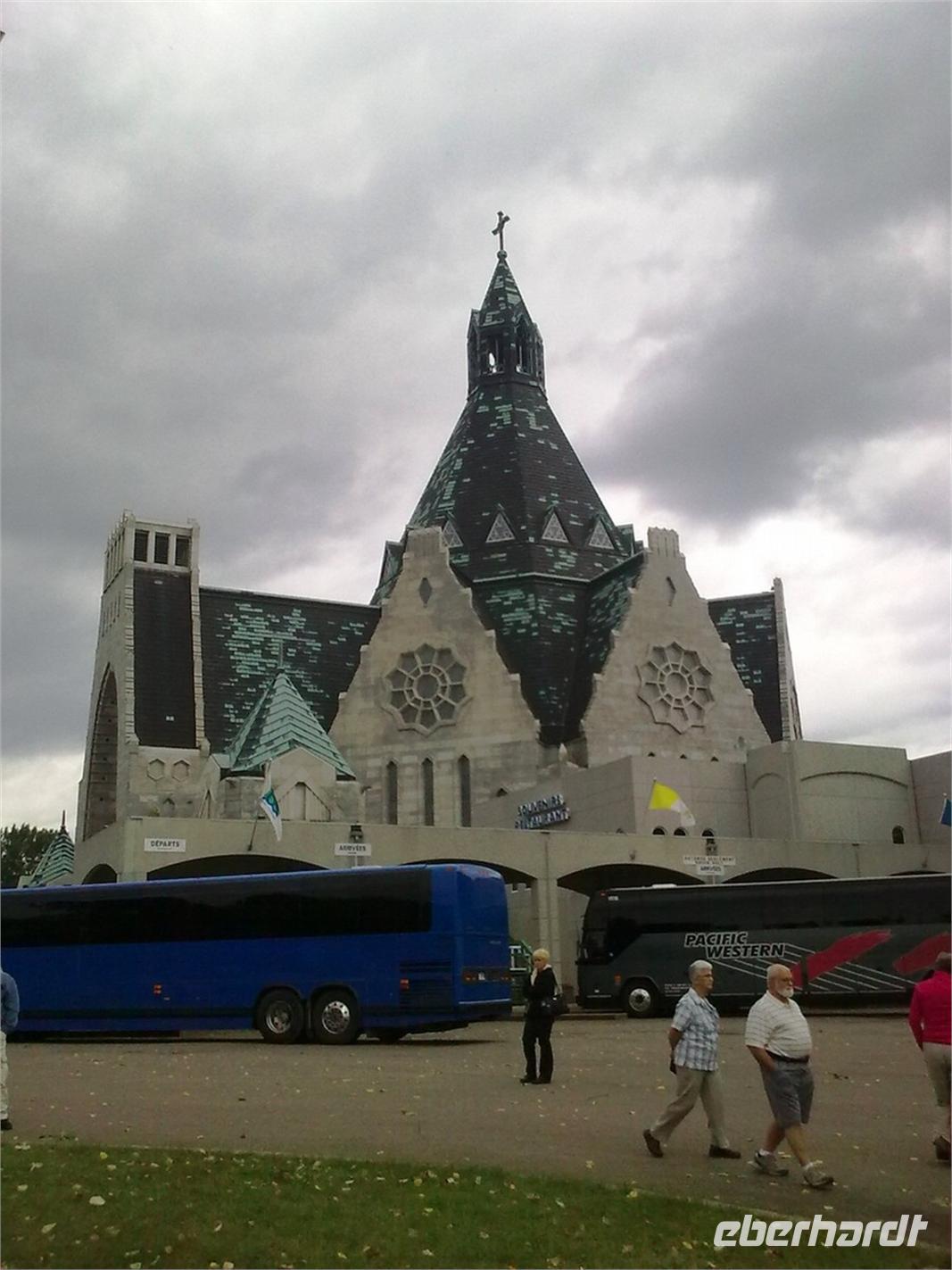 Unsere Stadtrundfahrt führt uns danach durch das Hafengebiet entlang des Sankt-Lorenz-Stroms. Als letztes nehmen wir uns das Zentrum mit der Börse und der Weltzentrale von ICAO vor. Hier verabschieden wir uns von Regina, die uns in ihrer freundlichen Art ihre Wahlheimat Montréal nähergebracht hat. Mit Ellen fahren wir im Anschluss noch raus zum Olympischen Park. Hier fanden 1976 die XXI. Olympischen Sommerspiele statt, insbesondere die Wettkämpfe der Leichtathletik und die Eröffnungs- und Schlussfeier. Mit einer Kapazität von 70.000 Zuschauerplätzen gleicht der Park in seiner Form einer riesigen Betonmuschel. Er wird zudem von einem 175 Meter hohen 45 Grad schiefen Turm überragt. Auf unserer langen Fahrt nach Québec machen wir unterwegs Halt in Cap-de-la-Madeleine und besuchen die Sanctuaire Notre Dame du Cap. Zu der 1964 erbauten, achteckigen Basilika strömen alljährlich tausende frommer Pilger. Besonders markant ist ihr 80 Meter hoher Turm. Nicht nur diese schöne Kirche wird uns noch lange in Erinnerung bleiben, sondern vor allem der Aufzug einer Frauengruppe aus New York, die vor dem Gebäude eine Art Erntedankfest feiern.