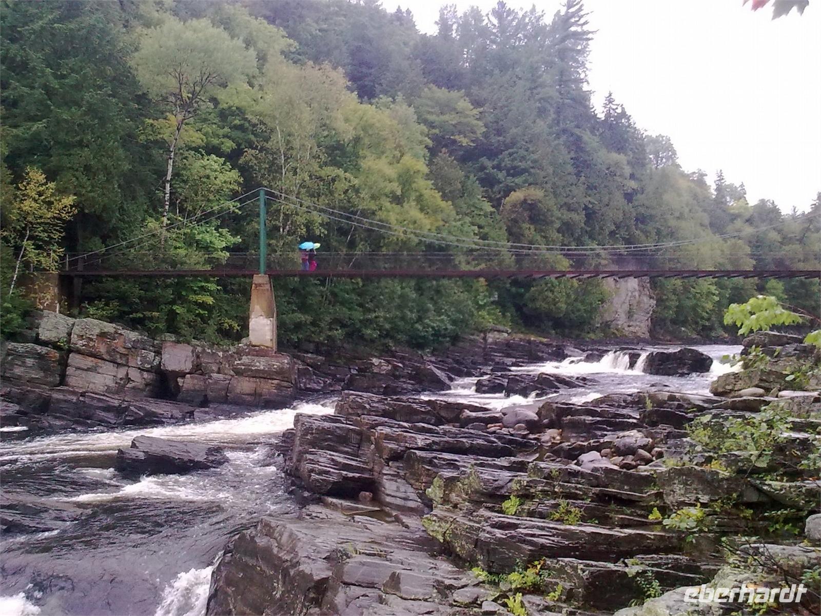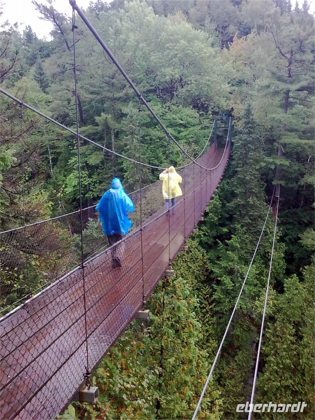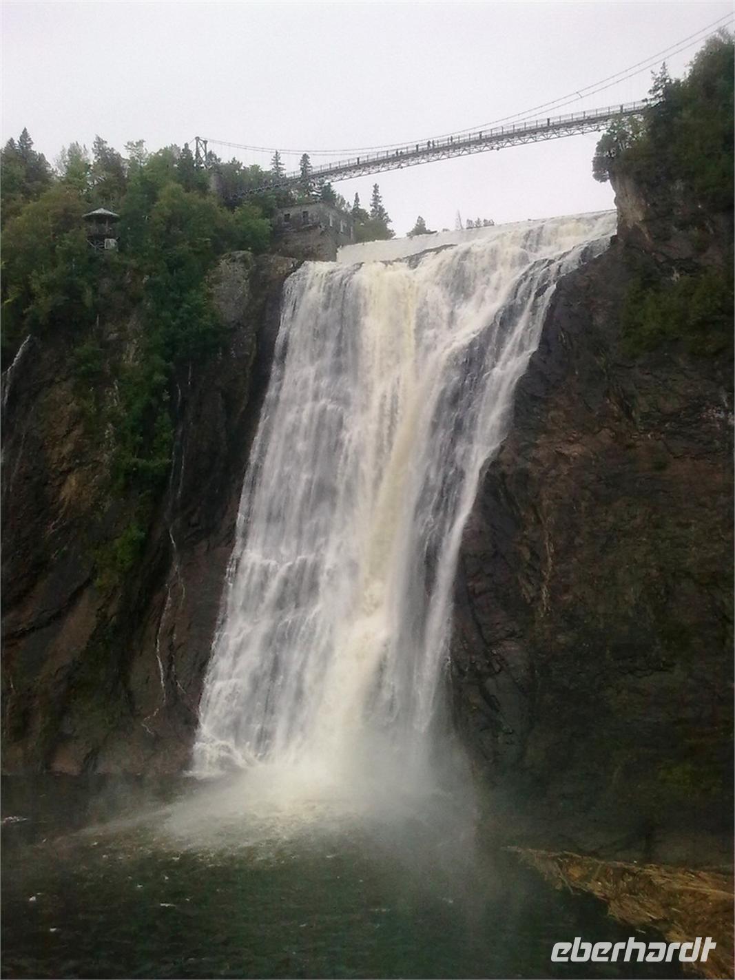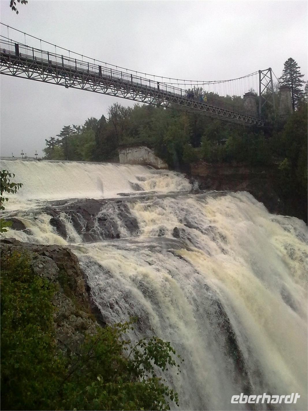 Da die Regentropfen immer noch sehr heftig vom Himmel fallen, entscheiden wir uns spontan für einen Abstecher auf die mitten im Sankt-Lorenz-Strom gelegene Insel Orléans. Sie wurde Mitte des 16. Jahrhunderts von einem französischen Entdecker ausfindig gemacht und später nach dem Herzog von Orléans benannt. Die Insel ist ein Paradies für Landwirte und Bauern. So trifft man neben Apfelplantagen, Pfirsichhainen und Tomaten- und Kartoffelfeldern, auch auf zahlreiche Weinreben. An einer kleinen Kirche angekommen, legen wir einen kurzen Spaziergang entlang der Hauptstraße ein. Dort finden wir ein paar hübsche Häuschen vor, die wir uns sofort vor die Linse holen. Hier, ein paar wenige Kilometer außerhalb von Québec, kann man genau die Ruhe finden, die man im turbulenten Stadtgetümmel manchmal vermisst. Obwohl es immer noch regnet, nehmen wir jetzt den Montmorency Wasserfall in Angriff. Er stürzt über eine Felswand 83 Meter in den Sankt-Lorenz-Strom und ist damit ca. 30 Meter höher als die Niagarafälle. Fast alle von uns wollen die Hängebrücke, die hoch über dem Wasser hängt, zu Fuß erklimmen. Mit Schirm und Regencape ausgestattet, kämpfen wir uns Stufe für Stufe nach oben. Die glitschigen Holztreppen sind dabei mit höchster Vorsicht zu genießen. Wer es von uns etwas bequemer haben wollte, der ist zusammen mit Ellen in der Kabinenbahn nach oben gefahren. Von der Brücke aus hat man eine spektakuläre Aussicht auf den Wasserfall und an schönen Tagen kann man bestimmt auch auf Québec schauen. Dies bleibt uns heute leider verwährt.