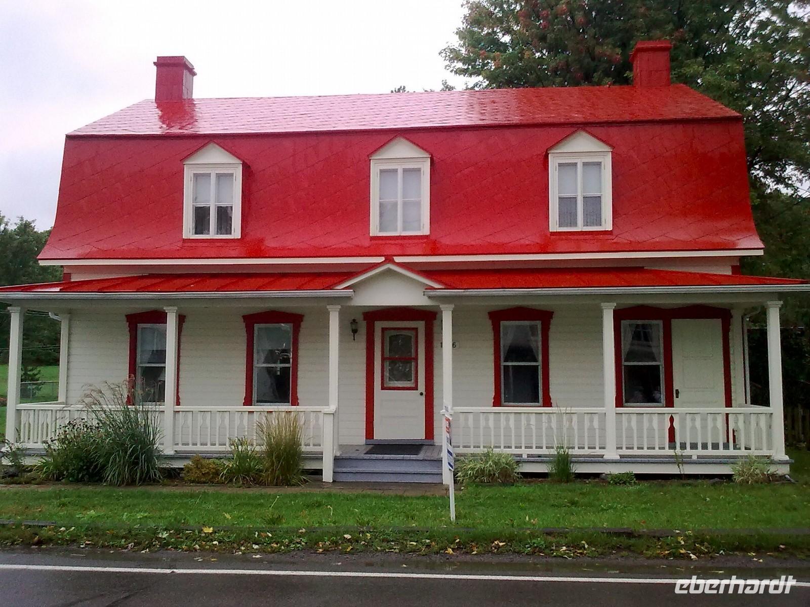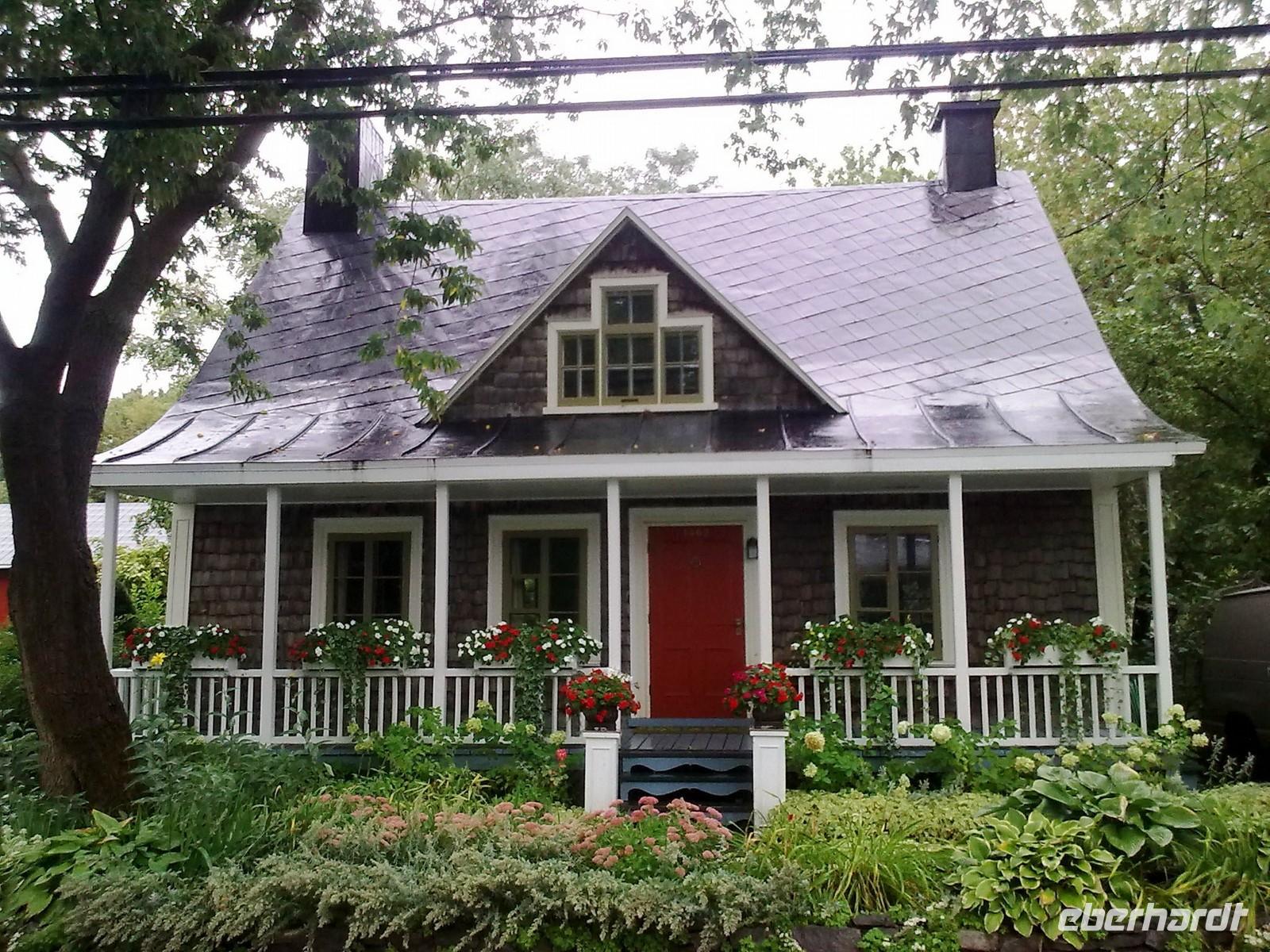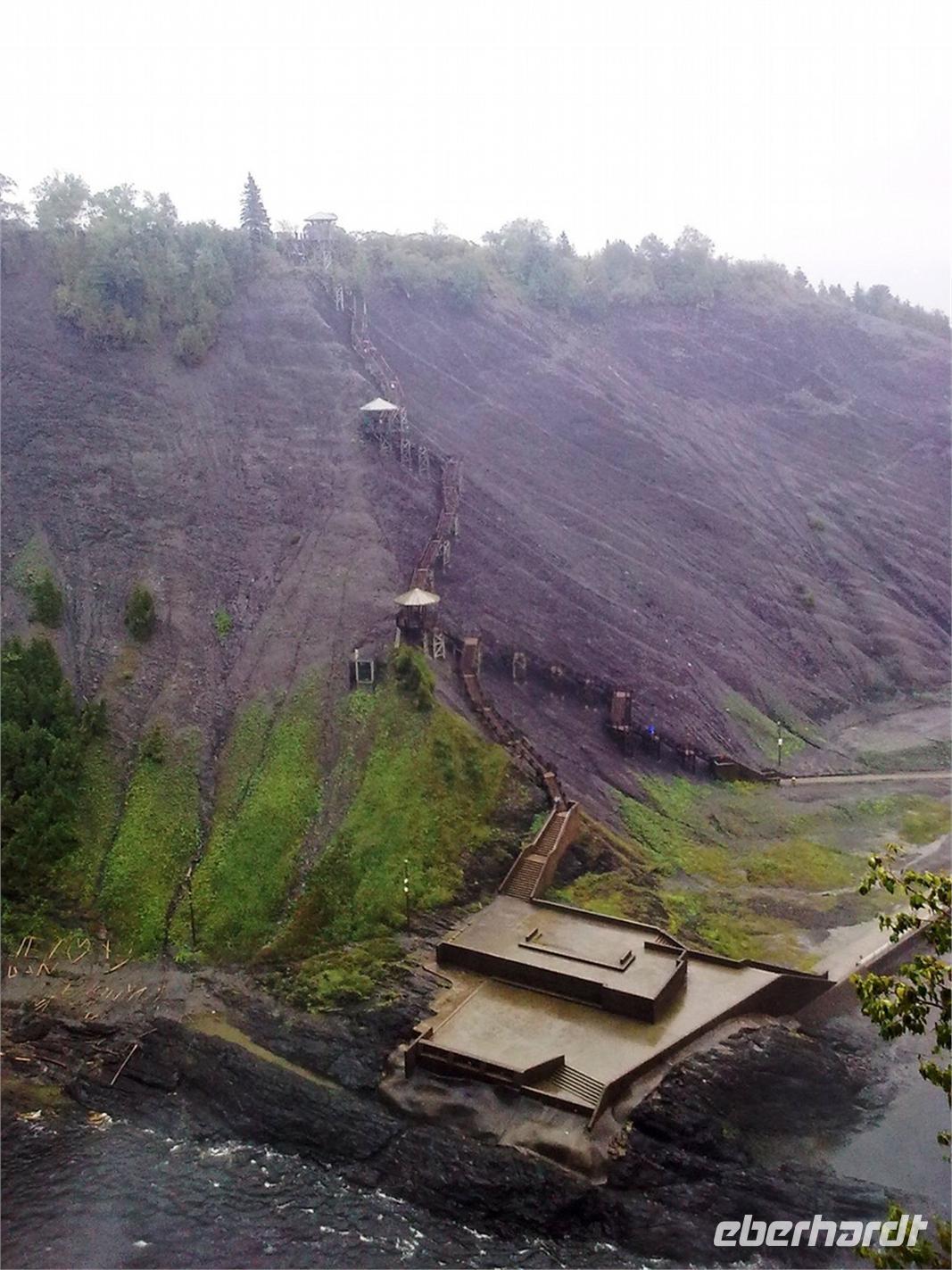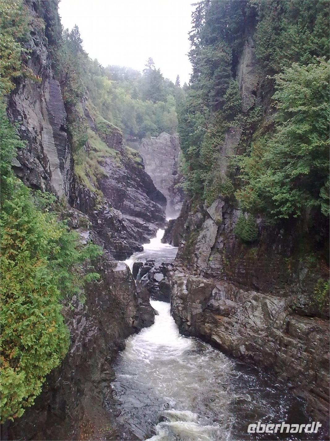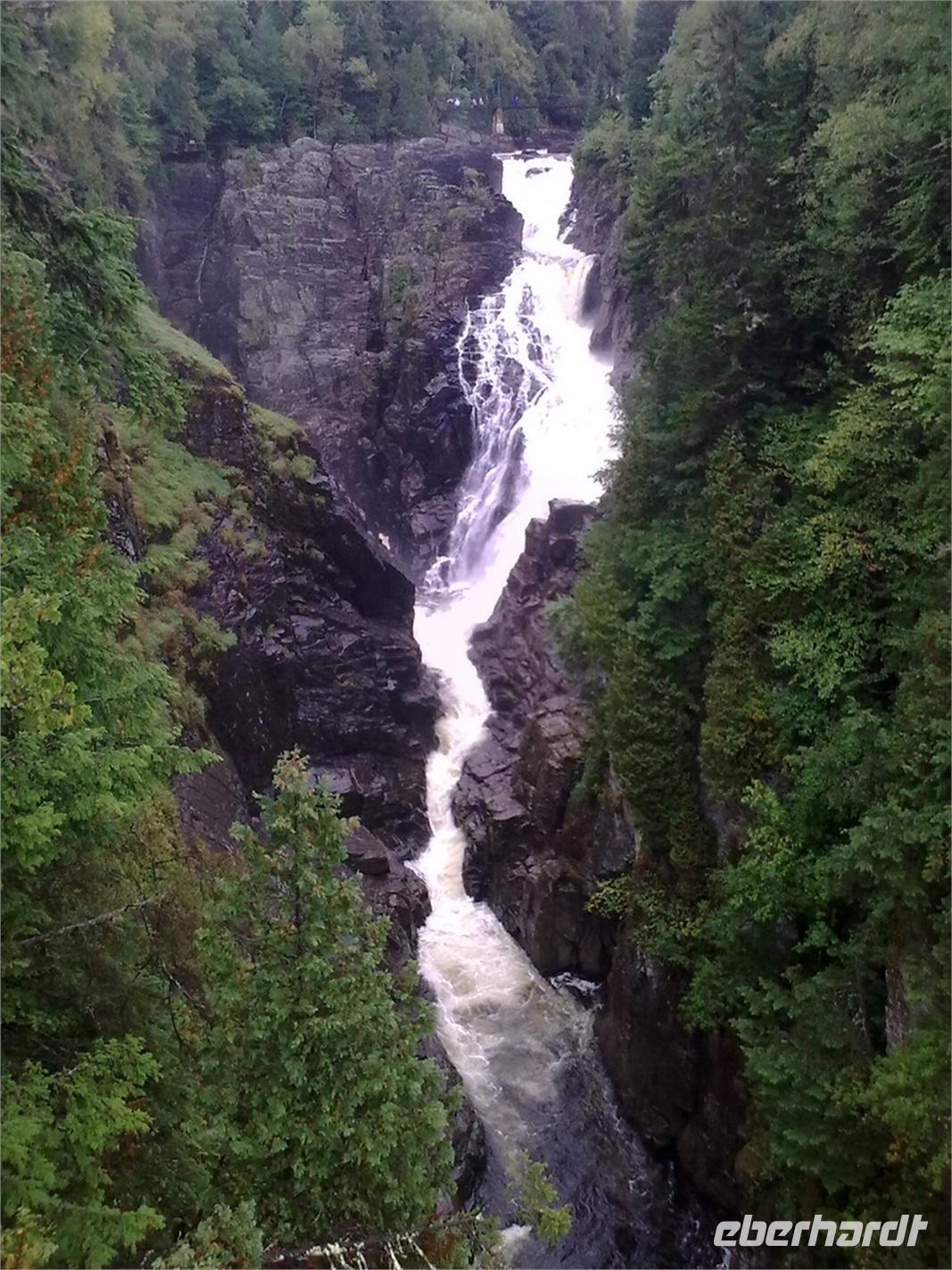 Da die Regentropfen immer noch sehr heftig vom Himmel fallen, entscheiden wir uns spontan für einen Abstecher auf die mitten im Sankt-Lorenz-Strom gelegene Insel Orléans. Sie wurde Mitte des 16. Jahrhunderts von einem französischen Entdecker ausfindig gemacht und später nach dem Herzog von Orléans benannt. Die Insel ist ein Paradies für Landwirte und Bauern. So trifft man neben Apfelplantagen, Pfirsichhainen und Tomaten- und Kartoffelfeldern, auch auf zahlreiche Weinreben. An einer kleinen Kirche angekommen, legen wir einen kurzen Spaziergang entlang der Hauptstraße ein. Dort finden wir ein paar hübsche Häuschen vor, die wir uns sofort vor die Linse holen. Hier, ein paar wenige Kilometer außerhalb von Québec, kann man genau die Ruhe finden, die man im turbulenten Stadtgetümmel manchmal vermisst. Obwohl es immer noch regnet, nehmen wir jetzt den Montmorency Wasserfall in Angriff. Er stürzt über eine Felswand 83 Meter in den Sankt-Lorenz-Strom und ist damit ca. 30 Meter höher als die Niagarafälle. Fast alle von uns wollen die Hängebrücke, die hoch über dem Wasser hängt, zu Fuß erklimmen. Mit Schirm und Regencape ausgestattet, kämpfen wir uns Stufe für Stufe nach oben. Die glitschigen Holztreppen sind dabei mit höchster Vorsicht zu genießen. Wer es von uns etwas bequemer haben wollte, der ist zusammen mit Ellen in der Kabinenbahn nach oben gefahren. Von der Brücke aus hat man eine spektakuläre Aussicht auf den Wasserfall und an schönen Tagen kann man bestimmt auch auf Québec schauen. Dies bleibt uns heute leider verwährt.