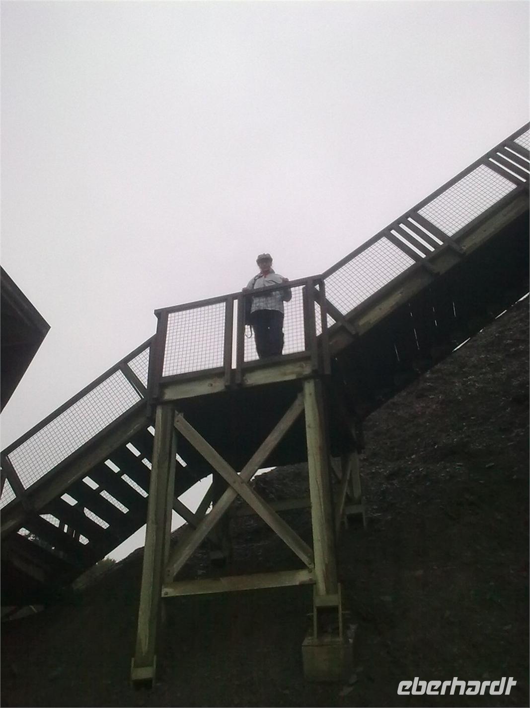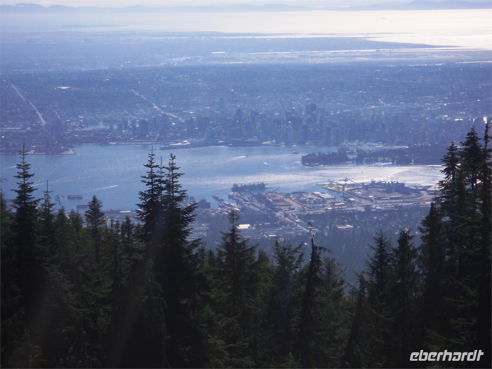 Dabei versäumen wir nicht, all die sechs Stempel aufzufinden, die uns am Ende zu einem „I made it" Zertifikat verhelfen. Gegen Mittag kommen wir an der Talstation des Grouse Mountain an. Nach einer sechsminütigen Auffahrt mit der Kabinenbahn, stehen wir auf dem Gipfel. Von hier aus überblickt man ganz Vancouver. Leider ist die Sicht etwas getrübt und erscheint leicht milchig, aber das Wetter auf dem Berg ist herrlich. Wir sitzen auf der sonnengefluteten Terrasse und nehmen eine Kleinigkeit zu uns. Im Anschluss besuchen wir die zwei Grizzlybären Grinder und Coola. Nachdem wir anfangs von weißen Bären ausgegangen waren, stellt sich schnell heraus, dass es sich um Waisen handelt. Leider beginnt die spektakuläre Holzfällershow zu spät, sodass wir uns diese nicht anschauen können. Nach der Talabfahrt und der erneuten Busfahrt über die Lion's Gate kommen wir noch einmal im Stanley Park an. Diesmal machen wir am Prospect Point Halt. Von hier aus können wir die Lion's Gate sehr gut fotografieren und blicken noch einmal auf den Grouse Mountain zurück.