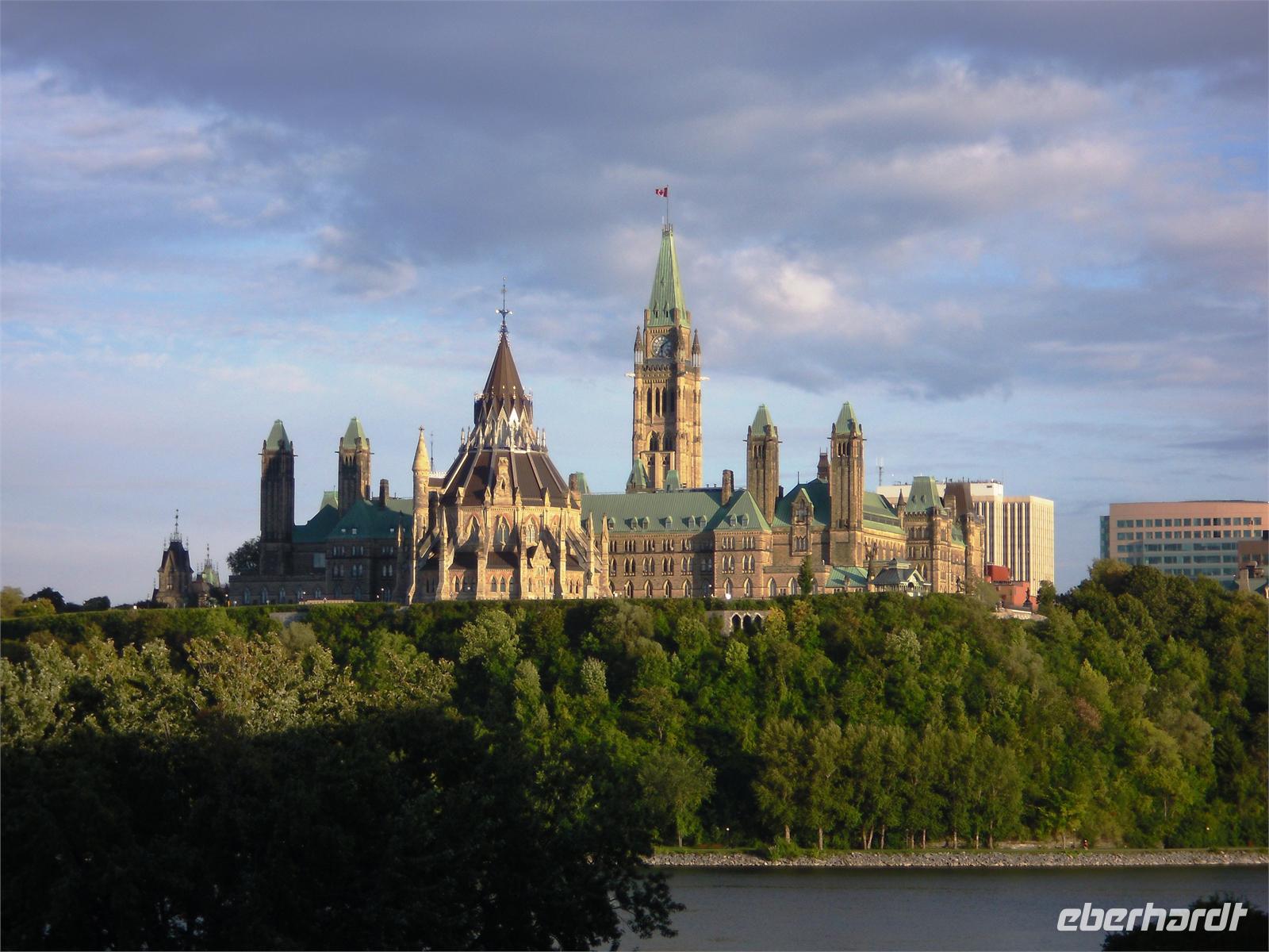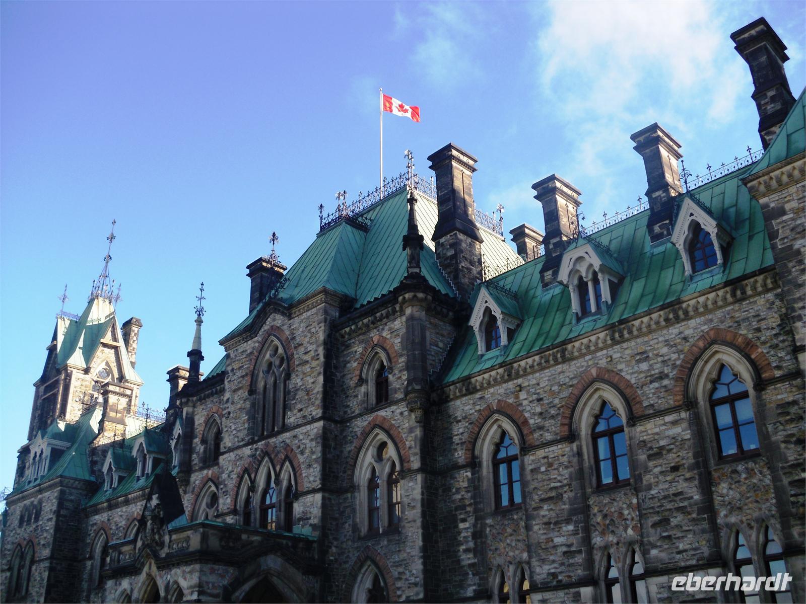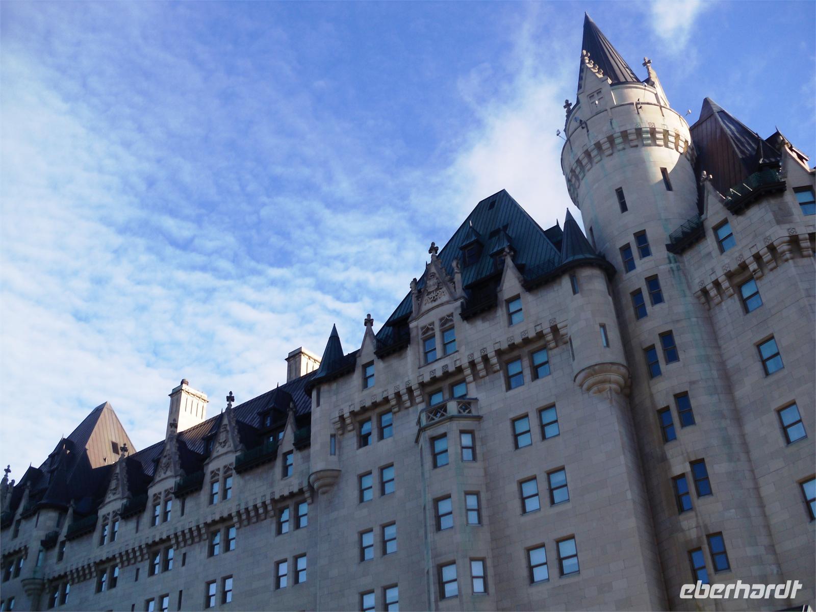 kommen wir am Chateau Montebello an. Wir haben zunächst etwas Zeit, um uns das außergewöhnliche Foyer des Luxushotels in aller Ruhe zu betrachten. Hier nehmen wir auch unser Mittagessen ein. Wir bedienen uns vom reichhaltigen Buffet und stoßen hier und da auf wahre Leckereien. Allein die Auswahl an genüsslichen Kuchen ist riesengroß. Mit dicken Bäuchen kommen wir im Anschluss am Oméga Wildpark an. Die ersten Tiere sind bereits von der Terrasse aus zu sehen: Füchse, Stinktiere und Waschbären. Mit vielen Möhren ausgestattet, um die Tiere unterwegs bei Laune zu halten, starten wir die Fahrt durch den Wildpark. Schon nach wenigen Minuten steckt ein hungriger Wapiti seinen Kopf durch das kleine Fenster vorn bei Roland, um ein paar Möhren einzuheimsen. Auf unserer Weiterfahrt durch den Park sehen wir außerdem viele Rehe, Büffel, Bären und Wölfe. Zwischendurch können wir uns die Beine vertreten und die gute Luft genießen. Nach diesem tierischen Erlebnis fahren wir weiter in Richtung Ottawa. Am zeitigen Abend kommen wir in der Hauptstadt Kanadas an und halten zunächst am Museum für Völkerkunde. Von hier aus haben wir einen spektakulären Ausblick auf den Parliament Hill. Endlich scheint auch mal die Sonne, sodass wir traumhafte Fotos schießen können und sofort von der Stadt angetan sind. Unsere orientierende Stadtrundfahrt führt uns am Konsulat von Saudi Arabien, dem Auswärtigen Amt, dem ehemaligen Rathaus und der Botschaft von Frankreich vorbei. Außerdem sehen wir die Rideau Hall, das Landwirtschaftliche Amt und die Botschaft von Japan. Am Markt von Ottawa legen wir noch eine Pause ein, um eine Kleinigkeit fürs Abendessen zu besorgen. Nicht weit entfernt liegt bereits unser Hotel „Capitol Hill Hotel & Suites". Viele von uns ziehen noch einmal los, um Ottawa im Abendlicht zu fotografieren.