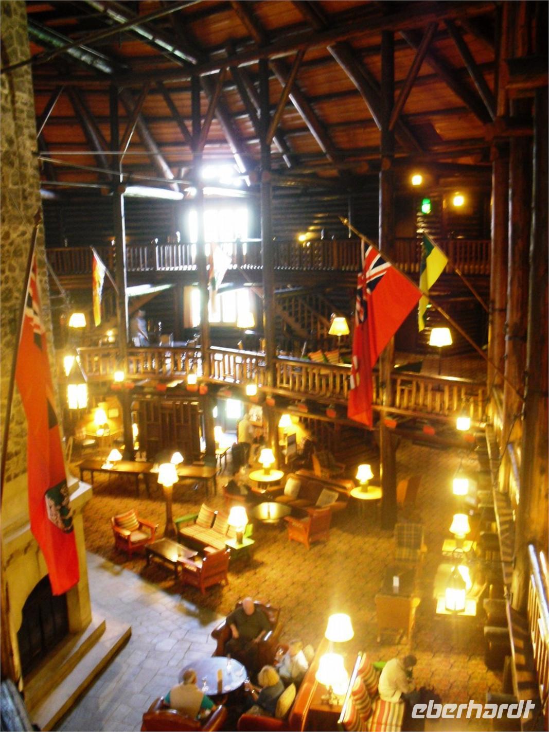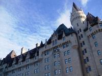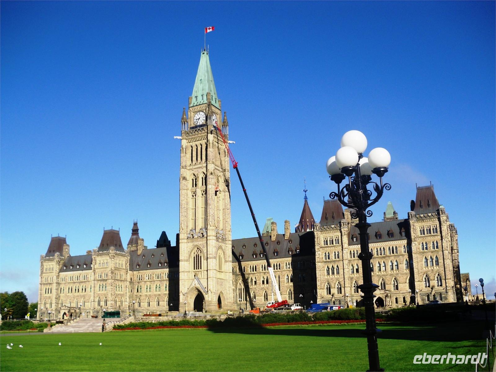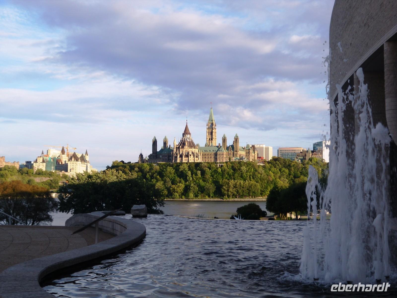 kommen wir am Chateau Montebello an. Wir haben zunächst etwas Zeit, um uns das außergewöhnliche Foyer des Luxushotels in aller Ruhe zu betrachten. Hier nehmen wir auch unser Mittagessen ein. Wir bedienen uns vom reichhaltigen Buffet und stoßen hier und da auf wahre Leckereien. Allein die Auswahl an genüsslichen Kuchen ist riesengroß. Mit dicken Bäuchen kommen wir im Anschluss am Oméga Wildpark an. Die ersten Tiere sind bereits von der Terrasse aus zu sehen: Füchse, Stinktiere und Waschbären. Mit vielen Möhren ausgestattet, um die Tiere unterwegs bei Laune zu halten, starten wir die Fahrt durch den Wildpark. Schon nach wenigen Minuten steckt ein hungriger Wapiti seinen Kopf durch das kleine Fenster vorn bei Roland, um ein paar Möhren einzuheimsen. Auf unserer Weiterfahrt durch den Park sehen wir außerdem viele Rehe, Büffel, Bären und Wölfe. Zwischendurch können wir uns die Beine vertreten und die gute Luft genießen. Nach diesem tierischen Erlebnis fahren wir weiter in Richtung Ottawa. Am zeitigen Abend kommen wir in der Hauptstadt Kanadas an und halten zunächst am Museum für Völkerkunde. Von hier aus haben wir einen spektakulären Ausblick auf den Parliament Hill. Endlich scheint auch mal die Sonne, sodass wir traumhafte Fotos schießen können und sofort von der Stadt angetan sind. Unsere orientierende Stadtrundfahrt führt uns am Konsulat von Saudi Arabien, dem Auswärtigen Amt, dem ehemaligen Rathaus und der Botschaft von Frankreich vorbei. Außerdem sehen wir die Rideau Hall, das Landwirtschaftliche Amt und die Botschaft von Japan. Am Markt von Ottawa legen wir noch eine Pause ein, um eine Kleinigkeit fürs Abendessen zu besorgen. Nicht weit entfernt liegt bereits unser Hotel „Capitol Hill Hotel & Suites". Viele von uns ziehen noch einmal los, um Ottawa im Abendlicht zu fotografieren.