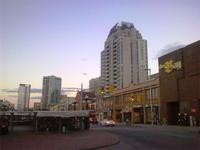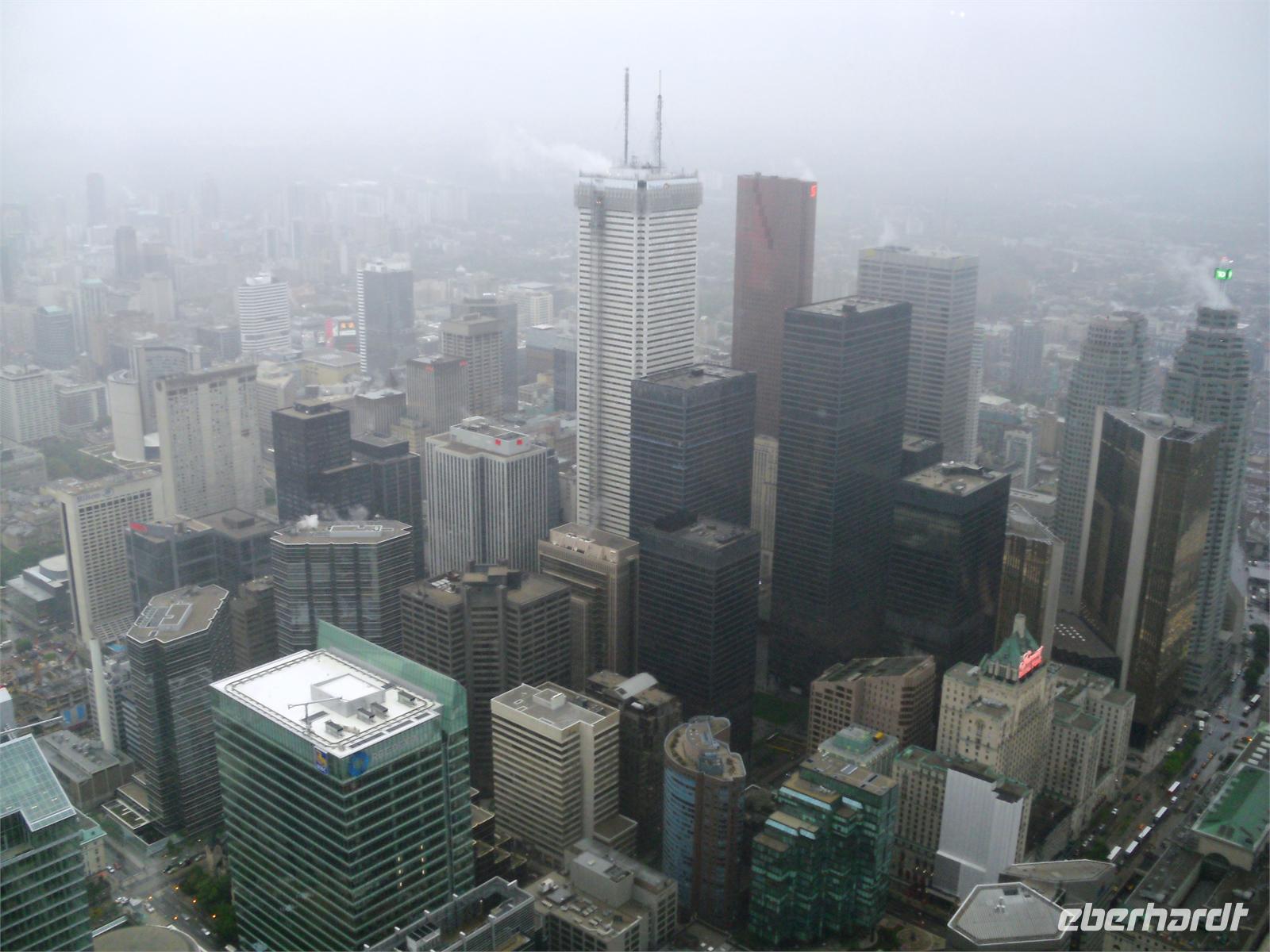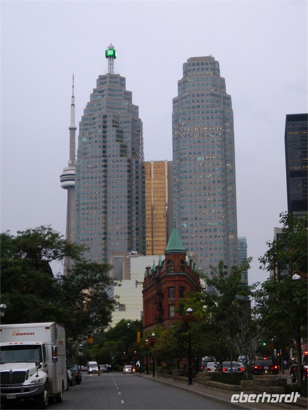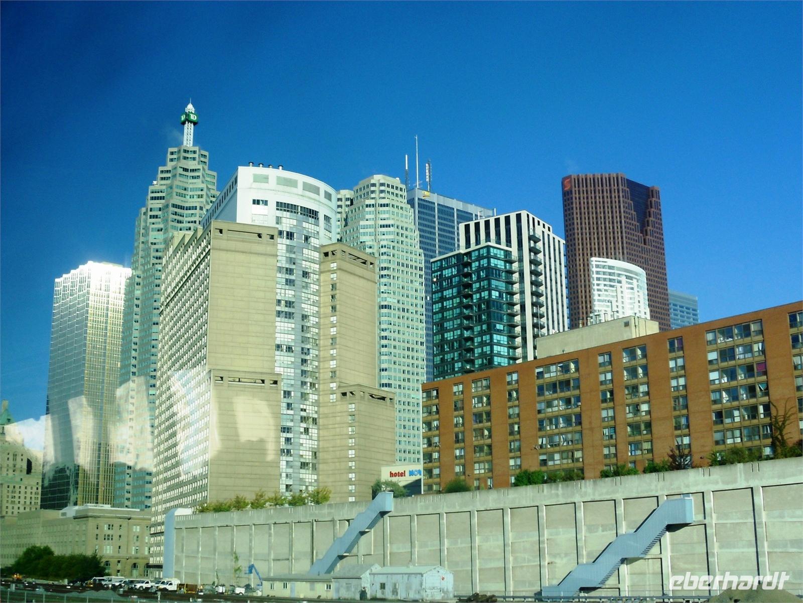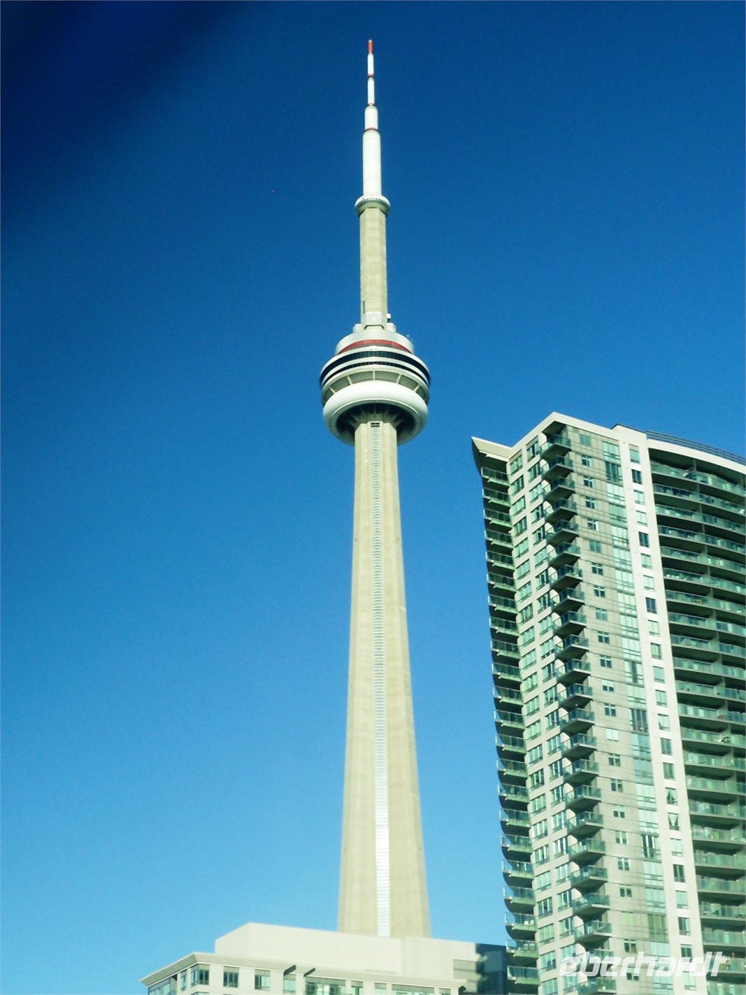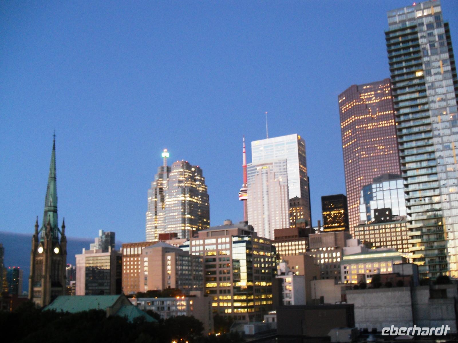 Bis 2007 war der 553 Meter hohe Fernsehturm das höchste freistehende und nicht abgespannte Bauwerk der Welt. Aufgrund des eher bescheidenen Wetters müssen wir keine Wartezeiten in Kauf nehmen und können sofort mit dem Fahrstuhl nach oben fahren. Glücklicher Weise ist der Ausblick dann doch sensationell. Ganz Toronto liegt uns bei guter Sicht zu Füßen. Nach diesem Höhenausflug fahren wir weiter über die King Street. Mittlerweile regnet es wieder sehr stark. Wir stoppen für eine halbe Stunde am Regierungsgebäude der Provinz Ontario und können uns verschiedene Räume im Inneren des Gebäudes anschauen. Die Weiterfahrt erfolgt durch eine hübsche Wohngegend mit teuren Villen, in der einst Ellens Tante wohnte. Nach der Fahrt durch China Town legen wir am Hafen unsere Mittagspause ein. Der Nachmittag steht uns zur freien Verfügung. Einige von uns knöpfen sich das gewaltige Eaton-Shopping-Center vor, andere machen erst einmal ein Mittagsschläfchen. Aufgrund des starken Regens und des tristen Graus, verbringen viele Gäste ihren Nachmittag im Hotel. Erst am Abend treffen wir uns alle wieder, um zum Restaurant „Hot House" zu laufen. In gemütlichem Ambiente und bei hervorragendem Essen (zur Auswahl standen Lachs, Hühnchen, Steak oder Lasagne) genießen wir den vorletzten Abend im Osten Kanadas. Danach übernachten wir erneut im Hotel „Holiday Inn Express Downtown".