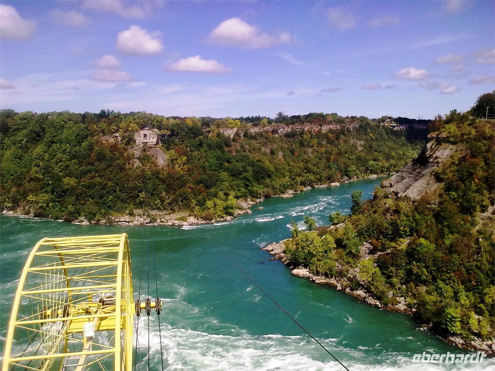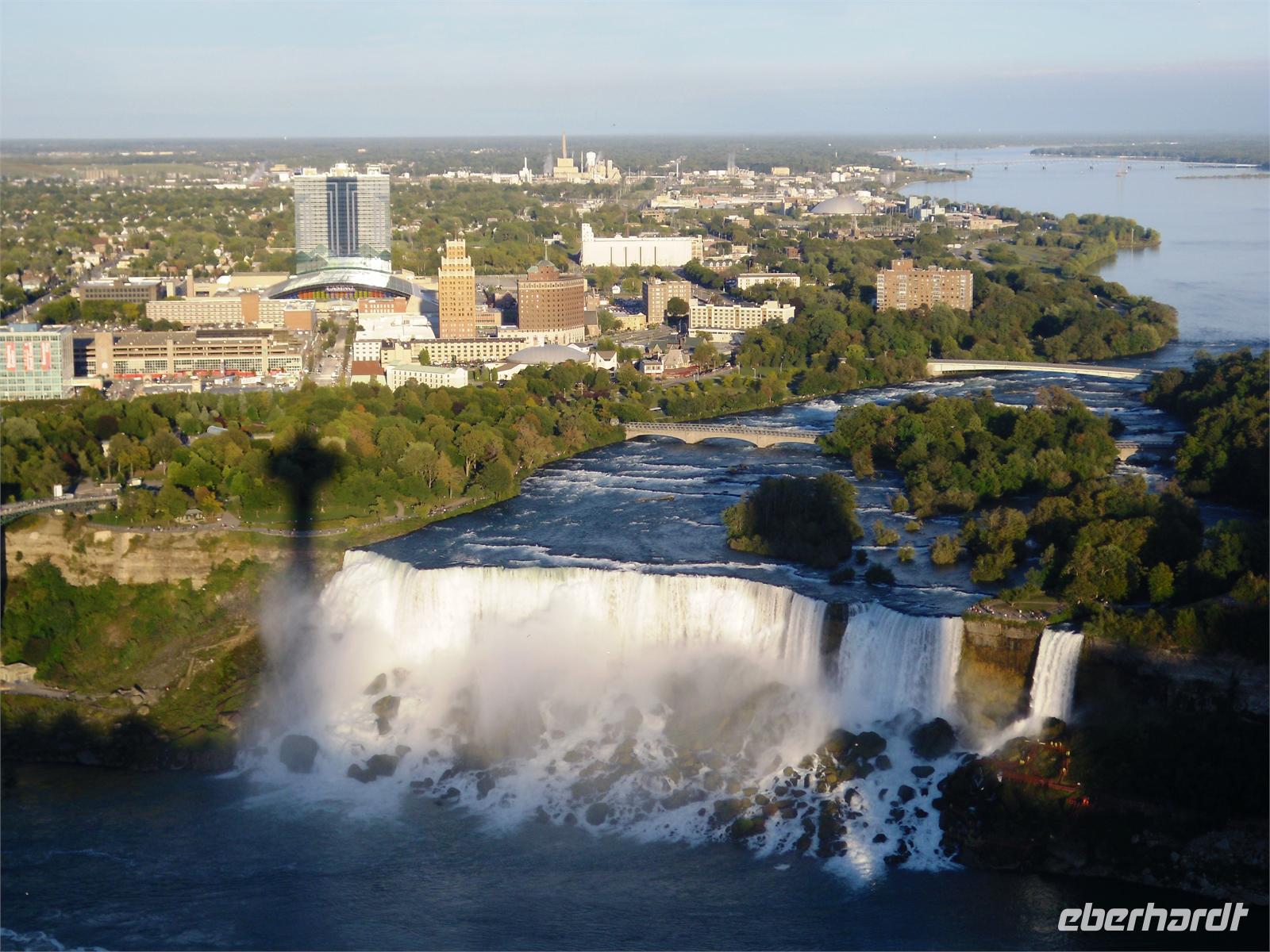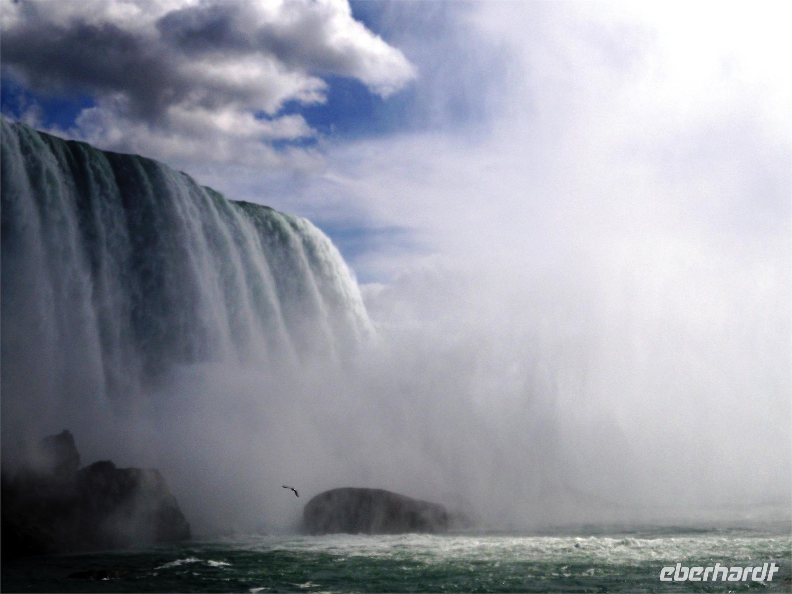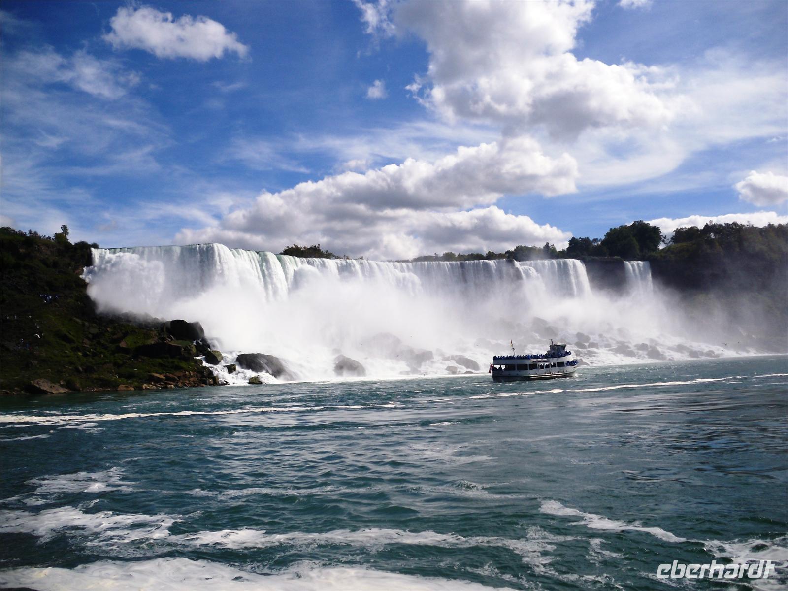 Danach haben wir genügend Freizeit, um die vielen niedlichen Lädchen im Ort zu besuchen und einen Spaziergang am Wasser einzulegen. Bald haben wir auch die Niagarafälle erreicht. Zunächst legen wir auf unserer Weiterfahrt einen Stopp am sogenannten Whirlpool ein. An dieser Stelle macht der Niagara-Fluss einen Knick und das Wasser sammelt sich in einem großen Becken. Hier fährt das Aero Car auf die andere Seite, die ebenfalls kanadisch ist. Jetzt sind es nur noch wenige Fahrminuten, bis wir in Niagara Falls ankommen. Das Wort Niagara bedeutet übrigens „donnerndes Wasser". An unserem Hotel angekommen, laufen wir zur Anlegestelle der Maid of the Mist. Schon nach wenigen Metern können wir die amerikanischen Wasserfälle bestaunen. Der Niagara-Fluss wird durch die Insel Goat Island in zwei Teile gespalten. Auf der US-amerikanischen Seite stürzt er sich bei einer Kantenlänge von 363 Meter 21 Meter in die Tiefe, auf der kanadischen Seite bei einer Kantenlänge von 792 Meter 52 Meter in die Tiefe. Endlich dürfen wir mal Sonnenschein pur genießen. Mit blauen Regencapes ausgestattet, strahlen wir um die Wette,