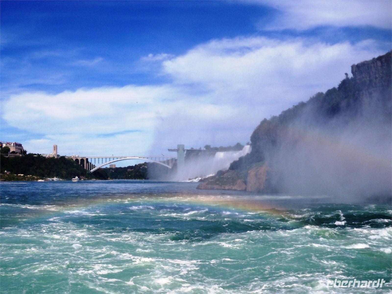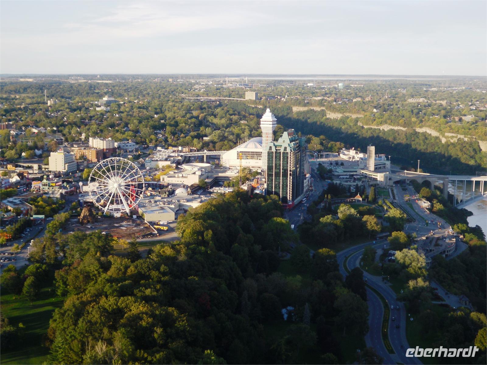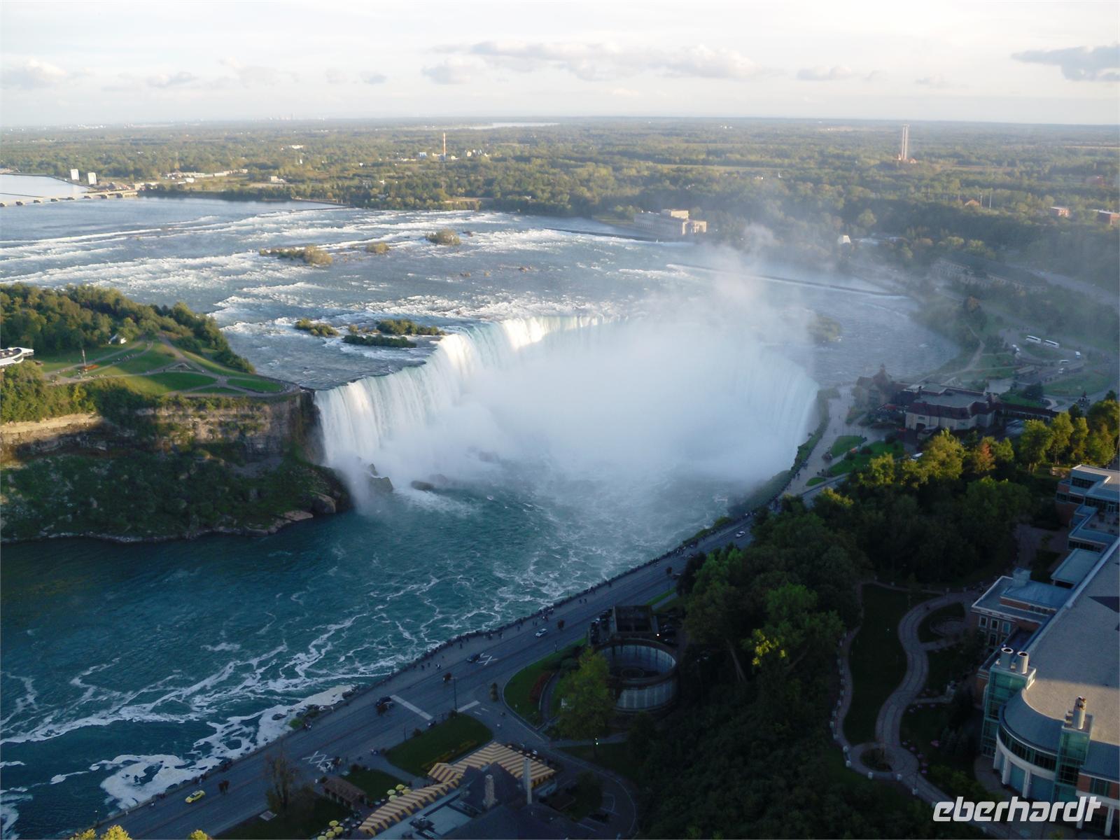 freuen wir uns doch alle auf die bevorstehende Bootsfahrt. Und dann geht es los. Wir fahren bis kurz vor die Fälle und bekommen die gewaltige Macht der Wassermassen zu spüren. Ein feiner Nieselregen sorgt für einen wunderschönen Regenbogen. Nach 40 Minuten ist der Wasserausflug zu Ende. Wir laufen gemeinsam entlang der Promenade zum Table Rock. Dieses Gebäude steht genau dort, wo sich die kanadischen Fälle zu Boden stürzen. Von hier aus hat man ebenfalls eine fantastische Sicht. Danach fahren wir zum Hotel „Michael's Inn" und haben etwas Freizeit bis zum Abendessen. Dieses findet heute im Skylon Tower statt. Nach der Auffahrt auf den 160 Meter hohen Turm, kann man beide Wasserfälle auf einmal betrachten und auch das amerikanische Hinterland erkennen. Was für ein Ausblick! Und dann noch das leckere Essen vom Buffet. Dieser Abend ist äußerst gelungen. Gekrönt wird er nur noch durch das 21:00 Uhr stattfindende Feuerwerk, welches über den bunt beleuchteten Wasserfällen gezündet wird. Traumhaft! Beim Zurücklaufen zum Hotel wagen wir noch einen Abstecher auf die Clifton Hill, dem Las Vegas von Niagara Falls.