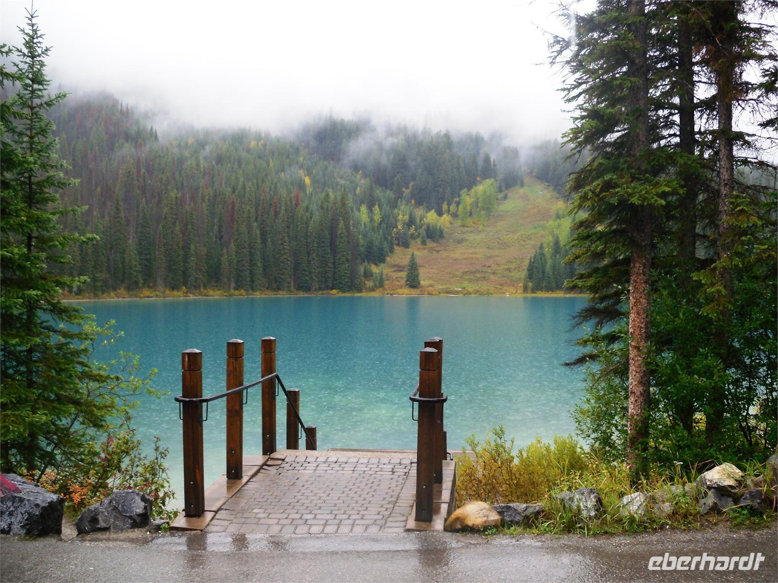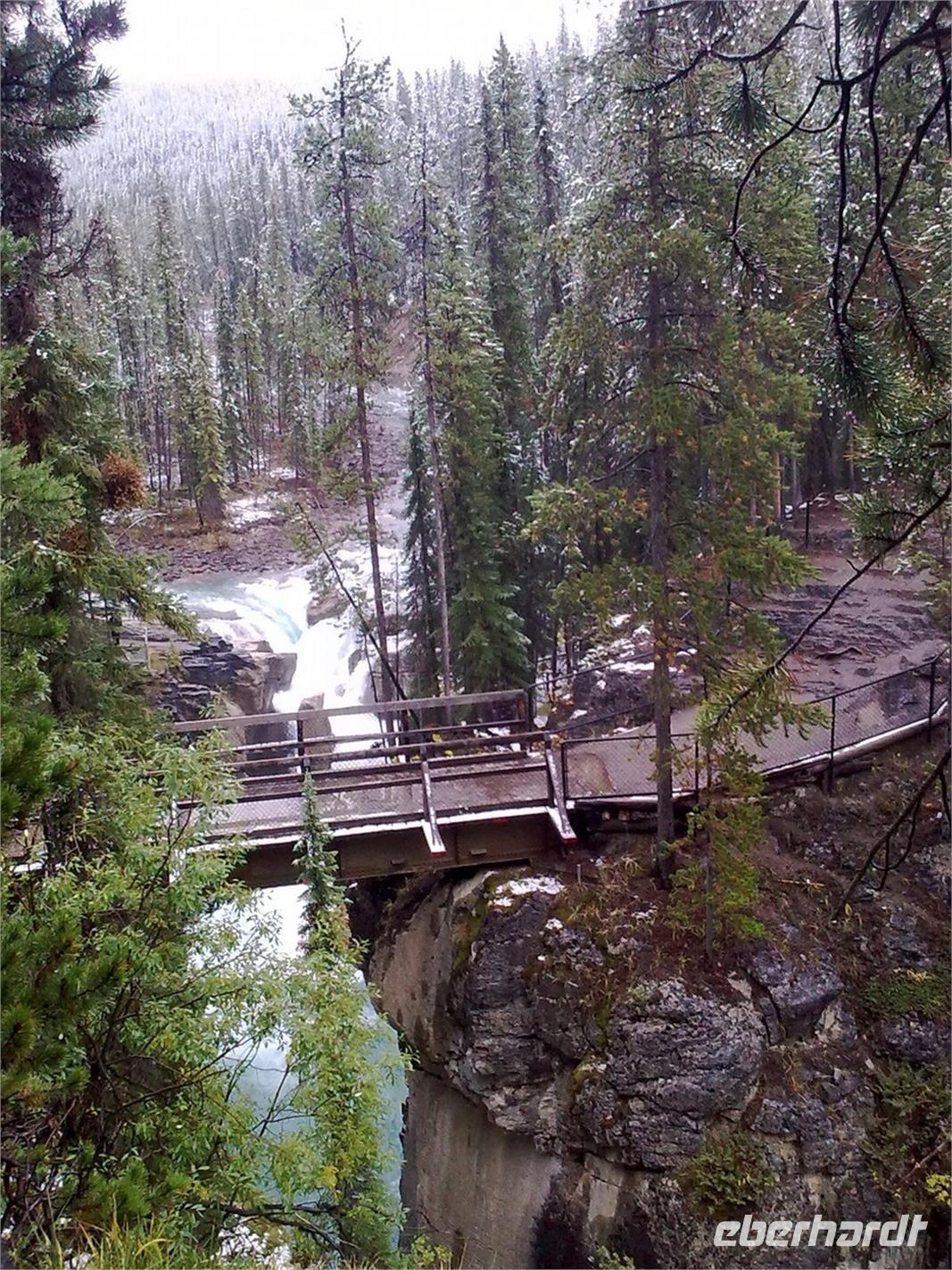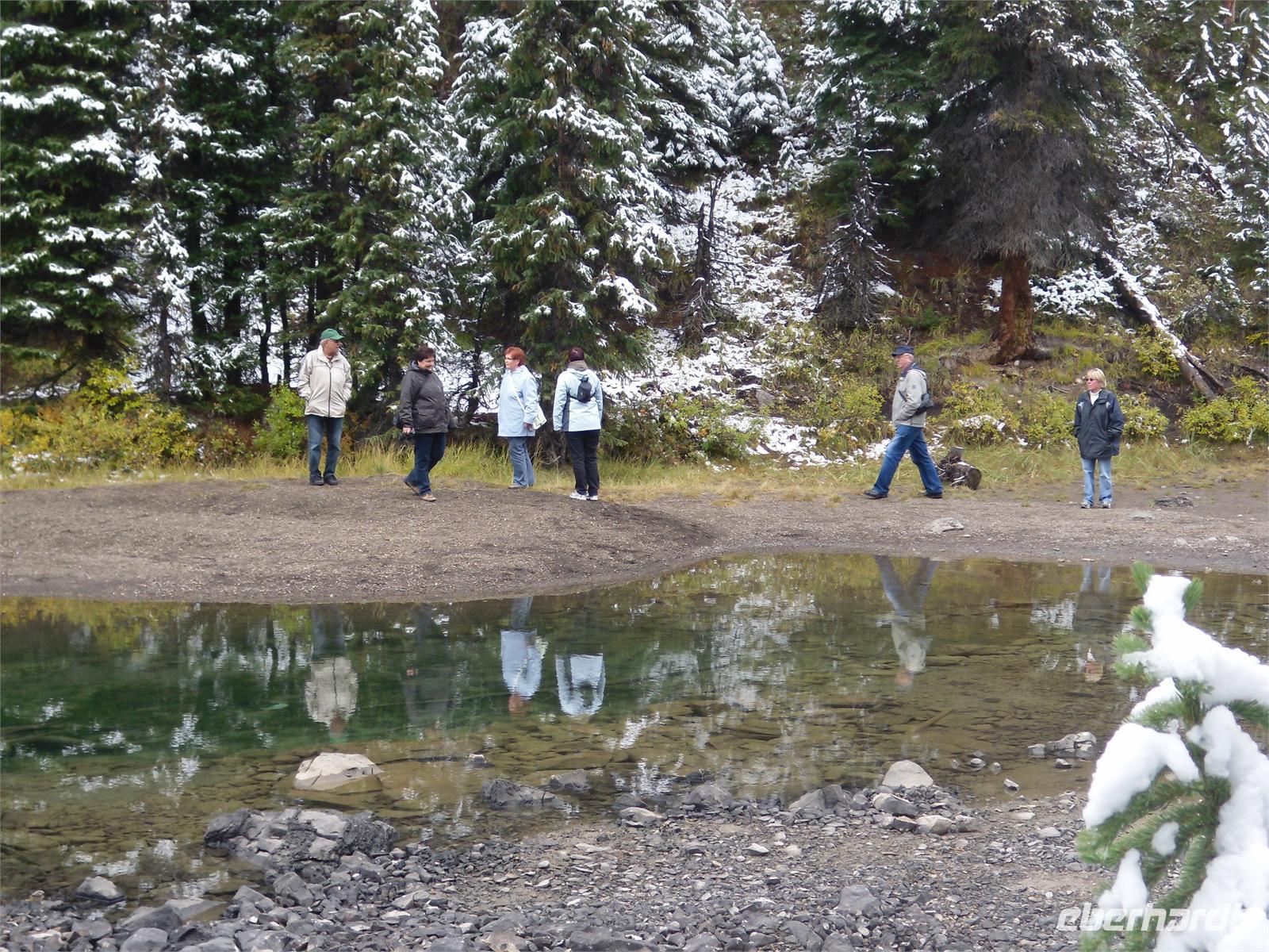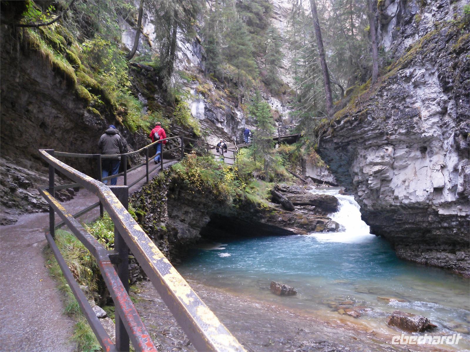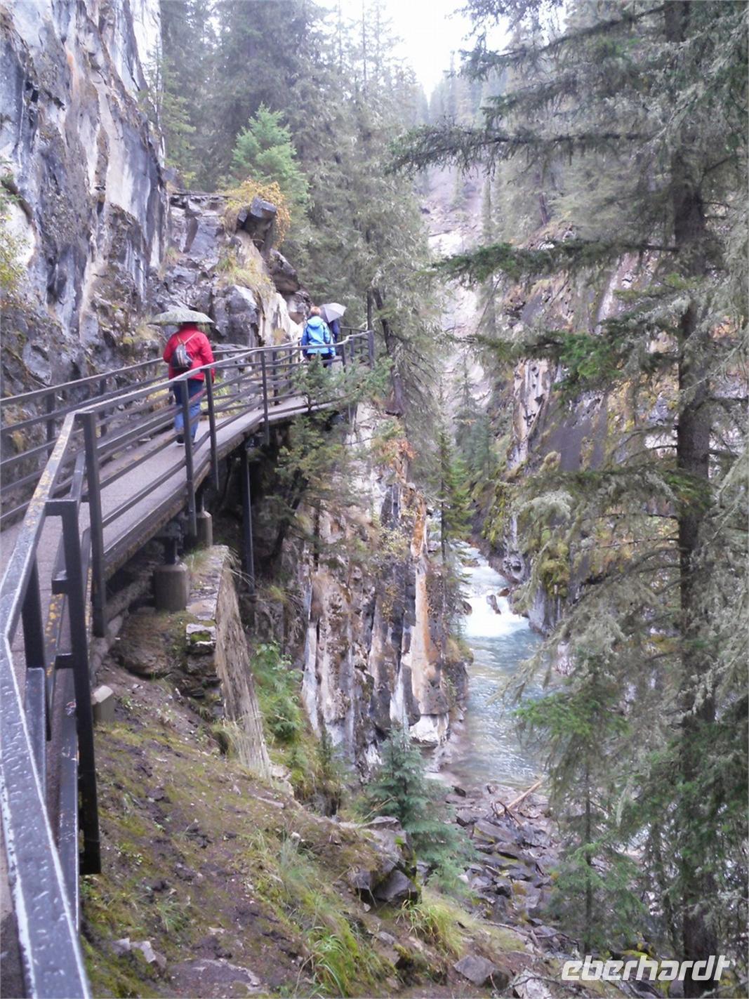 Nachdem wir kurz durch den Banff-Nationalpark gefahren sind, steht an diesem Tag zunächst der Besuch des Yoho-Nationalparks auf dem Programm. Unseren ersten Stopp legen wir an den Spiral Tunnels ein. Hier beobachten wir, wie sich ein Personenzug spiralförmig durch die verschiedenen Tunnel schlängelt. Die plastische Darstellung und mehrere Hinweistafeln geben Informationen zu dieser Stelle. Unsere Weiterfahrt erfolgt entlang des Flusses Kicking Horse auf dem Trans-Canada-Highway. Als nächstes kommen wir am Emerald Lake, dem größten der 61 Seen und Teiche im Yoho-Nationalpark, an. Hier nutzen wir die Gelegenheit, um ein Stück entlang des Sees zu laufen. Leider regnet es leicht und die Sicht ist sehr trübe. Danach besuchen wir die Natural Bridge im Kicking Horse Tal. Kurze Zeit später verlassen wir den Yoho-Nationalpark und fahren in den Banff-Nationalpark ein. Hier kommen wir am Johnston Canyon an und unternehmen eine kleine Wanderung durch die Schlucht. Nach ca. 1,1 Kilometern gelangen wir zu den Lower Falls, die sich rund zehn Meter in die Tiefe stürzen.