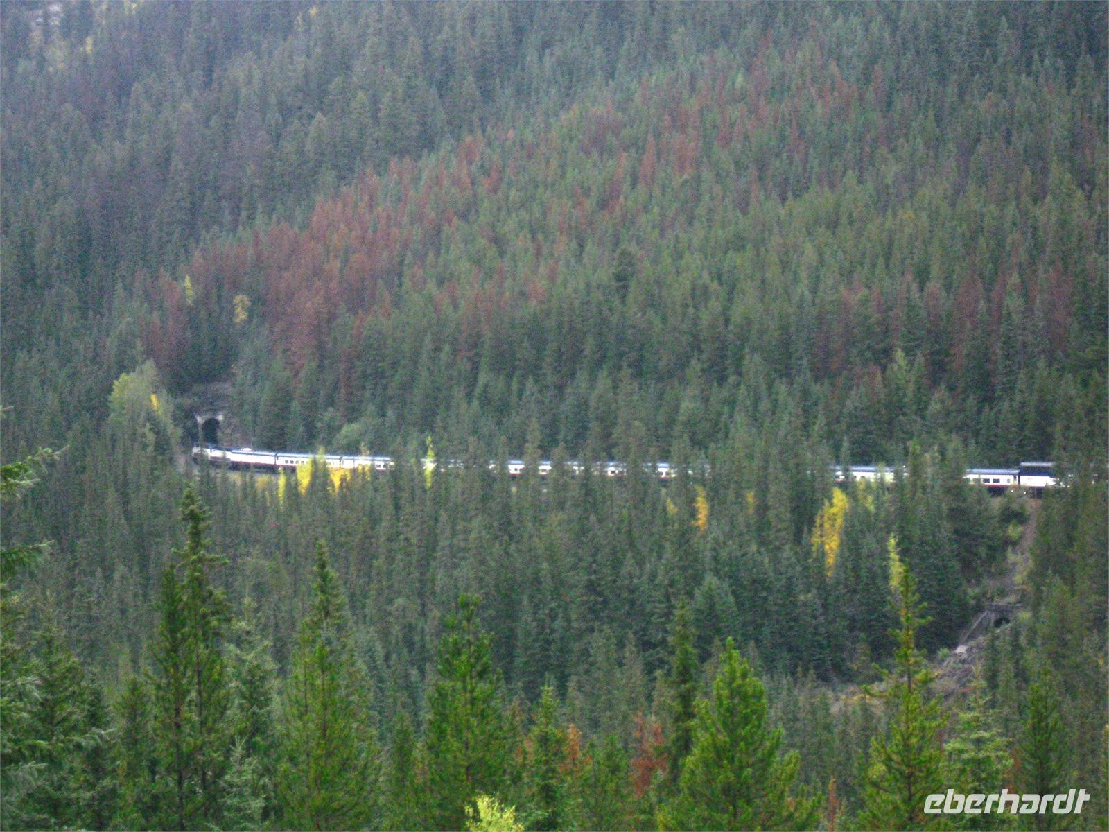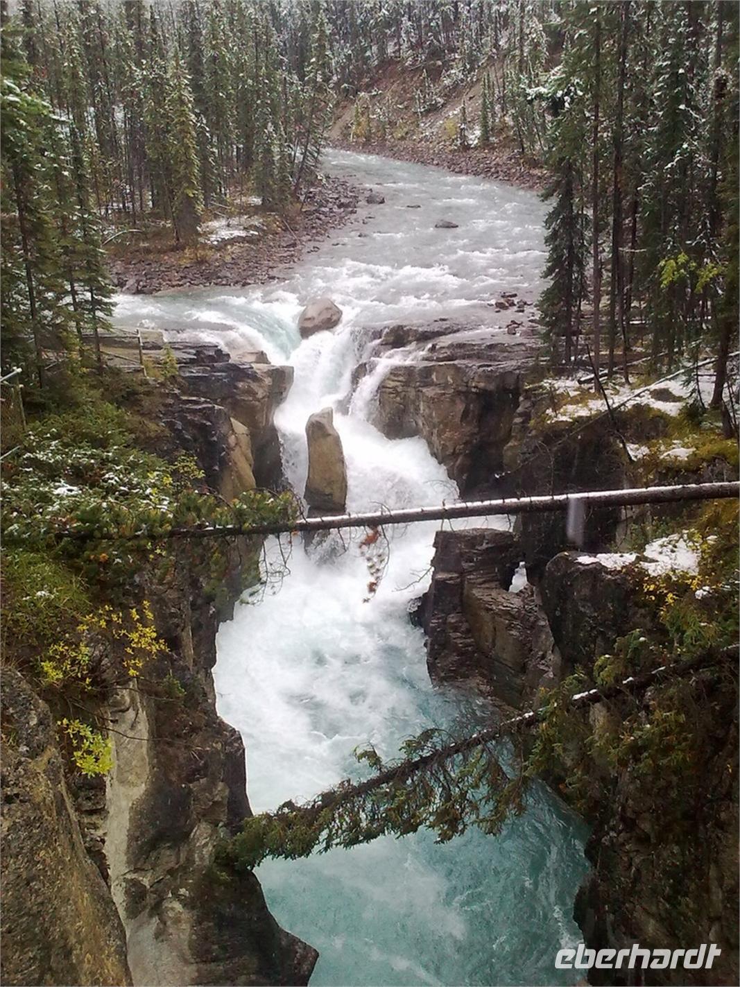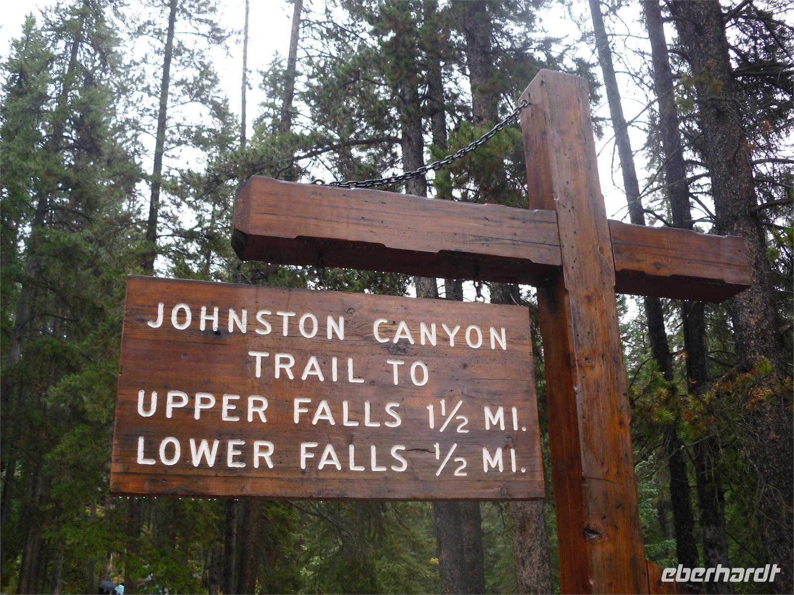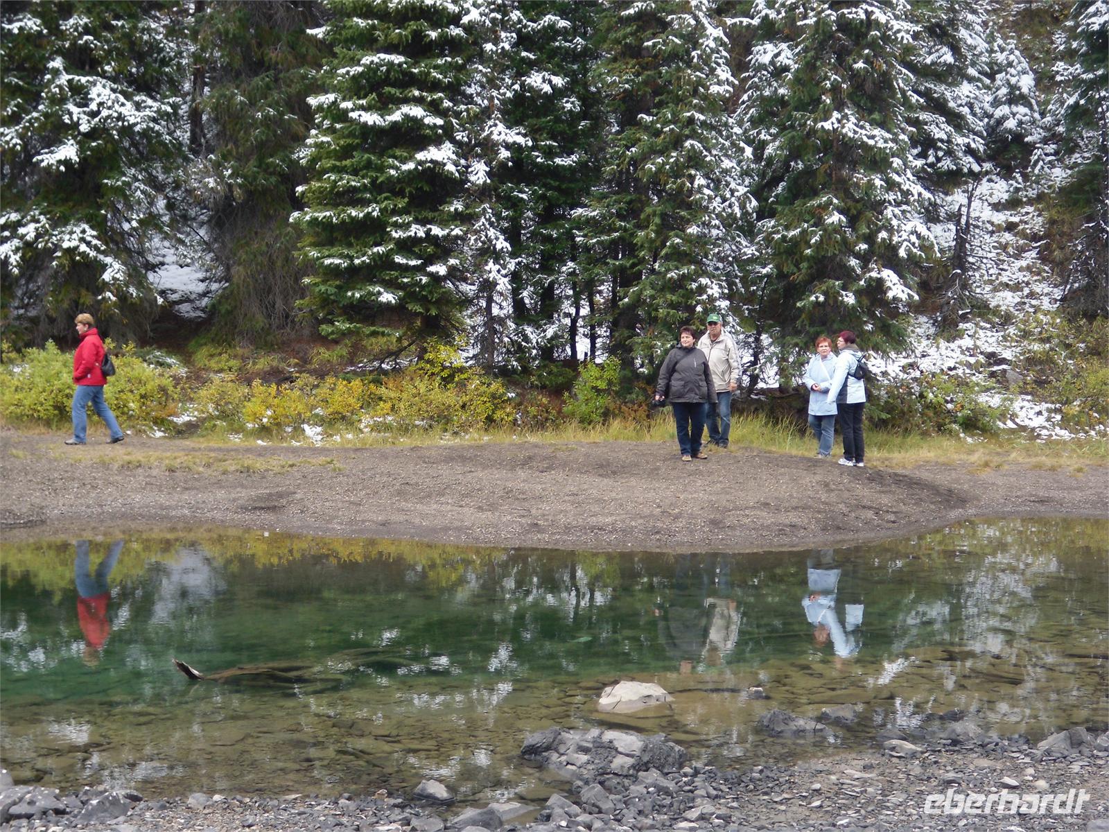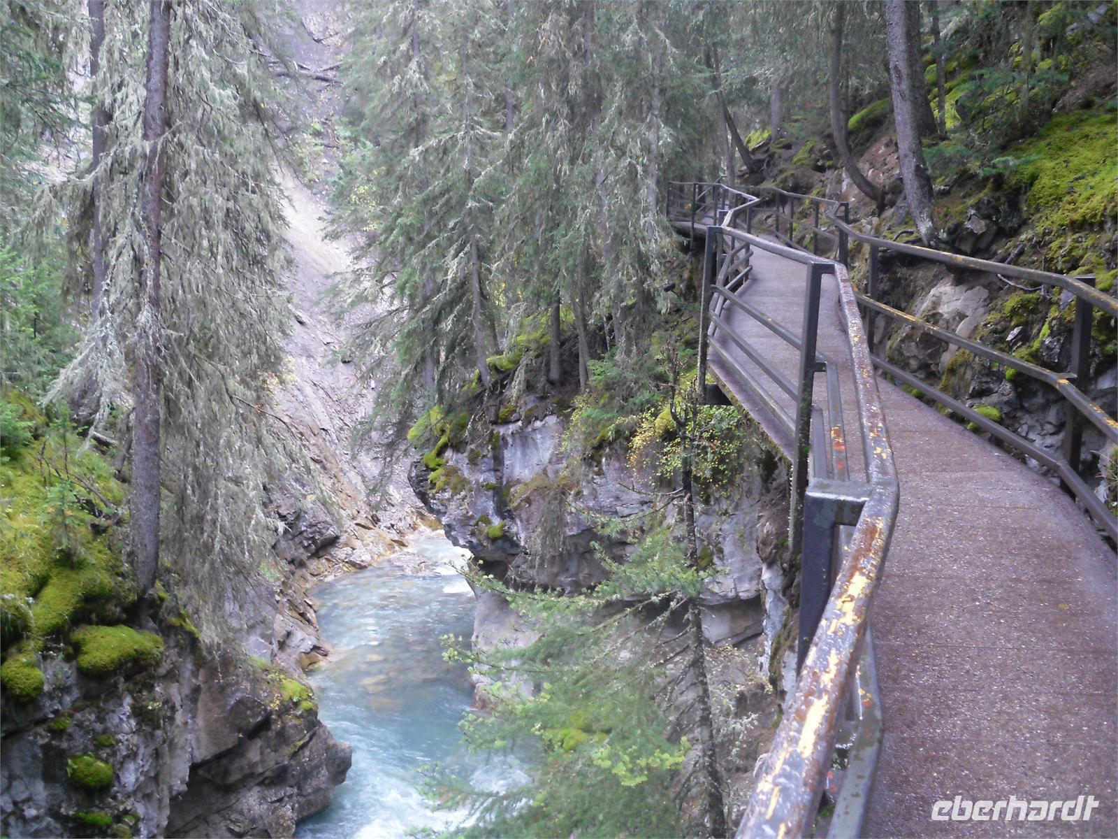 Nachdem wir kurz durch den Banff-Nationalpark gefahren sind, steht an diesem Tag zunächst der Besuch des Yoho-Nationalparks auf dem Programm. Unseren ersten Stopp legen wir an den Spiral Tunnels ein. Hier beobachten wir, wie sich ein Personenzug spiralförmig durch die verschiedenen Tunnel schlängelt. Die plastische Darstellung und mehrere Hinweistafeln geben Informationen zu dieser Stelle. Unsere Weiterfahrt erfolgt entlang des Flusses Kicking Horse auf dem Trans-Canada-Highway. Als nächstes kommen wir am Emerald Lake, dem größten der 61 Seen und Teiche im Yoho-Nationalpark, an. Hier nutzen wir die Gelegenheit, um ein Stück entlang des Sees zu laufen. Leider regnet es leicht und die Sicht ist sehr trübe. Danach besuchen wir die Natural Bridge im Kicking Horse Tal. Kurze Zeit später verlassen wir den Yoho-Nationalpark und fahren in den Banff-Nationalpark ein. Hier kommen wir am Johnston Canyon an und unternehmen eine kleine Wanderung durch die Schlucht. Nach ca. 1,1 Kilometern gelangen wir zu den Lower Falls, die sich rund zehn Meter in die Tiefe stürzen.