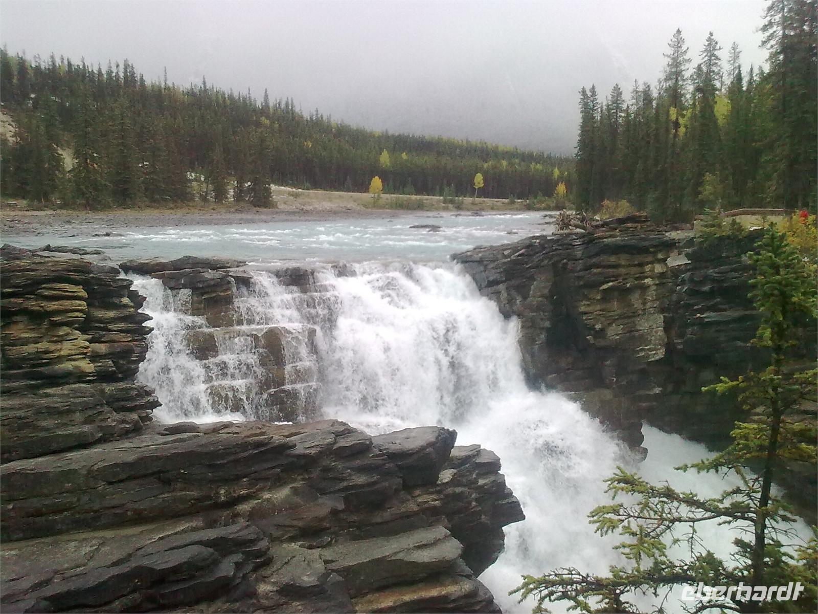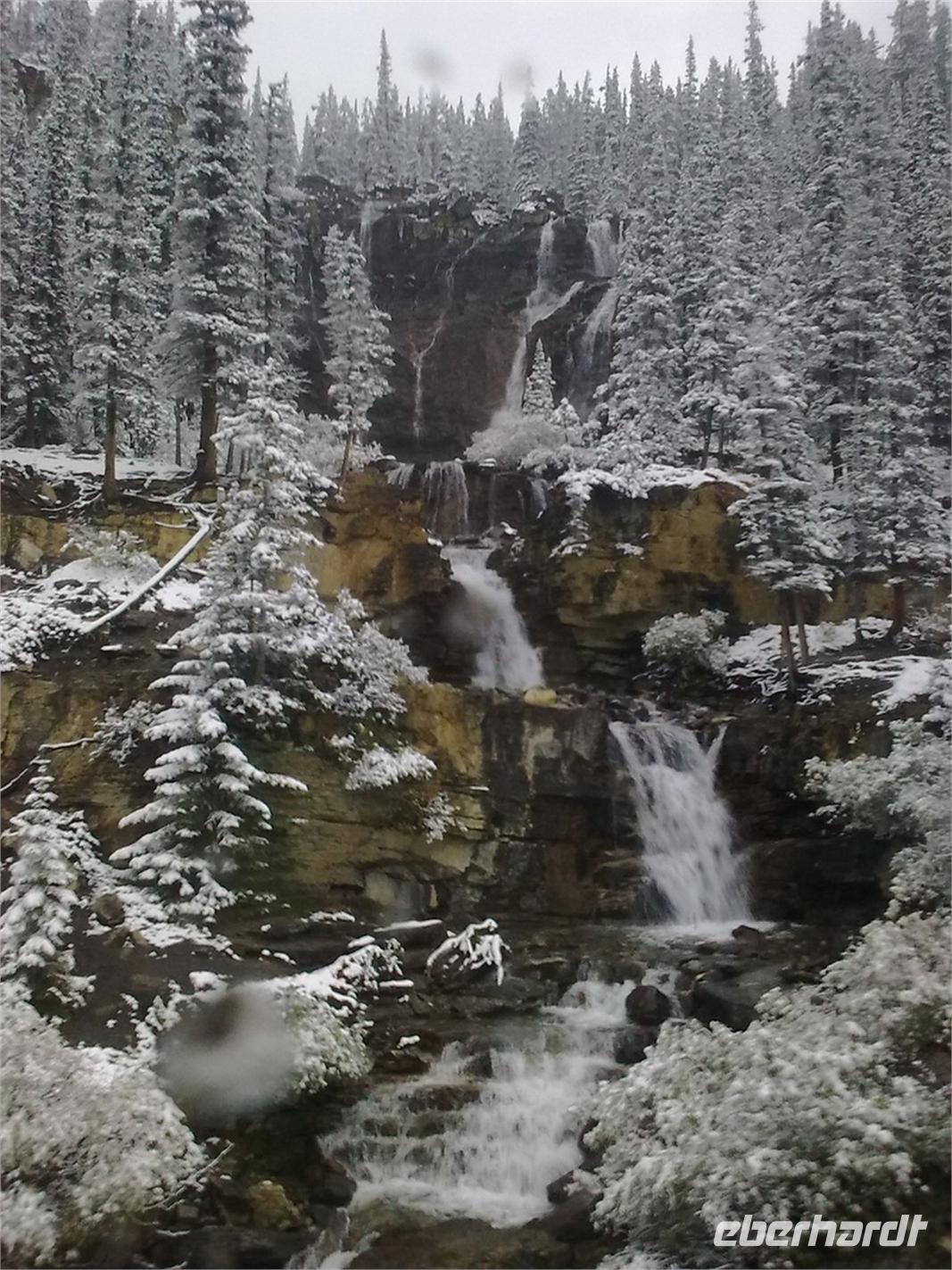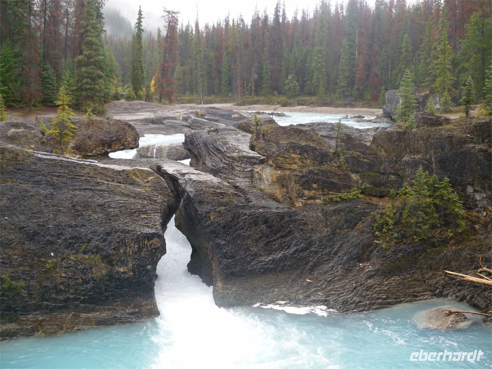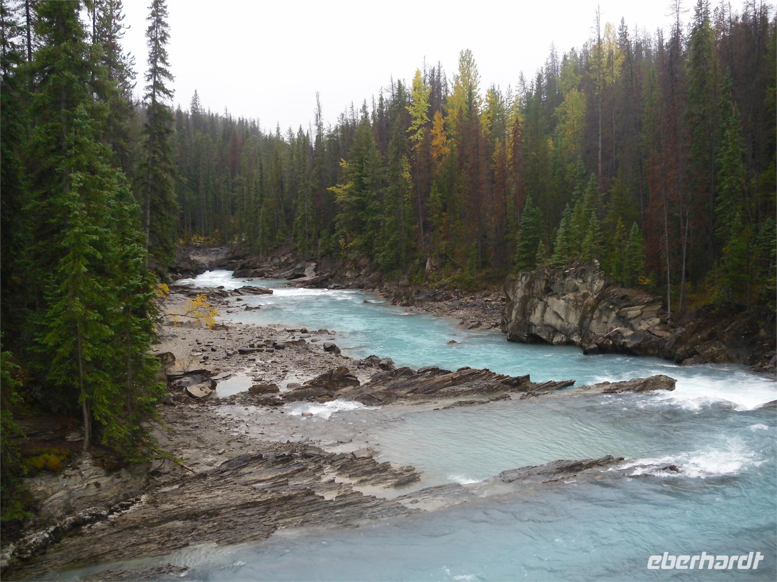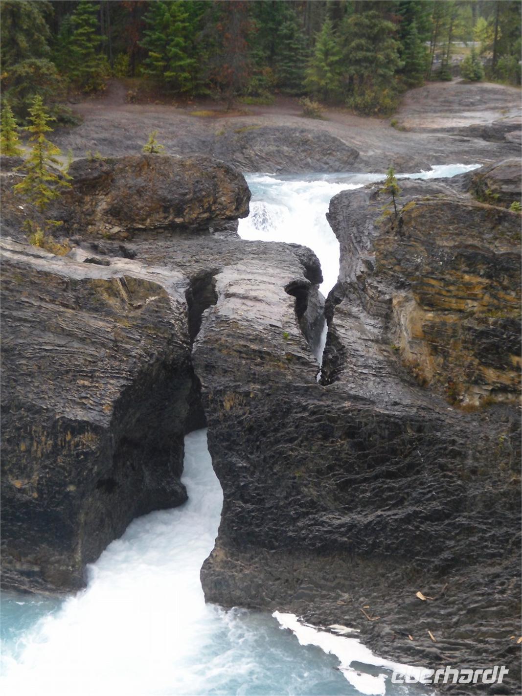 Nachdem wir kurz durch den Banff-Nationalpark gefahren sind, steht an diesem Tag zunächst der Besuch des Yoho-Nationalparks auf dem Programm. Unseren ersten Stopp legen wir an den Spiral Tunnels ein. Hier beobachten wir, wie sich ein Personenzug spiralförmig durch die verschiedenen Tunnel schlängelt. Die plastische Darstellung und mehrere Hinweistafeln geben Informationen zu dieser Stelle. Unsere Weiterfahrt erfolgt entlang des Flusses Kicking Horse auf dem Trans-Canada-Highway. Als nächstes kommen wir am Emerald Lake, dem größten der 61 Seen und Teiche im Yoho-Nationalpark, an. Hier nutzen wir die Gelegenheit, um ein Stück entlang des Sees zu laufen. Leider regnet es leicht und die Sicht ist sehr trübe. Danach besuchen wir die Natural Bridge im Kicking Horse Tal. Kurze Zeit später verlassen wir den Yoho-Nationalpark und fahren in den Banff-Nationalpark ein. Hier kommen wir am Johnston Canyon an und unternehmen eine kleine Wanderung durch die Schlucht. Nach ca. 1,1 Kilometern gelangen wir zu den Lower Falls, die sich rund zehn Meter in die Tiefe stürzen.