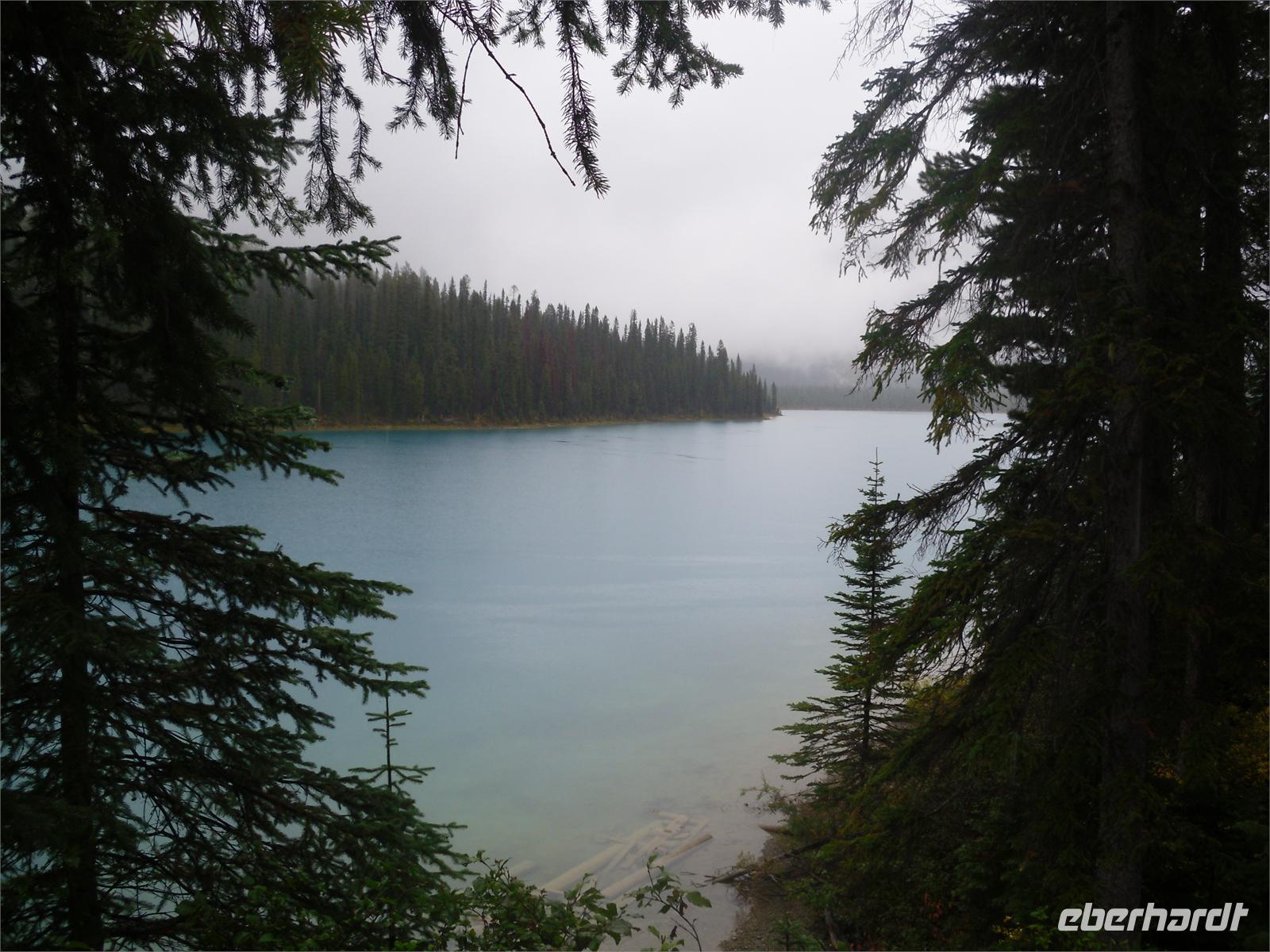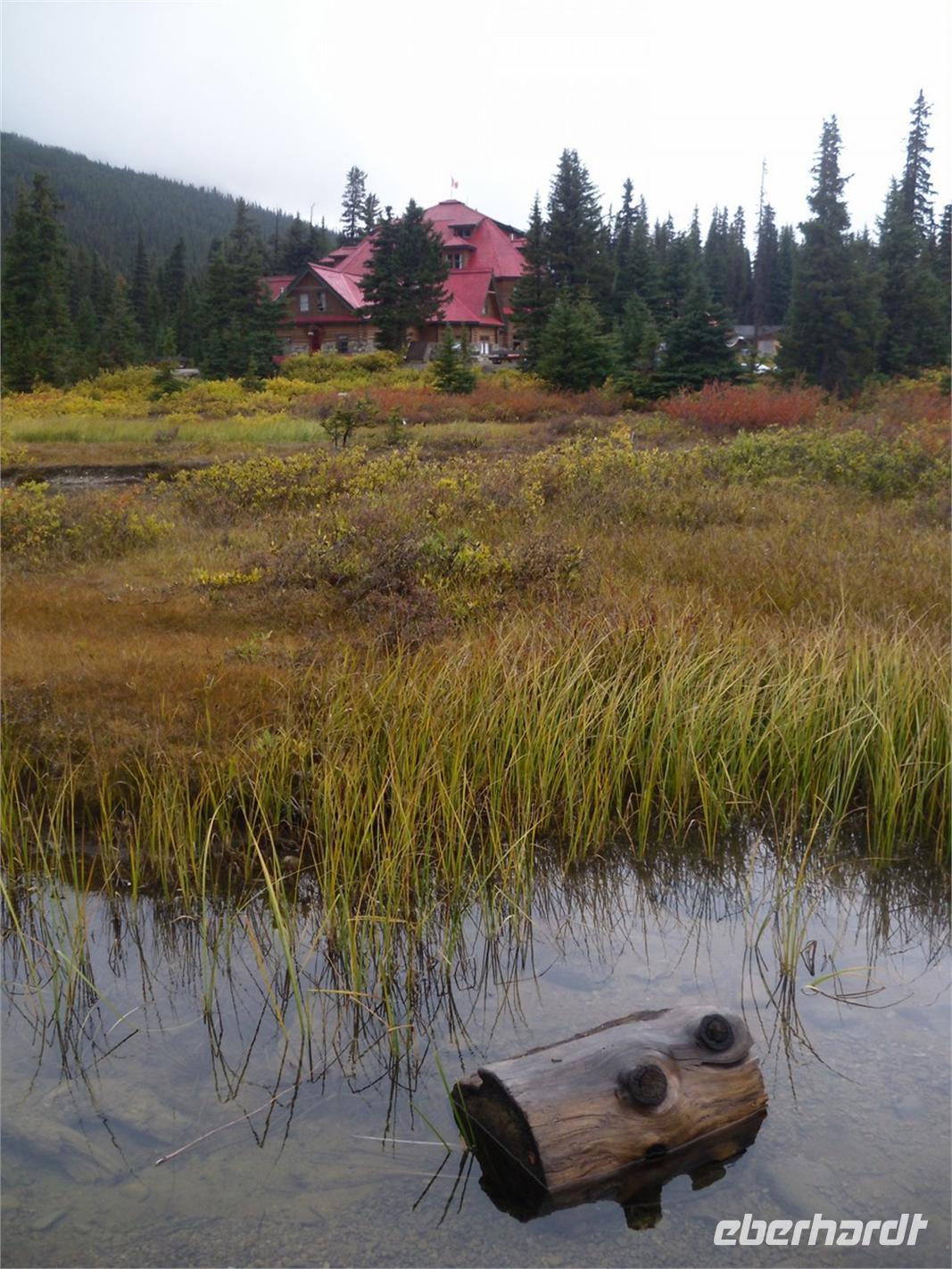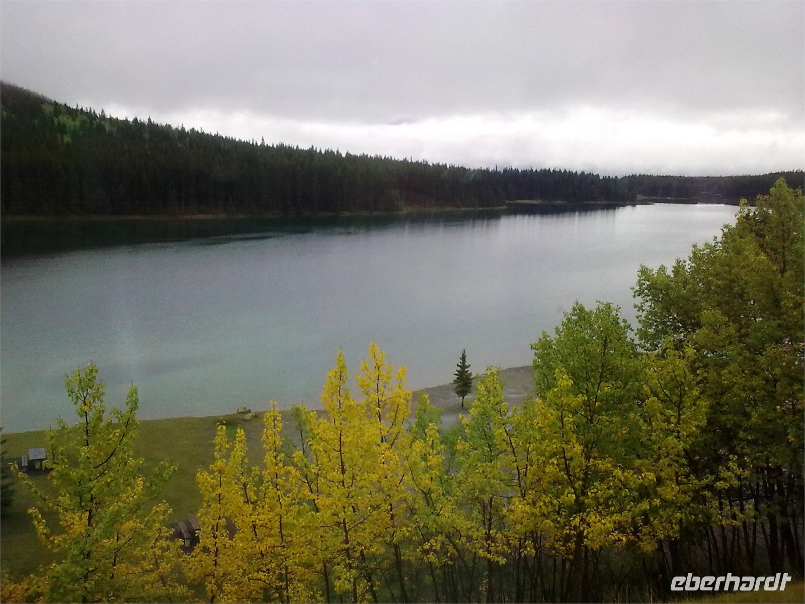 Auch wir knipsen mehrere Bilder dieses herrlichen Gewässers, welches nach einer Tochter von Königin Victoria benannt ist. Eines müssen wir aber alle feststellen: Die Berge im Hintergrund fehlen! Eigentlich müssten wir an dieser Stelle die schneebedeckten Gipfel von Mount Temple, Mount Whyte und Mount Niblock sehen können. Schade! Neben dem See thront das Chateau Lake Louise, ein weiteres Luxushotel, welches im Auftrag der Canadian Pacific Railway erbaut wurde. Wir schauen uns die öffentlichen Räume des Hotels an und stöbern in den Souvenirshops. Am Bahnhof von Lake Louise legen wir den nächsten Stopp ein. Hier kommt gerade ein ellenlanger Güterzug vorbei, sodass wir fototechnisch voll auf unsere Kosten kommen. Zur Mittagszeit kommen wir am Bow Lake an, der auf einer Höhe von 1.920 Metern liegt. Es regnet mal wieder in Strömen, deshalb planen wir nur einen kurzen Aufenthalt und fahren weiter zur Bow Summit, die uns eigentlich einen weiteren Blick auf den Bow Lake schenken soll. Leider ist der Nebel so dicht, dass es rein gar nichts zu sehen gibt.