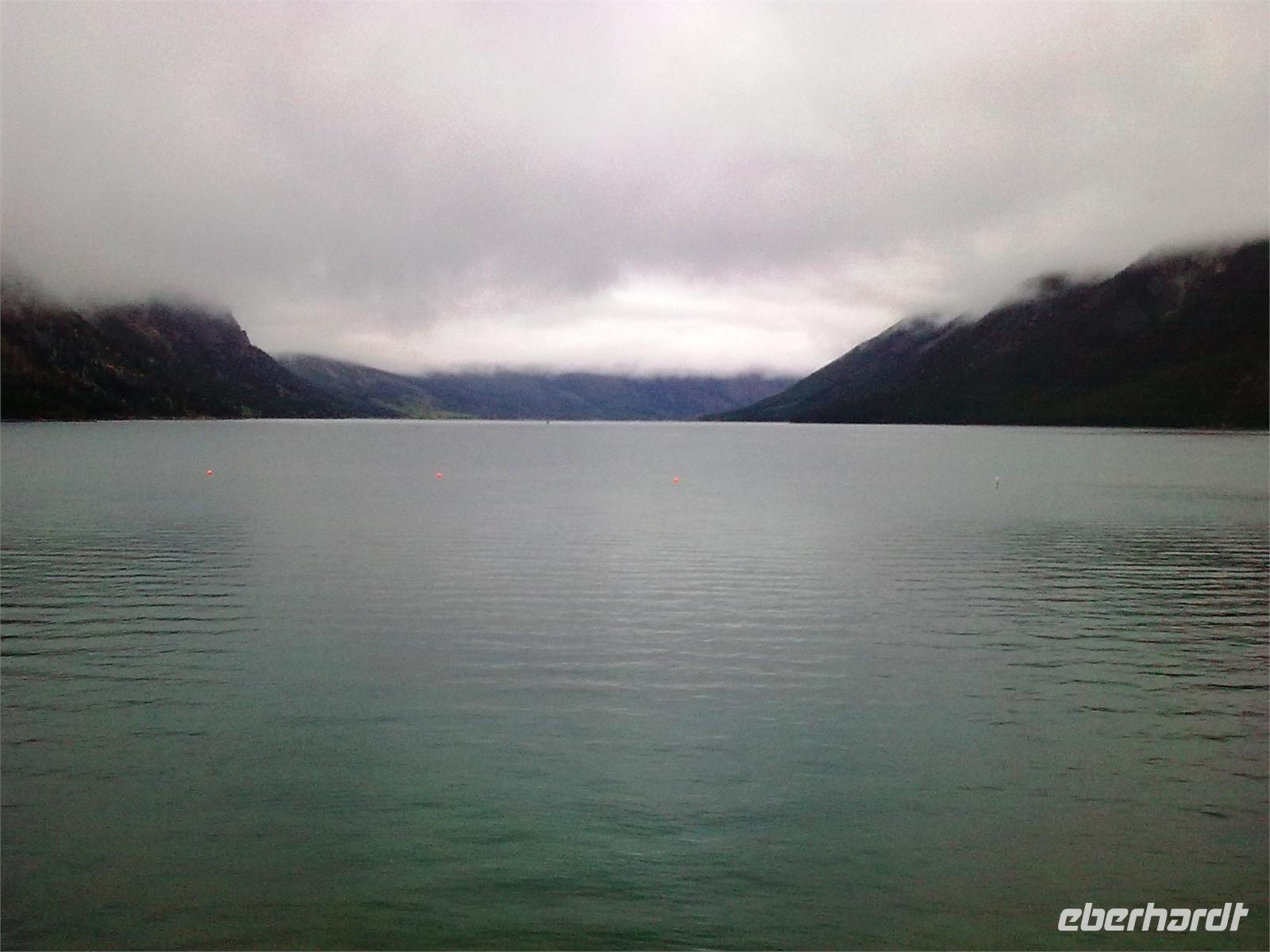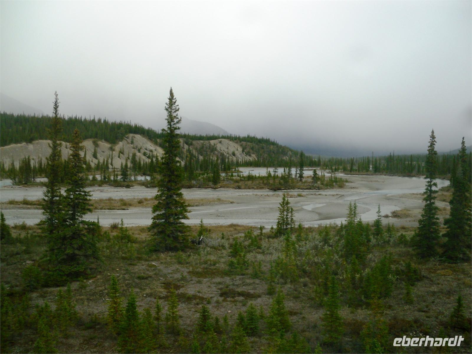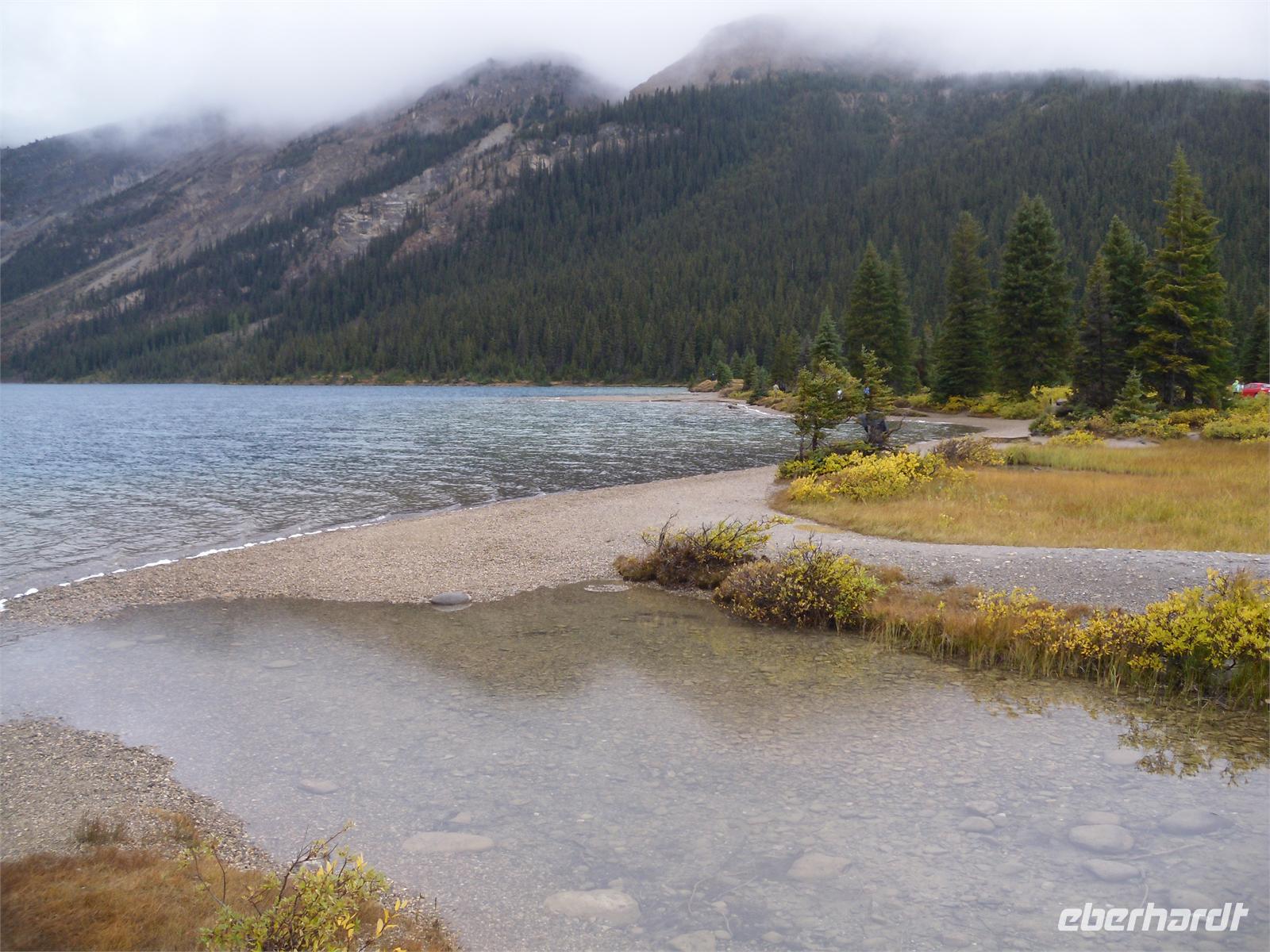 Auch wir knipsen mehrere Bilder dieses herrlichen Gewässers, welches nach einer Tochter von Königin Victoria benannt ist. Eines müssen wir aber alle feststellen: Die Berge im Hintergrund fehlen! Eigentlich müssten wir an dieser Stelle die schneebedeckten Gipfel von Mount Temple, Mount Whyte und Mount Niblock sehen können. Schade! Neben dem See thront das Chateau Lake Louise, ein weiteres Luxushotel, welches im Auftrag der Canadian Pacific Railway erbaut wurde. Wir schauen uns die öffentlichen Räume des Hotels an und stöbern in den Souvenirshops. Am Bahnhof von Lake Louise legen wir den nächsten Stopp ein. Hier kommt gerade ein ellenlanger Güterzug vorbei, sodass wir fototechnisch voll auf unsere Kosten kommen. Zur Mittagszeit kommen wir am Bow Lake an, der auf einer Höhe von 1.920 Metern liegt. Es regnet mal wieder in Strömen, deshalb planen wir nur einen kurzen Aufenthalt und fahren weiter zur Bow Summit, die uns eigentlich einen weiteren Blick auf den Bow Lake schenken soll. Leider ist der Nebel so dicht, dass es rein gar nichts zu sehen gibt.