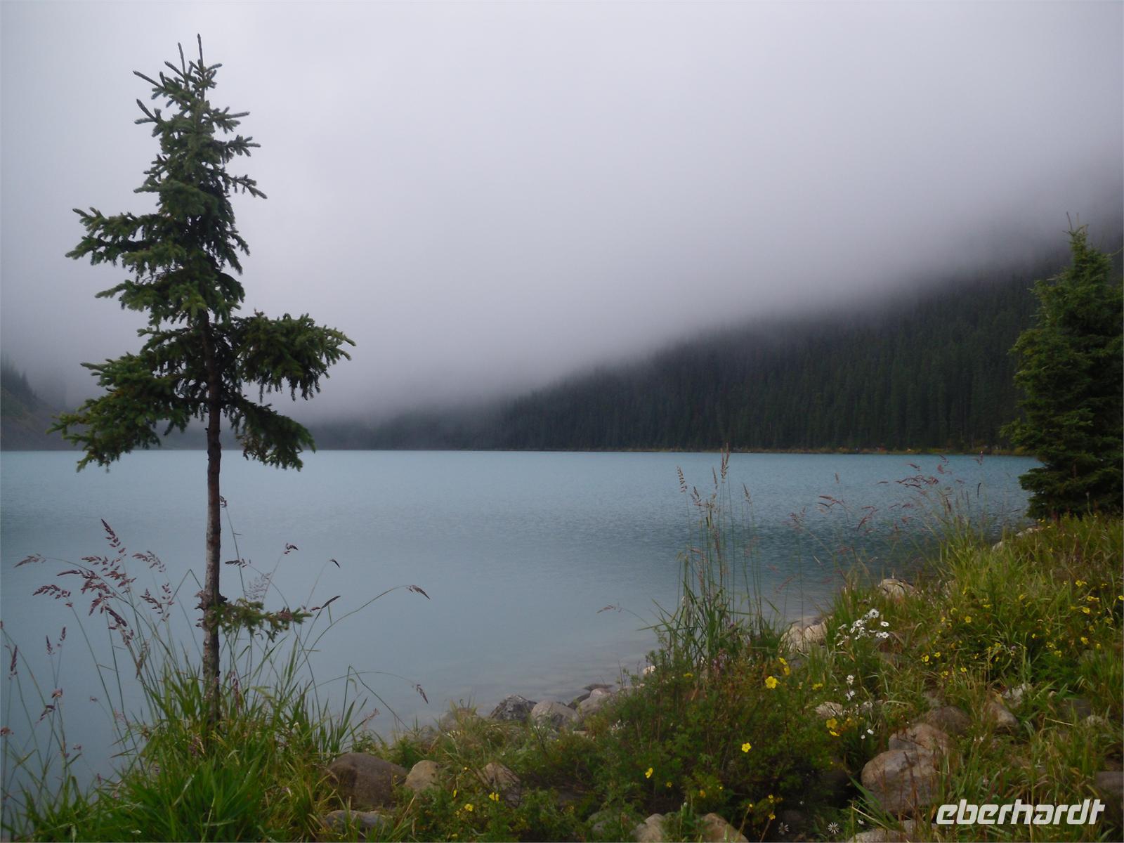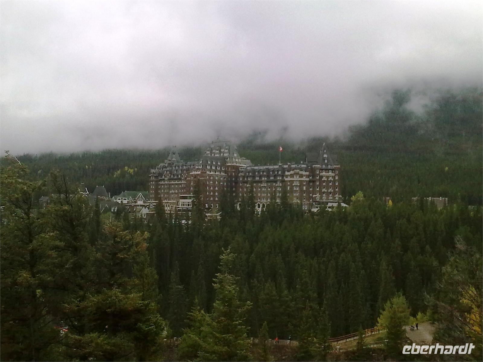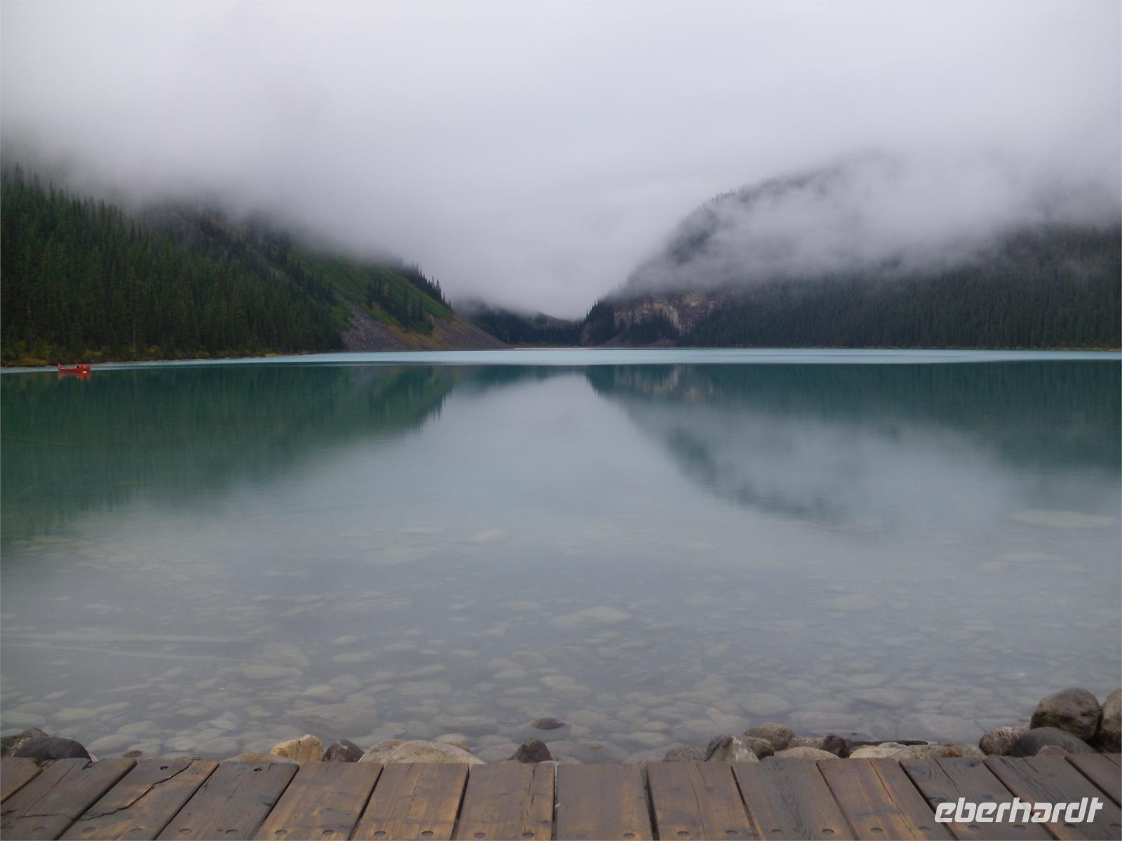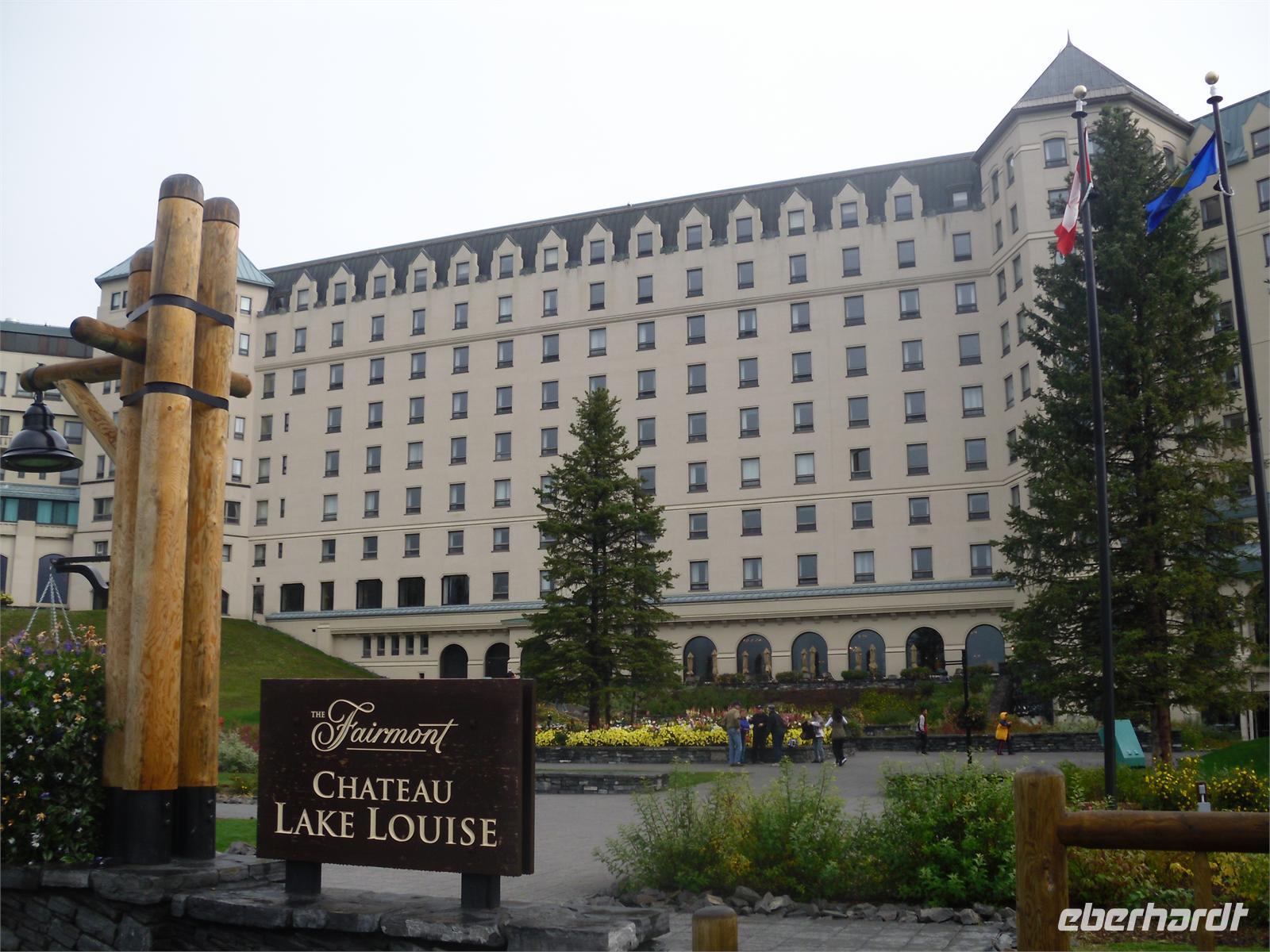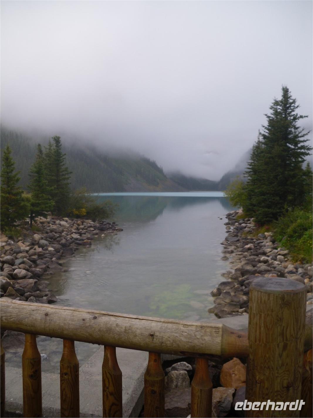 Der heutige Tag beginnt nach dem Frühstück mit der Fahrt zum Lake Louise. Zwar regnet es gerade nicht mehr, aber es ist trotzdem bewölkt und keine Berge zu sehen. Der Lake Louise ist mit seinem türkisblauen Wasser ein beliebtes Postkartenmotiv.