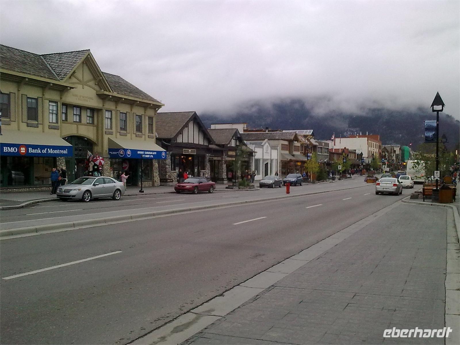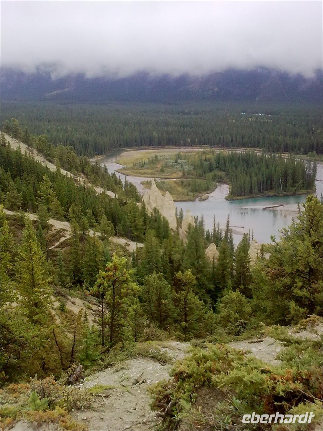 Leider haben wir nicht genügend Zeit, um uns die noch beeindruckenderen Upper Falls anzuschauen. Diese sind ungefähr 30 Meter hoch. Am Eingang der Schlucht befindet sich ein Häuschen mit Souvenirshop, indem wir auch unsere Mittagspause einlegen. Danach machen wir einen kurzen Halt am Two Jack Lake, um ein paar Fotos zu schießen. Außerdem kommen wir noch am Lake Minnewanka vorbei, für den es sich ebenfalls lohnt, auf den Auslöser zu drücken. Mit seinen 28 Kilometern Länge ist er der längste See in den kanadischen Rockies. Leider sind alle unsere Fotos ohne Berge, dafür aber mit einem trüben Graustich versehen. Sonne, wo bleibst du? Nach der Weiterfahrt durch das Gebiet Bankhead, durchqueren wir am Nachmittag den kleinen Tourismusort Banff. Hier fahren wir an dem Luxushotel „Fairmont Banff Springs" vorbei, welches ebenfalls von Canadian Pacific Railway errichtet wurde. Nach einem weiteren Fotostopp an den Bow Falls, fahren wir entlang des Tunnel Mountain Drives zu den Hoodoos, den beeindruckenden Gesteinssäulen aus Kalkstein. Hier unternehmen wir erneut einen kurzen Spaziergang, um wenig später in Banff zu stoppen. Dieser kleine Ort zählt zu den beliebtesten Zielen Kanadas. Hier haben wir eine Stunde Zeit, um ein paar Erledigungen zu tätigen und in den vielen Souvenirshops einzukaufen. Am Abend kehren wir im „Ticino Swiss-Italian Restaurant" ein. Von einer freundlichen, Deutsch sprechenden Bedienung bekommen wir leckeres Kalbfleisch mit Nudeln und Möhrengemüse serviert. Nach der Heimfahrt zum Hotel entscheiden wir uns für einen spontanen DVD-Abend über die Rocky Mountains. Wenn wir sie schon nicht in natura sehen können, dann doch wenigstens im Fernseher.