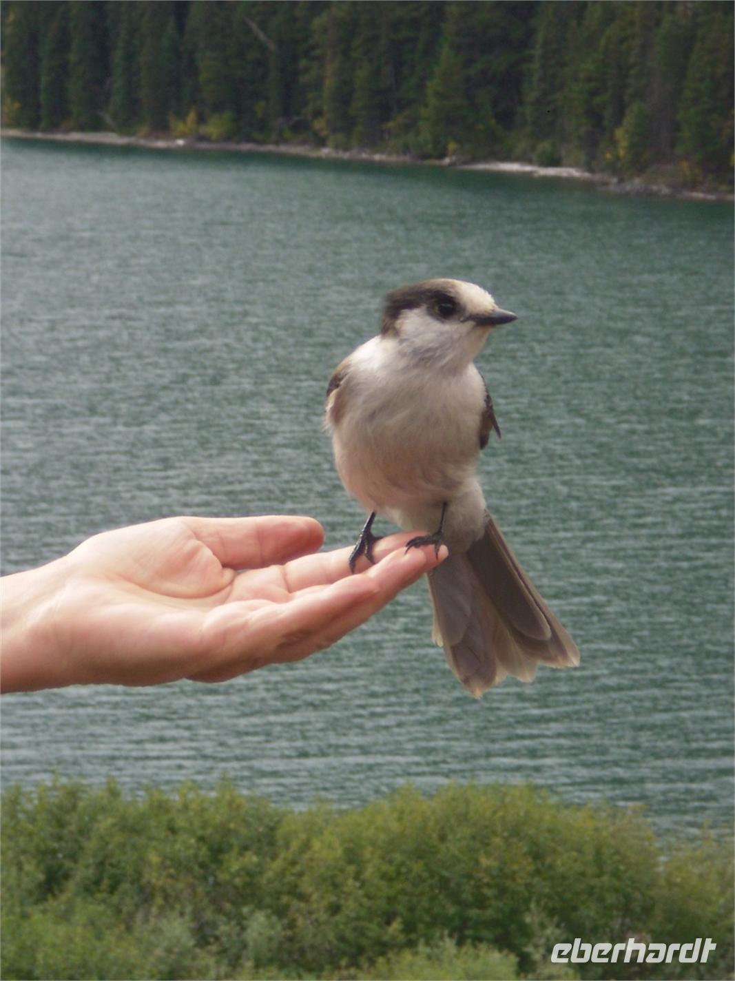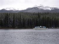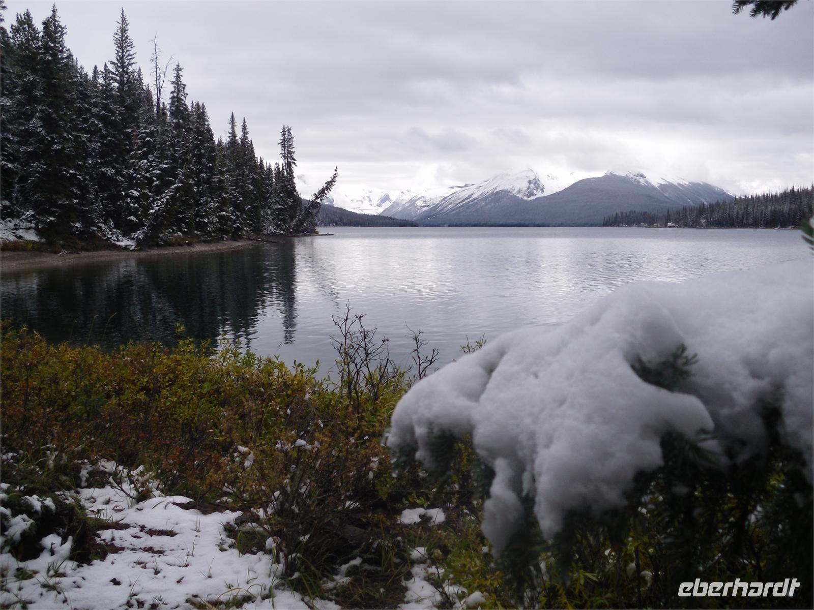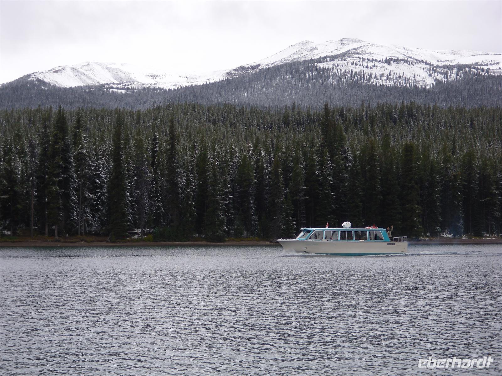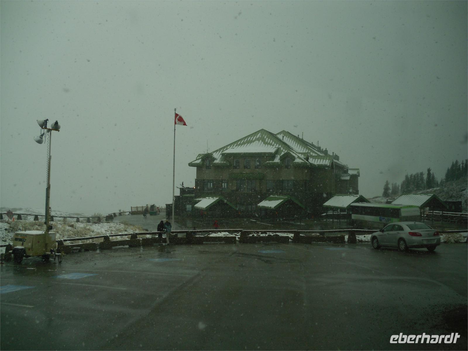 Wenig später kommen wir am Maligne Canyon an und schießen mal wieder viele Fotos. Unseren nächsten Fotostopp legen wir am Medicine Lake ein, bevor wir wenig später am Maligne Lake eintreffen. Diesmal haben wir einige Maultierrehe neben der Straße fotografieren können. Am Maligne Lake sind es nur zwei Grad Celsius, insofern kommt uns die Wanderung entlang des Seeufers auf dem Mary Schaffer Loop gerade recht. Von hier aus bieten sich uns ebenfalls viele hübsche Fotomotive. Einige Gäste wollen den See lieber per Boot entdecken und fahren unter anderem zur berühmten Spirit Island, welche eines der Wahrzeichen der kanadischen Rocky Mountains darstellt. Nachdem wir auch noch den Souvenirshop besucht und eine Kleinigkeit zu uns genommen haben, brechen wir nach Jasper auf. Dort angekommen, bleibt uns eine Stunde Freizeit, um diesen kleinen touristisch gut erschlossenen Ort zu besichtigen. Am zeitigen Nachmittag fahren wir zur Talstation der Jasper Tramway. Der Gipfel des Whistler's Mountains ist unser nächstes Ziel. Aufgeteilt auf zwei Gondeln, fahren wir in nur sieben Minuten auf den Berg hinauf. Als wir oben ankommen, stehen wir mitten im Schnee. Die Aussicht auf das Tal rund um Jasper ist fantastisch. Einige wenige Wolken versperren die vollständige Sicht, dafür machen sie sich auf den Fotos besonders gut. Hier auf dem Gipfel nehmen wir heute unser Abendessen, oder eher Nachmittagsessen, ein. Bei Lasagne, Kartoffeln und Lachs lassen wir es uns so richtig gut gehen. Leider ist der köstliche Kuchen, den es als Dessert gibt, viel zu schnell weggegessen. Am zeitigen Abend fahren wir wieder ins Tal hinab. Jetzt kommt sogar die Sonne hervor. Deshalb legen wir auf der Fahrt zum Hotel auch noch zwei Fotostopps ein: Den ersten am Athabasca-Pass und den zweiten mit Blick auf die Bergkette Winston Churchill. Wir übernachten wieder im Hotel „Sunwapta Falls Resort".