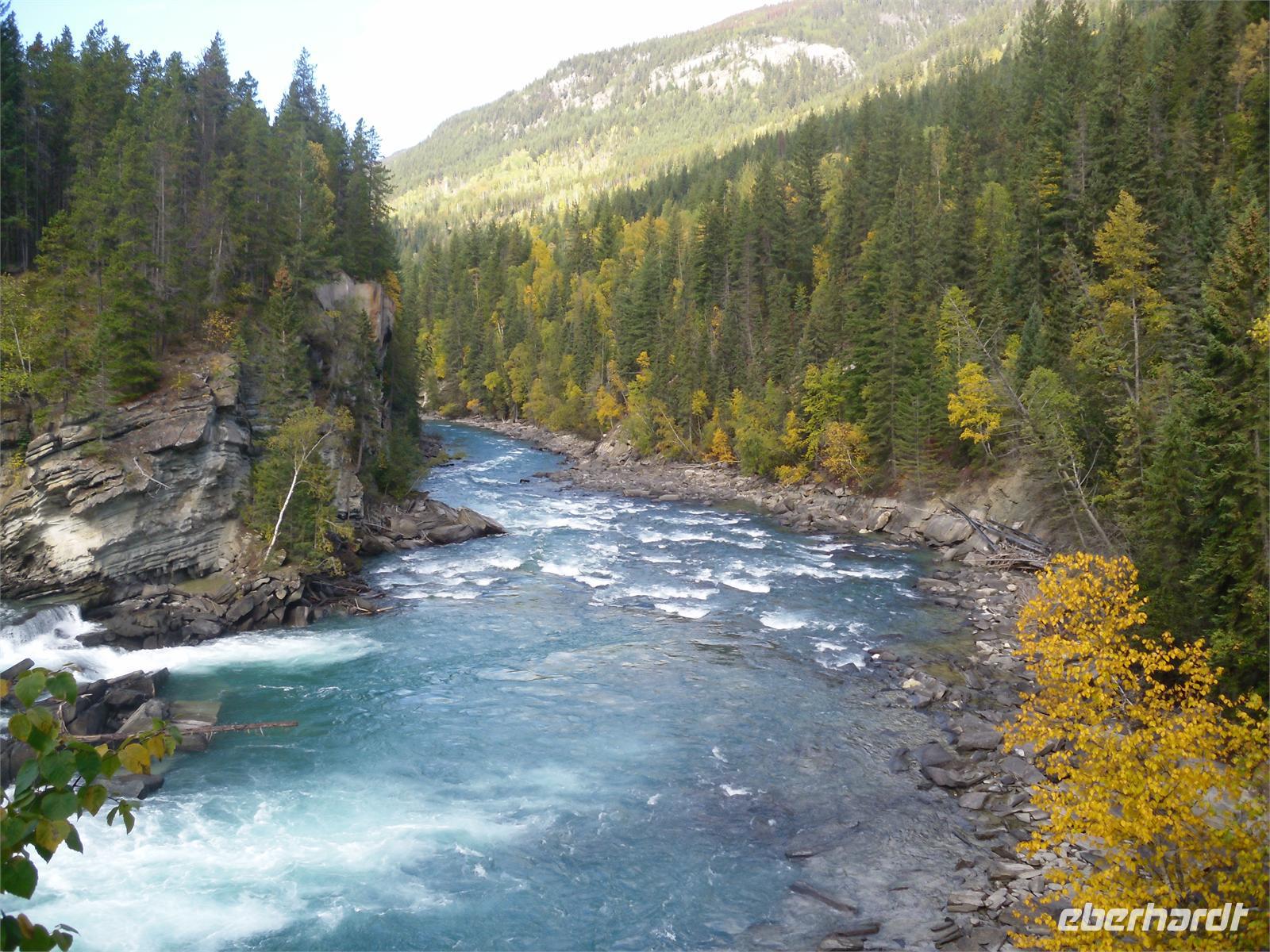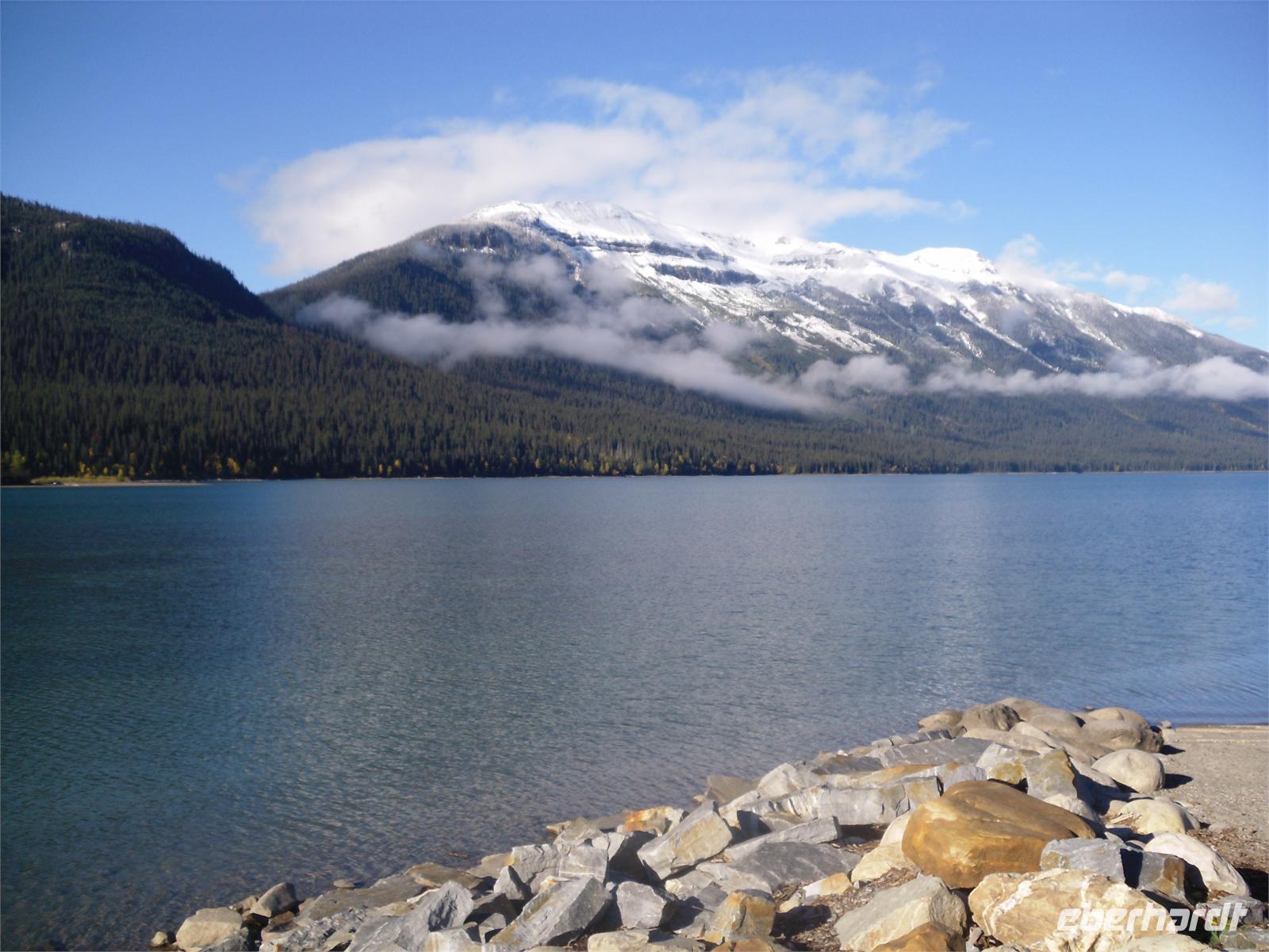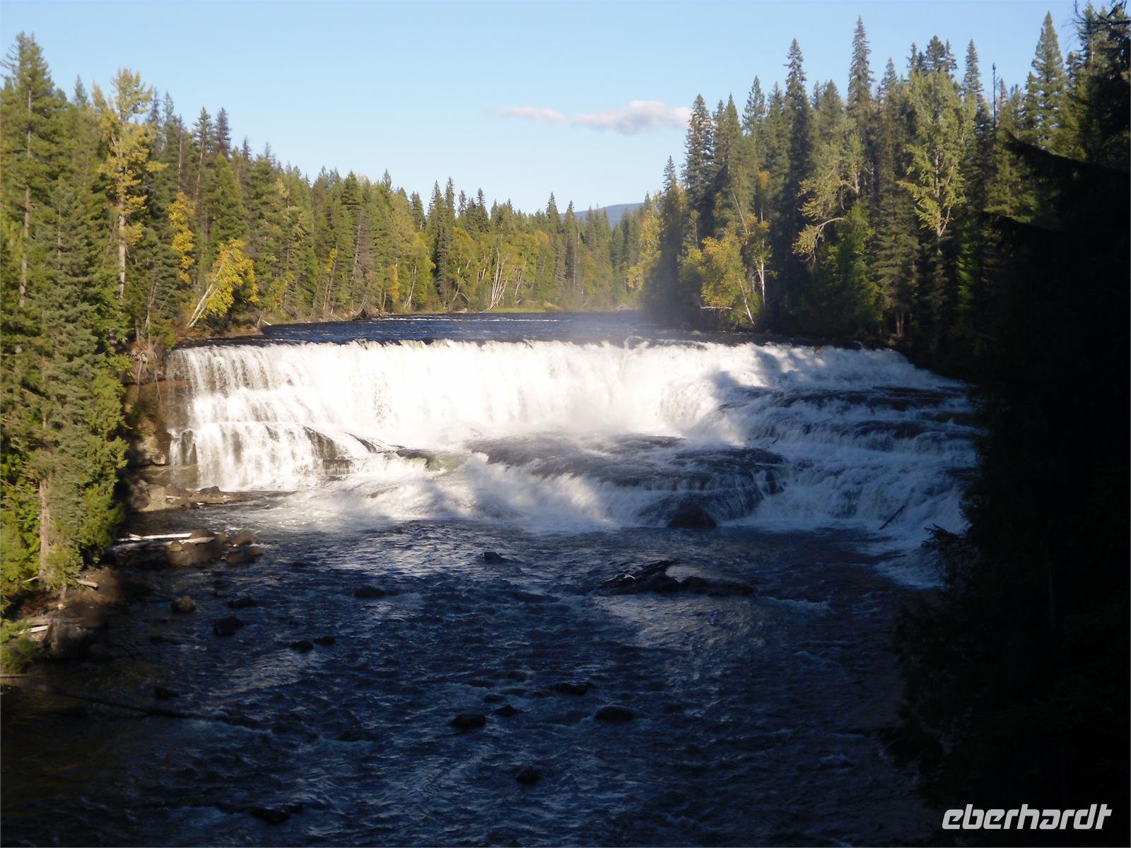 Wir verlassen damit die Provinz Alberta und fahren in die Provinz British Columbia ein, die wir bis zur Heimreise auch nicht mehr verlassen werden. Auf unserer Fahrt zum Mount Robson kommen wir nicht nur am Yellow Head Lake vorbei, sondern auch am Lake Whitney. Wir fahren entlang des Flusses Fraser und legen einen Fotostopp am Moose Lake ein. Dann kommen wir am Mount Robson an, der sich ganz plötzlich im Sonnenlicht badend vor uns aufbaut. Welch herrlicher Anblick! Er ist der höchste Berg im kanadischen Teil der Rockies, dessen Gipfel jährlich nur von einer Hand voll Bergsteiger erreicht wird. Hier gibt es auch ein hübsches Informationszentrum, indem wir uns mit vielen interessanten Prospekten eindecken. Mit vielen hübschen Fotomotiven in der Tasche machen wir uns auf zu den Rearguard Falls. Hier möchten wir eigentlich die berühmten Lachssprünge beobachten, aber leider ist weit und breit kein Fisch in Sicht. Trotzdem ist der Rearguard Fluss mit seinem reißenden, türkisblauen Wasser und umgeben von sich langsam gelb färbenden Bäumen ein schöner Anblick. Scheinbar noch beeindruckender sind aber die zwei riesigen Rotkappen,