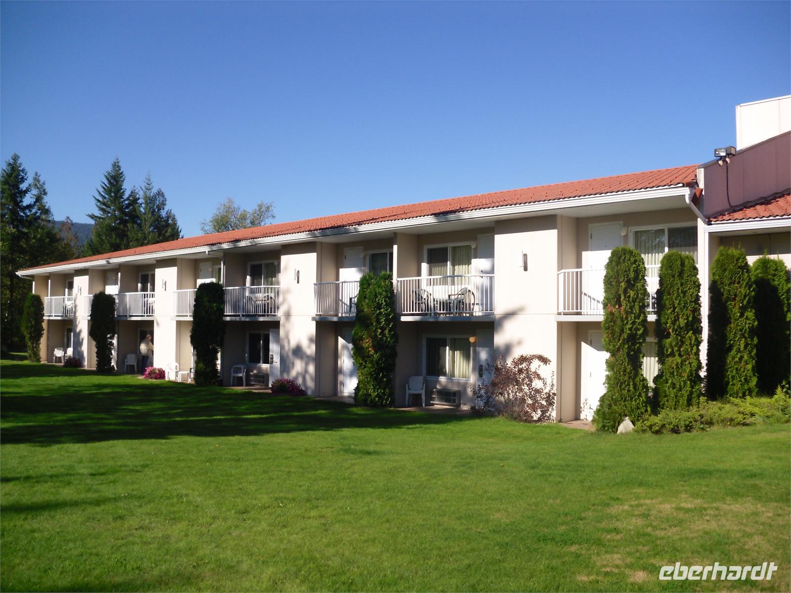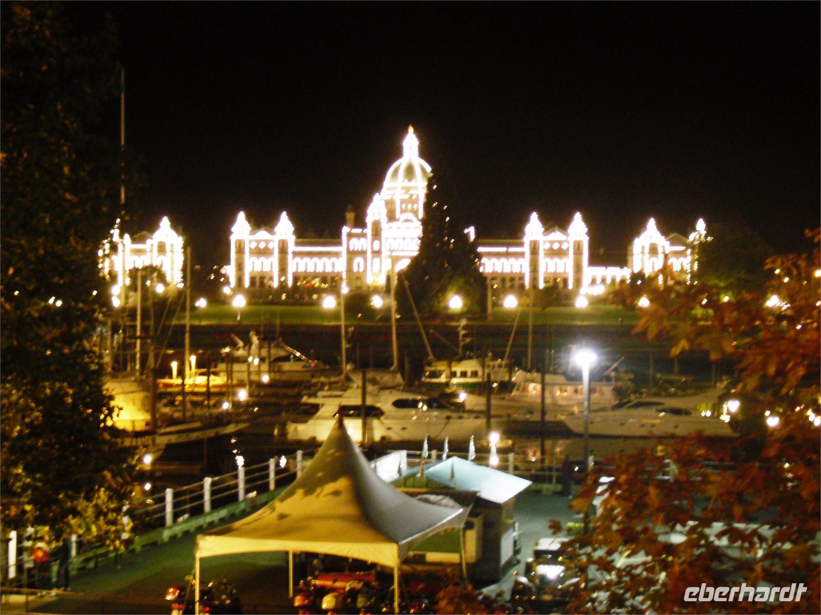 Es scheint zunächst sehr viel auf einmal zu sein, aber wir haben den nächsten Tag zur freien Verfügung, um alles genau ausfindig zu machen. Wir kommen unter anderem am Parlamentsgebäude vorbei, welches sich in der Nähe unseres Hotels befindet. Außerdem sehen wir das Empress Hotel und kommen an China Town vorbei. Etwas am Rande der Stadt fahren wir durch ein im viktorianischen Stil erbautes Wohngebiet mit vielen hübschen Häusern und stoßen am Ende der Straße auf die Meile 0 des Trans-Canada-Highways. Am späten Nachmittag checken wir in unser zentral gelegenes Hotel „Queen Victoria Inn" ein. Jetzt haben wir ein wenig Freizeit, in der wir entweder die nähere Umgebung des Hotels intensiver erkunden oder uns etwas ausruhen können. Am Abend treffen wir uns an der Rezeption, um gemeinsam zum Restaurant „Harbour Canoe Club" zu laufen. Das Restaurant ist ein Stückchen vom Hotel entfernt, doch wir genießen den Spaziergang durch die Innenstadt Victorias, immerhin haben wir heute wieder viel Zeit im Bus verbracht. Heute Abend essen wir in einem alten Backsteingebäude mit einem hohen Dachstuhl und dicken Balken aus Holz. Dadurch kommt eine besondere Atmosphäre zustande. Heute schlemmen wir wieder einmal wie die Götter. Los geht's mit leckerem Fladenbrot an Olivenöl und einem Blattspinat-Salat. Danach werden uns Lachs oder Steak mit Kartoffelbrei serviert. Als Krönung bekommen wir dann noch einen Schokokuchen mit Sahne vorgesetzt. Ausgezeichnet! Den Rückweg zum Hotel bestreiten wir entlang des Hafens. Schon von weitem ist das hübsch beleuchtete Parlamentsgebäude zu erkennen. Wir freuen uns schon auf den freien Tag in Victoria und schlafen in froher Erwartung genüsslich ein.