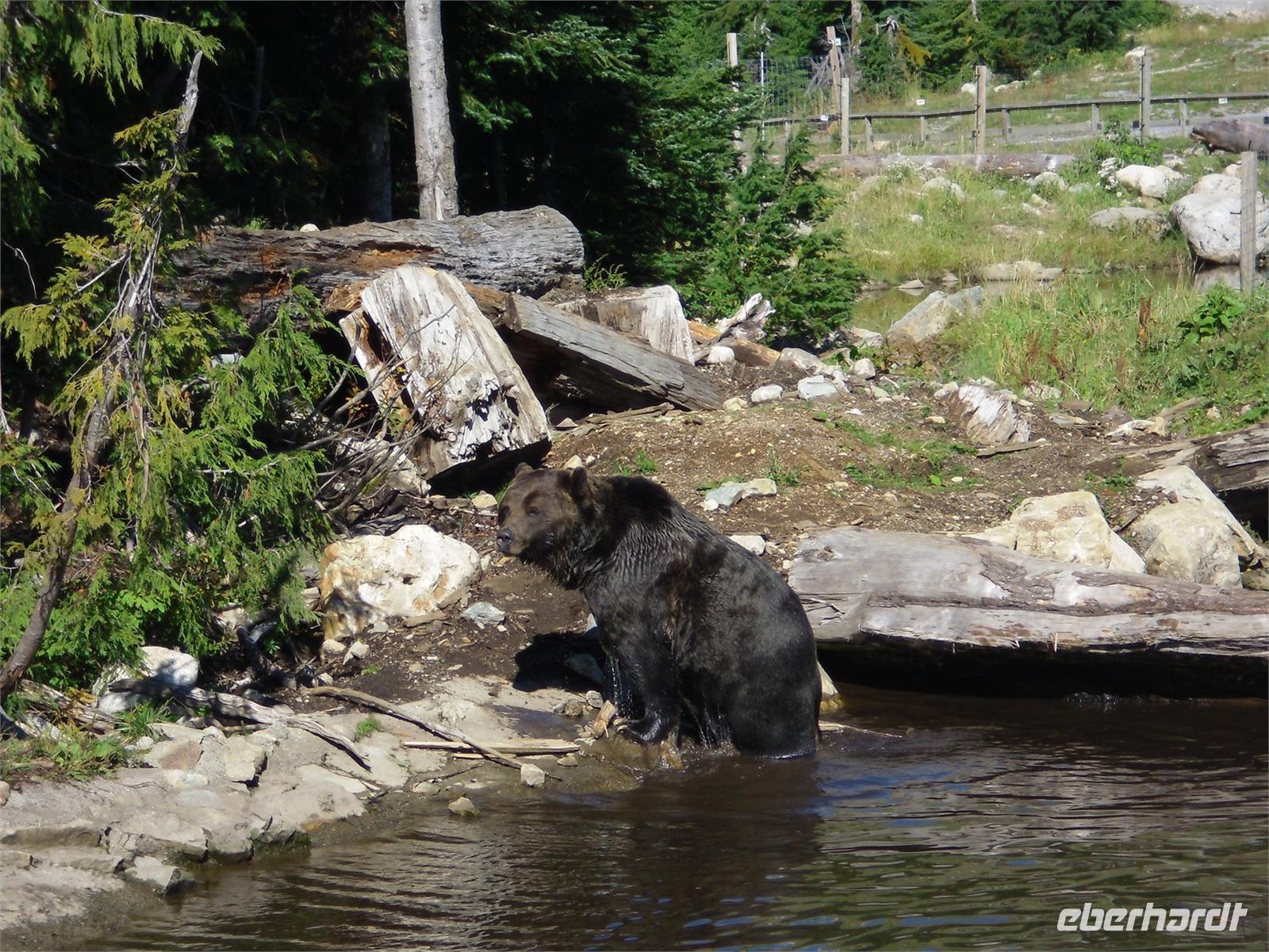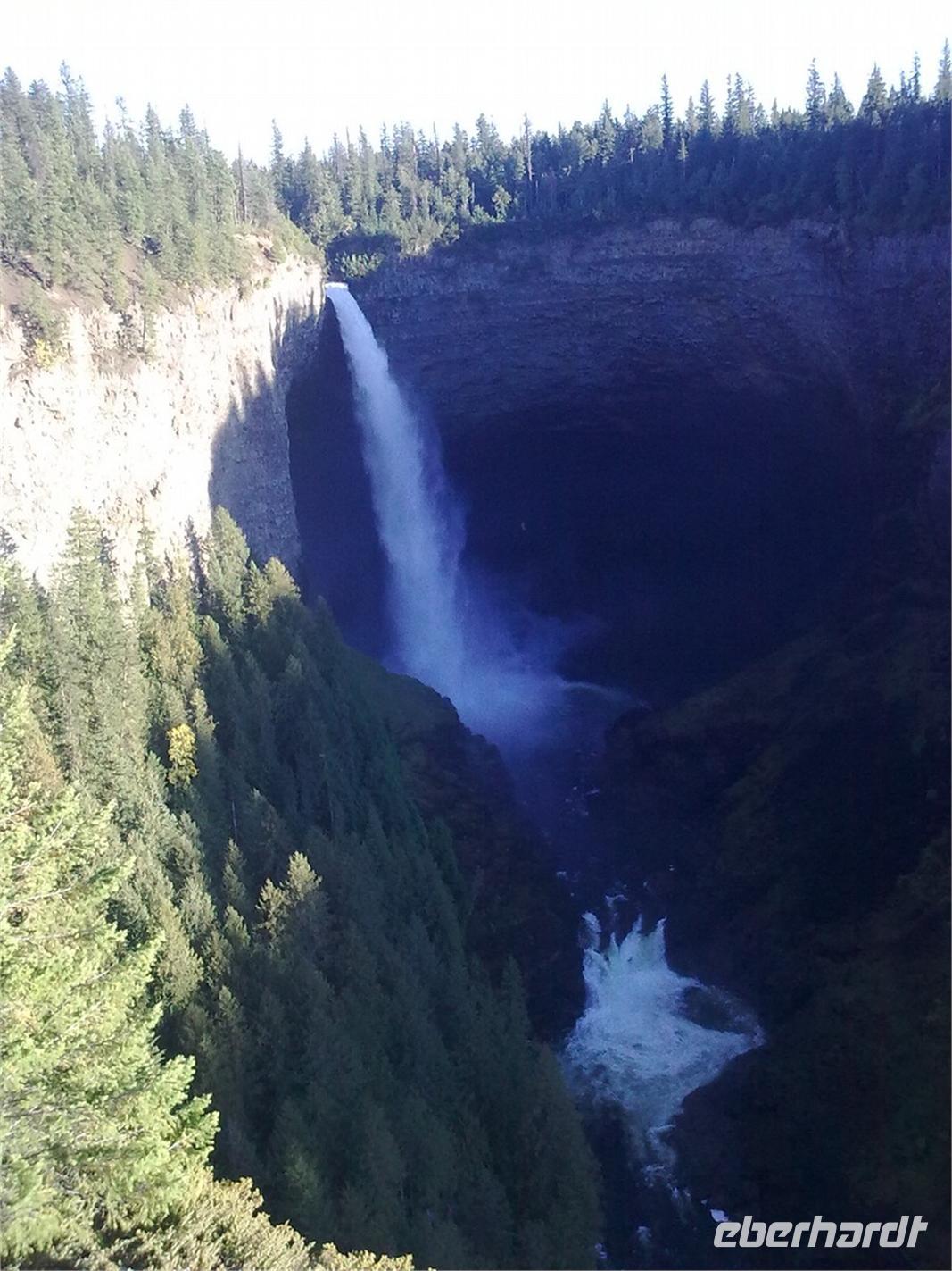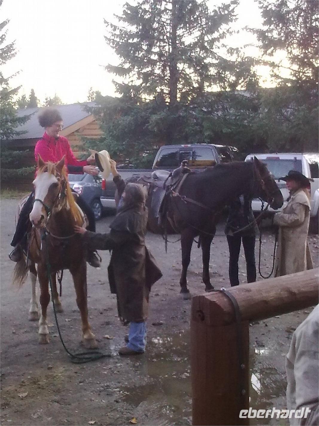 In jedem Falle ist die Stimmung auf unserer Weiterfahrt durch den Park sehr gelockert. Unser erstes Ziel sind die Dawson Falls, die sogenannten „Kleinen Niagarafälle". Hier stürzt der Murtle River 15 Meter tief über eine 90 Meter breite Felsstufe. Nach einem kurzen Fotostopp brechen wir zum nächsten Wasserfall auf. Diesmal sehen wir die Helmcken Falls. Es ist erneut der Murtle River, der sich über eine Basaltstufe stürzt, diesmal 141 Meter tief. Am Abend kommen wir an der „Wells Gray Guest Ranch" an. Es kommen uns drei als Cowboys verkleidete Reiter mit ihren Pferden entgegen, um uns zu begrüßen und in die Einfahrt zu begleiten. Danach dürfen wir selbst einmal Cowboy spielen und mit Pistole und Cowboyhut bewaffnet auf einem Pferd posieren. Nun können wir in der rustikal eingerichteten Gaststube Platz nehmen. In wenigen Augenblicken beginnt unser Barbecue. Zu Steak kann man sich folgende Leckereien auf seinen Teller laden: Bohnen, Zwiebeln, Ofenkartoffel mit Sour Cream, Speck und Nudel- und Krautsalat. Es schmeckt einfach vorzüglich! Während des gesamten Essens werden wir von Live-Countrymusik begleitet und hören Titel wie „Country Roads". Vor dem Dessert erfolgt eine Ansprache des österreichischen Inhabers der Ranch. Dieser lebt bereits seit 30 Jahren in Kanada, hat aber nichts von seinem heimatlichen Akzent verloren. Er möchte uns auf Fiffi und Fuffu aufmerksam machen. Fuffu ist ein eigentlich recht männlicher Typ aus unserer Gruppe, der dann aber mit auffällig weiblichen Zügen zur Belustigung aller anderen Schokokuchen mit Sahne servieren muss. Es ist die Rolle seines Lebens und wir amüsieren uns köstlich. Im Anschluss fahren wir in unser Hotel zurück und legen uns auf die Lauer zur Bärenbeobachtung. An den Vortagen hatte man in der Nacht häufiger Bären zu Sicht bekommen. Wir selbst haben leider nicht so viel Glück.