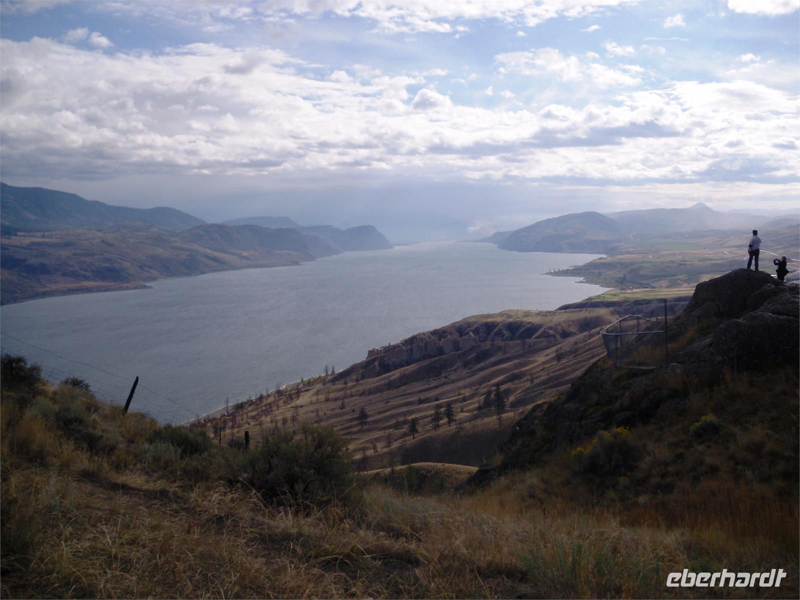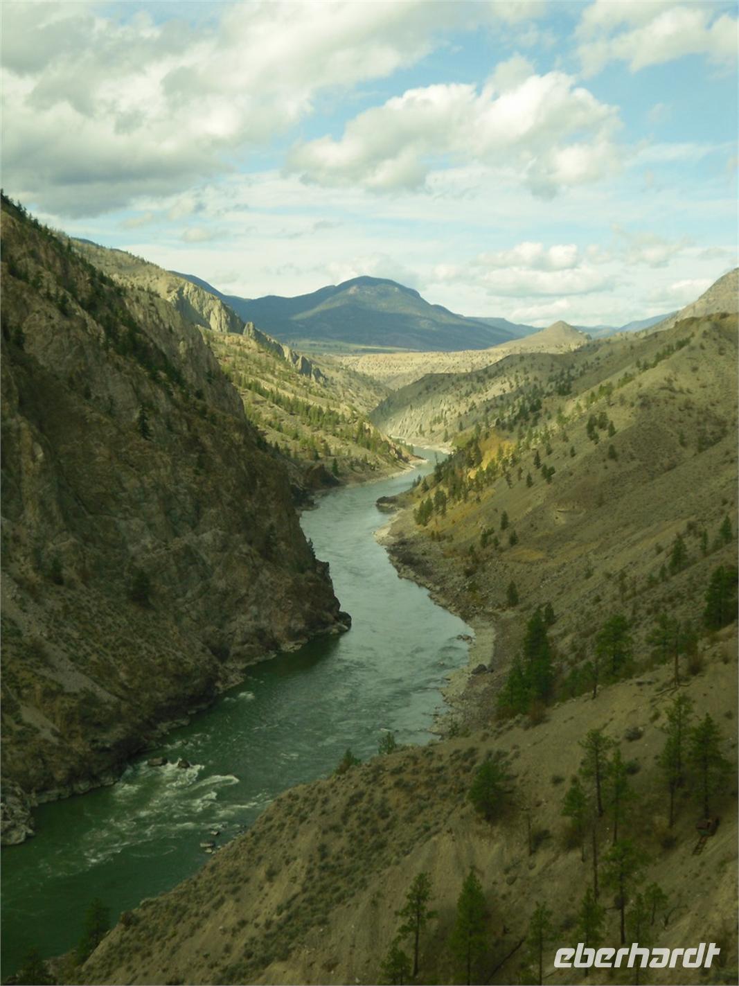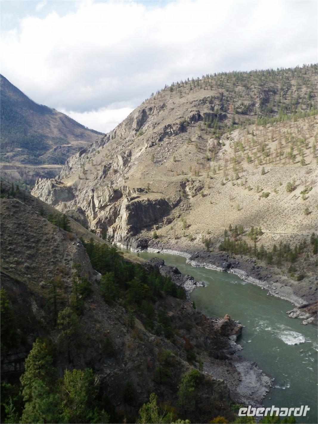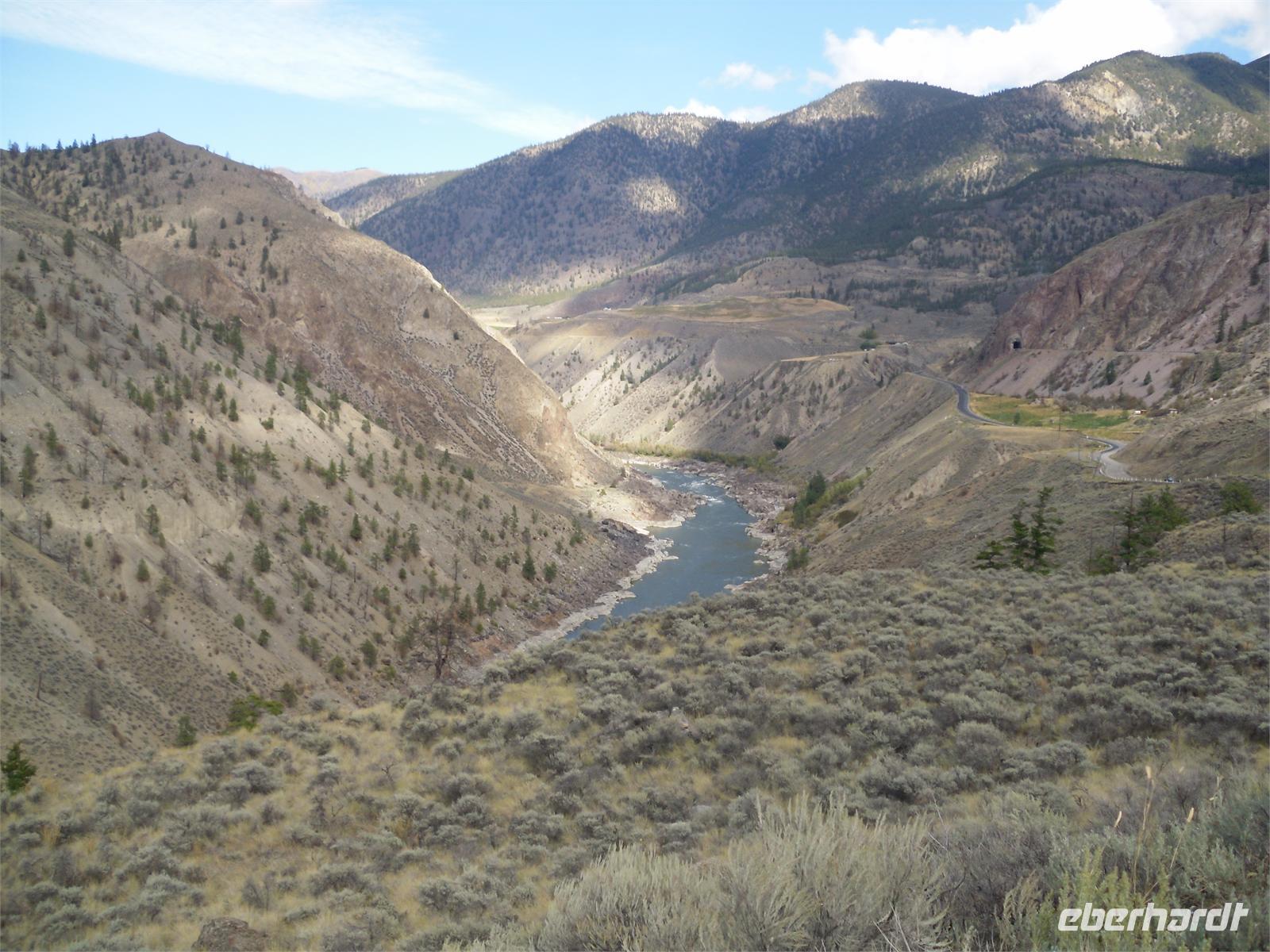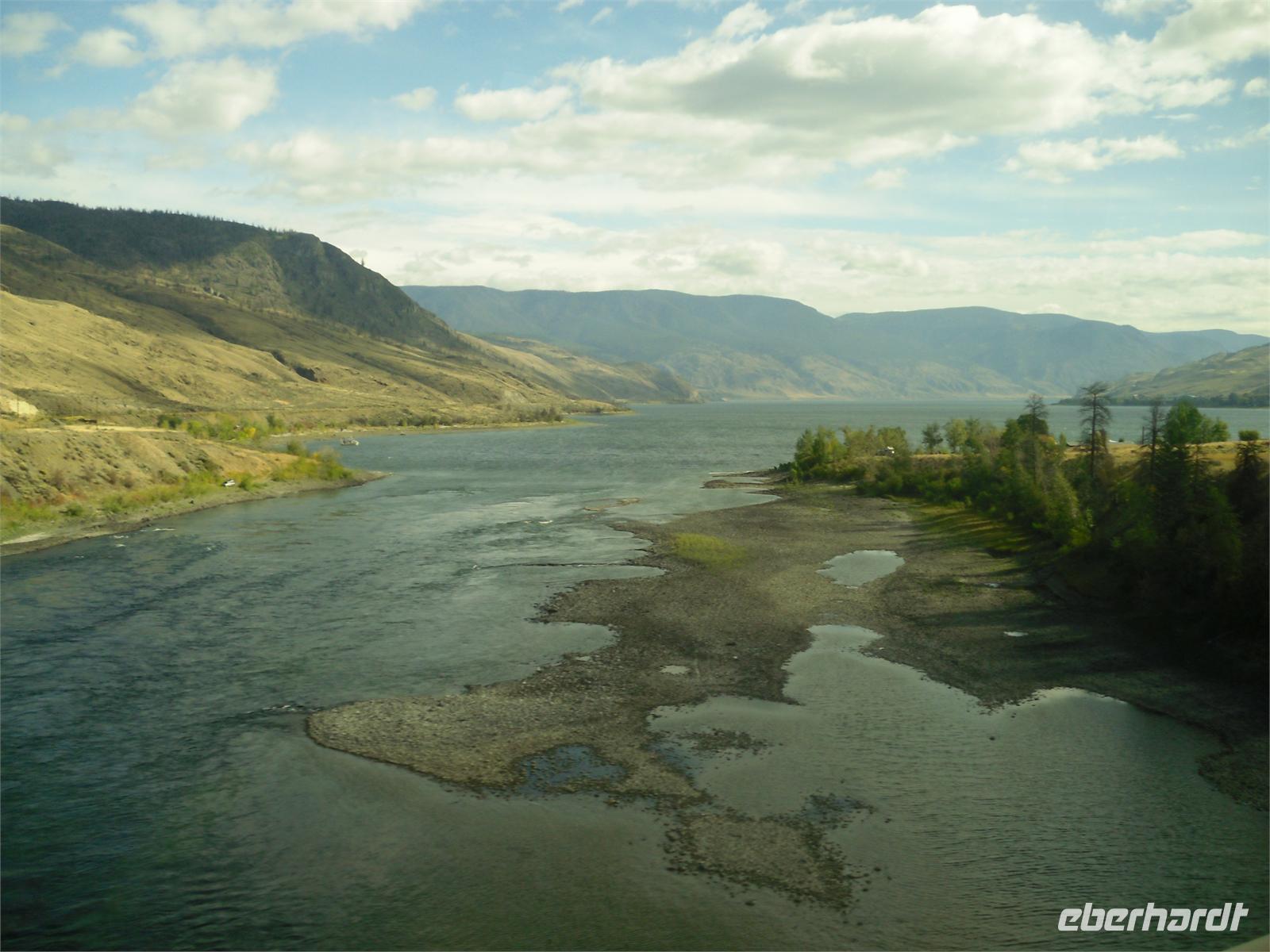 Hier ist auch der Zusammenfluss des North Thompson Rivers und des South Thompson Rivers zum Thompson River. Nach einer kurzen Durchfahrt durch die „Stadt der Cowboys", biegen wir auf den Trans-Canada-Highway. Hier stoppen wir am 29 Kilometer langen und 1,6 Kilometer breiten Kamloops Lake. Der bis zu 152 Meter tiefe See ist ein herrliches Fotomotiv. Am westlichen Ende des Sees liegt das kleine Städtchen Savona. Wir fahren ab nun durch die Coast Mountains, ein sehr trockenes und vegetationsarmes Gebirge. Als nächstes folgt die Durchfahrt durch Cache Creek, dem Ausgangsort für viele Goldgräber Mitte des 19. Jahrhunderts. Wir fahren außerdem entlang des Gold Rush Trails, einer 800 Kilometer langen Goldgräberstrecke. Diese führt uns zur „Hat Creek Ranch". Das Haupthaus dieser Anlage stammt aus dem Jahre 1861. Es war Donald McLean, der einst das Rasthaus baute. Seitdem gab es viele Eigentümer, die die Herberge und Farm aus- und umbauten. Als einst ideal gelegener Ort entlang des Gold Rush Trails gab es immer genügend Gäste, die eine Unterkunft suchten.