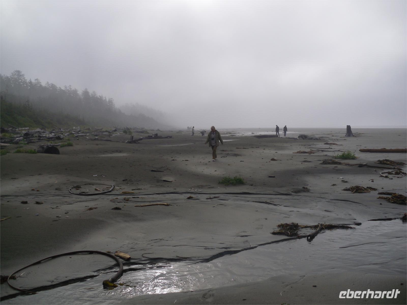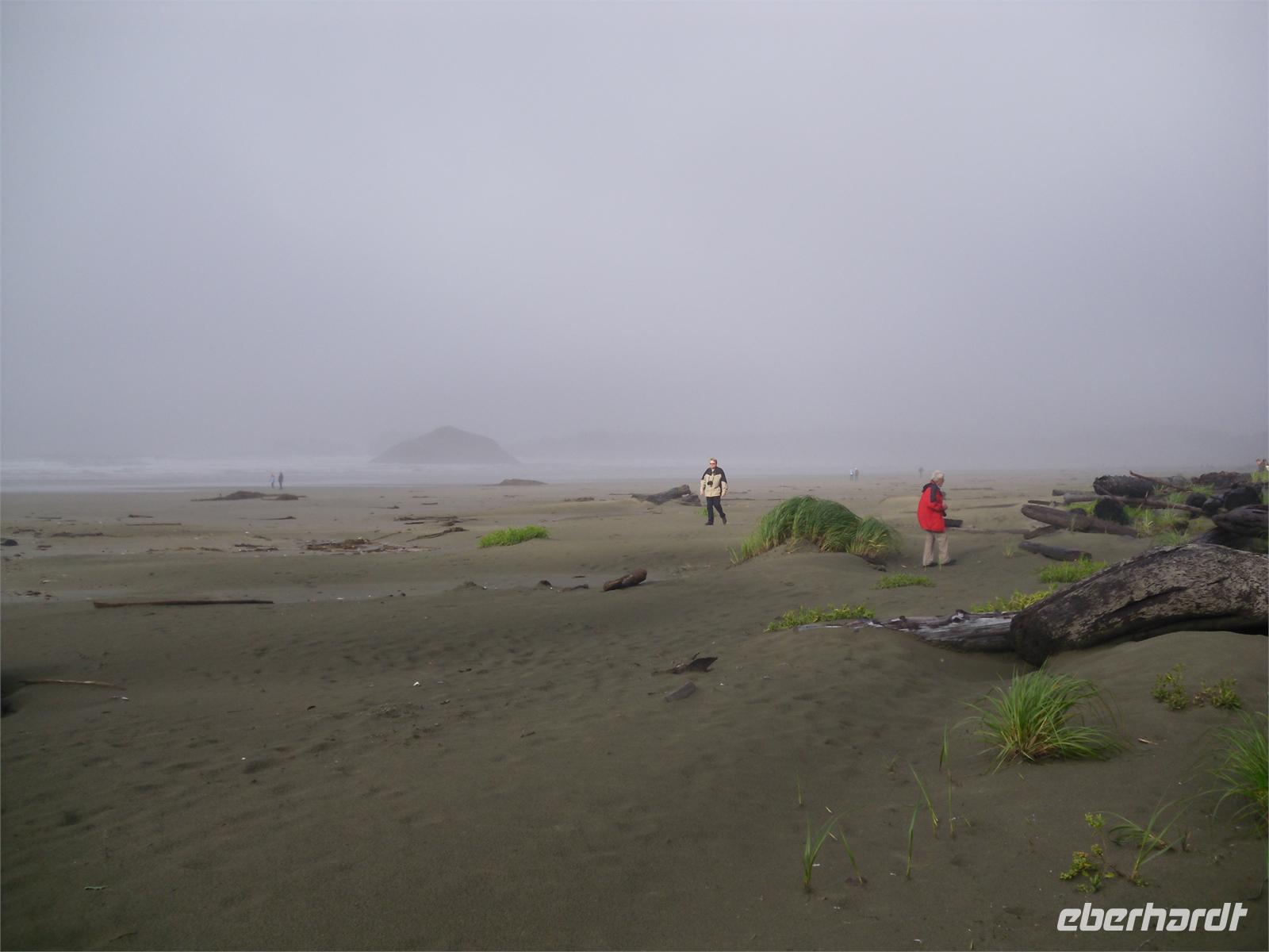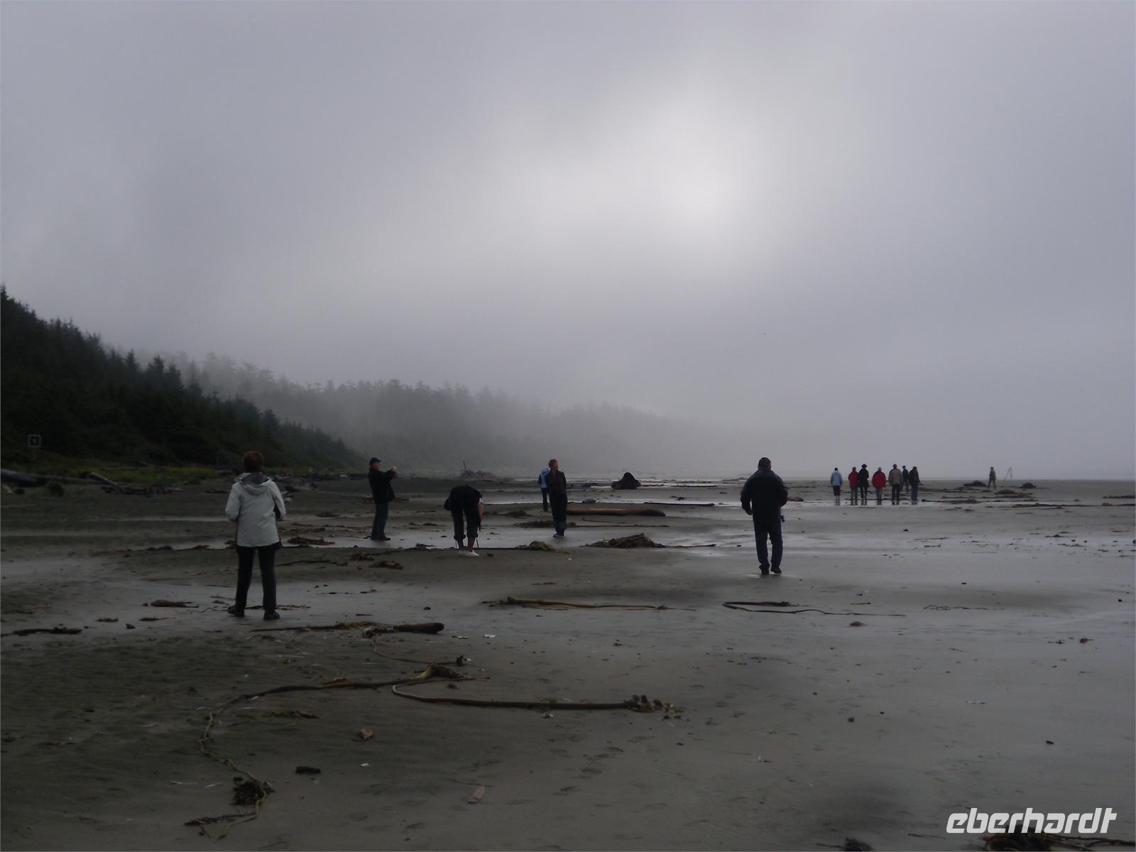 Am zeitigen Nachmittag kommen wir im Mac Millan Provincial Park an. Es regnet mal wieder in Strömen, doch davon lassen wir uns nicht entmutigen. Obwohl sich große Pfützen auf dem Rundweg durch den Park gebildet haben, möchten wir uns die riesigen Bäume des Regenwaldes nicht entgehen lassen. Hier gibt es einige bis zu 800 Jahre alte Douglasien zu bestaunen. Der Bestand ist als „Cathedral Grove" bekannt. Viele Bäume sind bis zu 75 Meter hoch und haben einen Stammumfang von bis zu zehn Metern. Unsere Weiterfahrt führt uns durch Port Alberni und vorbei am Kennedy Lake. Am späten Nachmittag stoppen wir am Informationscenter in Wickaninnish, nur um zu erfahren, dass auch in den nächsten Tagen mit viel Regen zu rechnen ist. Ob der morgige Ausflug zu den heißen Quellen stattfinden kann, ist zum jetzigen Zeitpunkt rätselhaft. Wenig später kommen wir an unserem Hotel „Clayoquot - Orca Resort Lodge" an. Wir alle werden von der Gastgeberin Monique mit Vornamen angesprochen. Spätestens jetzt wissen wir auch, dass es drei Petras in unserer Gruppe gibt. Eine Stunde später verlassen wir das Hotel, um zum Restaurant Wikaninnish, welches direkt am Long Beach liegt, zu fahren. Hier speisen wir in sehr gemütlichem Ambiente mit Blick auf das Meer. Leider wird es zu schnell dunkel. Wir können uns dieses Mal zwischen Lachs mit Risotto und Nudeln mit Scampis entscheiden. Mit der Hoffnung auf besseres Wetter gehen wir an diesem Abend schlafen.