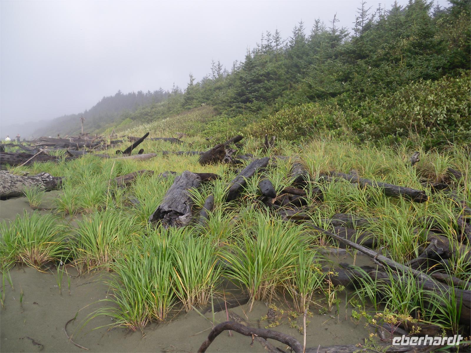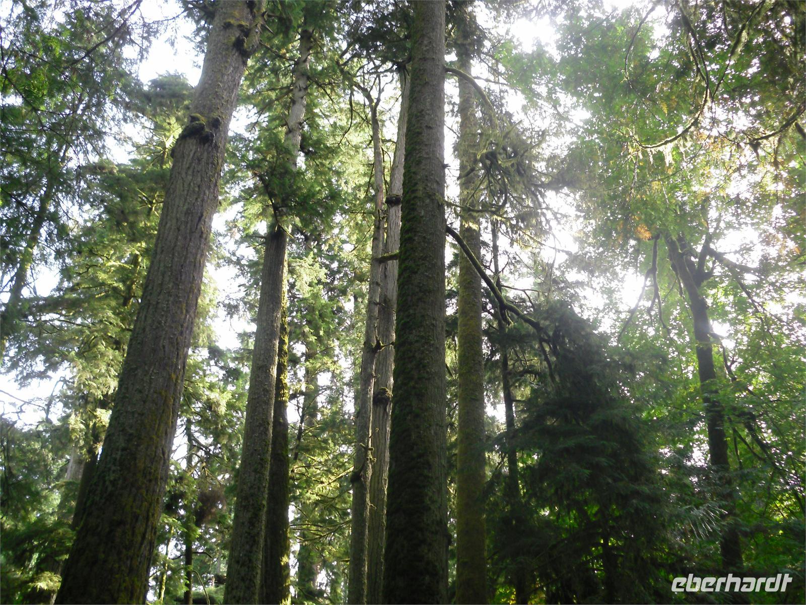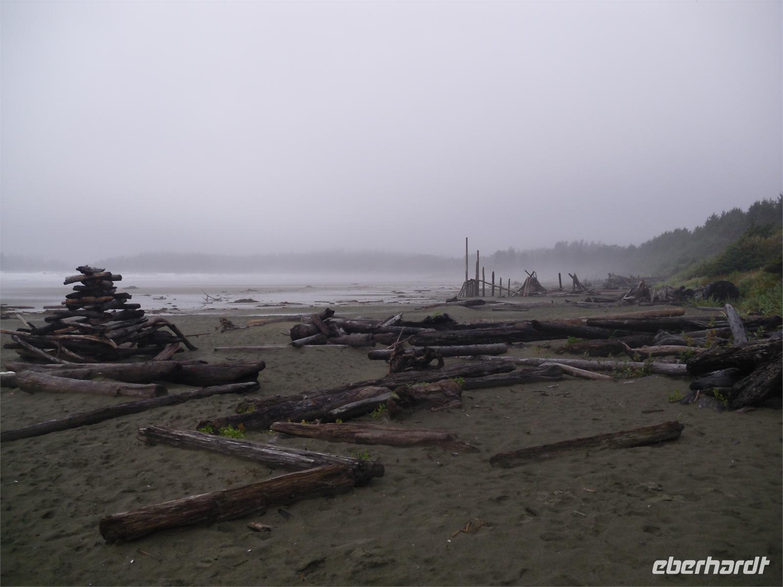 Am zeitigen Nachmittag kommen wir im Mac Millan Provincial Park an. Es regnet mal wieder in Strömen, doch davon lassen wir uns nicht entmutigen. Obwohl sich große Pfützen auf dem Rundweg durch den Park gebildet haben, möchten wir uns die riesigen Bäume des Regenwaldes nicht entgehen lassen. Hier gibt es einige bis zu 800 Jahre alte Douglasien zu bestaunen. Der Bestand ist als „Cathedral Grove" bekannt. Viele Bäume sind bis zu 75 Meter hoch und haben einen Stammumfang von bis zu zehn Metern. Unsere Weiterfahrt führt uns durch Port Alberni und vorbei am Kennedy Lake. Am späten Nachmittag stoppen wir am Informationscenter in Wickaninnish, nur um zu erfahren, dass auch in den nächsten Tagen mit viel Regen zu rechnen ist. Ob der morgige Ausflug zu den heißen Quellen stattfinden kann, ist zum jetzigen Zeitpunkt rätselhaft. Wenig später kommen wir an unserem Hotel „Clayoquot - Orca Resort Lodge" an. Wir alle werden von der Gastgeberin Monique mit Vornamen angesprochen. Spätestens jetzt wissen wir auch, dass es drei Petras in unserer Gruppe gibt. Eine Stunde später verlassen wir das Hotel, um zum Restaurant Wikaninnish, welches direkt am Long Beach liegt, zu fahren. Hier speisen wir in sehr gemütlichem Ambiente mit Blick auf das Meer. Leider wird es zu schnell dunkel. Wir können uns dieses Mal zwischen Lachs mit Risotto und Nudeln mit Scampis entscheiden. Mit der Hoffnung auf besseres Wetter gehen wir an diesem Abend schlafen.