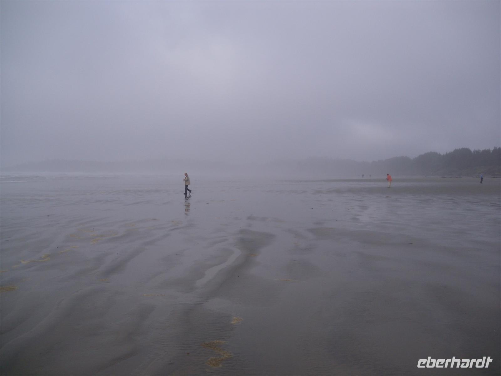 Nachdem wir etwas gegessen haben, fahren wir erst einmal nach Tofino. Erst im Bus unterrichtet uns Viktor davon, dass der Ausflug nicht stattfinden kann. Unsere Badesachen und Handtücher können wir also beiseite schieben. In Tofino, einem 1.700 Einwohner kleinen Fischerdorf, laufen wir zum Hafen, besuchen die zahlreichen Souvenirshops und schauen uns in der „Eagle Aerie Gallery" um. Am späten Vormittag fahren wir zum Hotel zurück. Und was nun? Olivia, die Eigentümerin des Hotels, möchte mit uns eine Führung durch die Umgebung des Hotels unternehmen. Sie stellt uns Gummistiefel und Regenjacken zur Verfügung. Dabei erzählt sie davon, wie sie 1999 das Grundstück für eine Million kanadische Dollar gekauft und das damalige Gebäude mit eigenen Händen auf das heutige Hotel erweitert hat. Wir laufen zum Meer und bei der Führung durch ihren eigenen Regenwald erklärt sie uns eine Menge zu verschiedenen Bäumen. Sie ist wahrlich stolz auf ihr Grundstück und was sie geleistet hat. Einige von uns trauen sich am zeitigen Nachmittag noch an den Strand. Es regnet mittlerweile sehr heftig und es ist unglaublich windig. Wir beobachten die vielen Surfer am Strand, die sich mit Mühe und Not durch die Wellen und den Wind kämpfen. Der Nachmittag steht uns zur freien Verfügung. Viele von uns nutzen die Zeit für ein Nickerchen oder für ein gutes Buch. Am Abend essen wir im hoteleigenen Restaurant. Nach einer Suppe werden uns Lachs oder Schwein gereicht. Als Nachspeise gibt es Käsekuchen, welcher ganz besonders lecker ist. Monique kümmert sich sehr gut um uns. Einige Gäste lassen den Abend im kuscheligen Aufenthaltsraum ausklingen. Vor die Tür will heute keiner mehr!