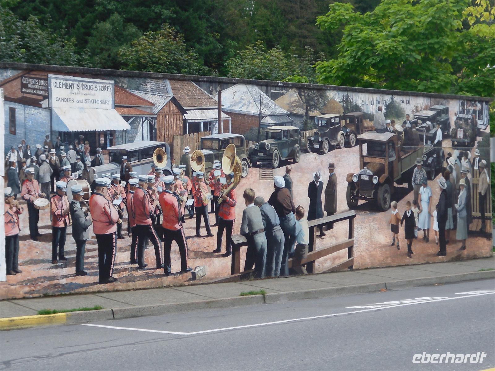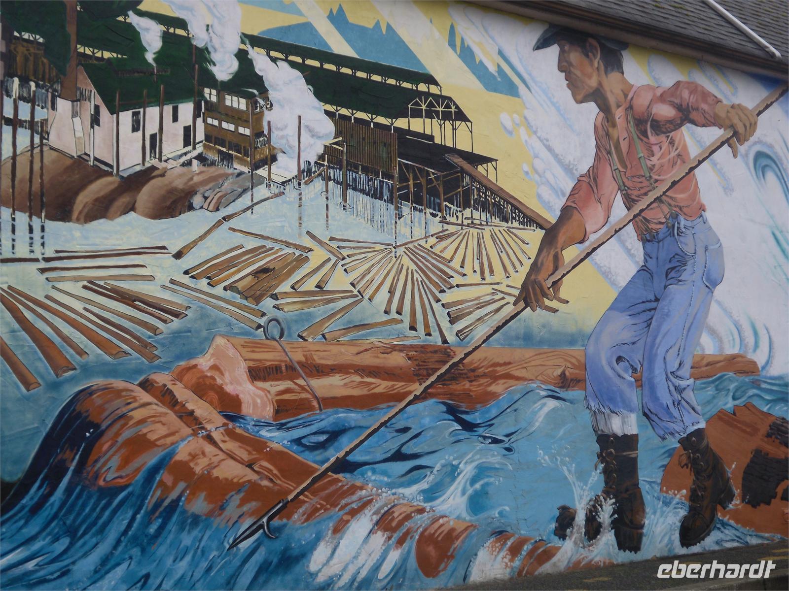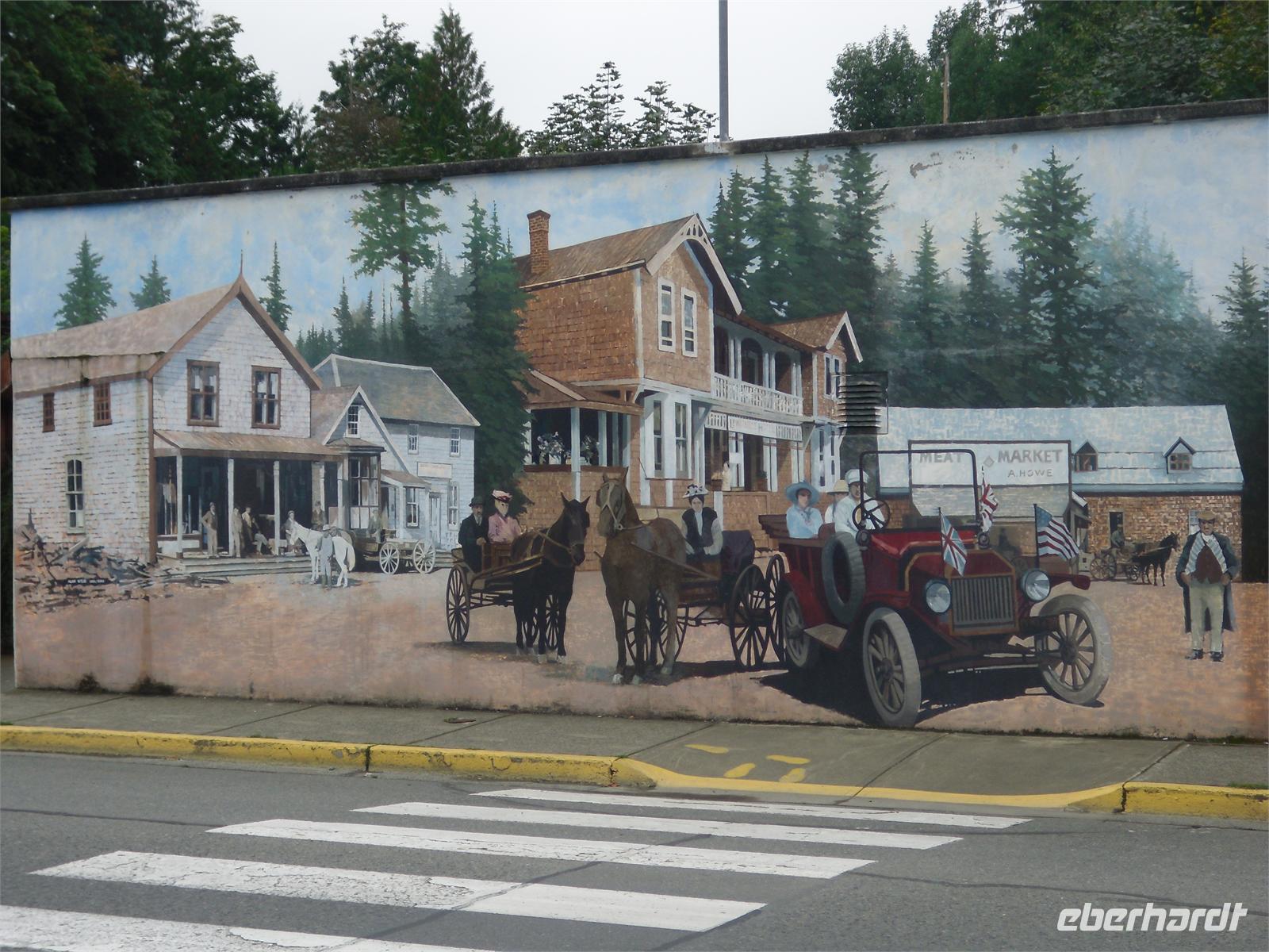 Nach diesem Stranderlebnis fahren wir weiter nach Port Alberni. Dort stoppen wir gegen Mittag bei Tim Hortons. Mit einem Kaffee in der Hand und sogenannten Timbits (kleine Quarkbällchen) bewaffnet, fahren wir noch einmal zum Mac Millan Provincial Park. Diesmal können wir die riesigen Bäume im Sonnenlicht fotografieren. Am zeitigen Nachmittag kommen wir in Chemainus (4.000 Einwohner) an. Dieser kleine Touristenort ist vor allem für seine überlebensgroßen Häuserbemalungen (Murals) bekannt. Diese zeigen die Begebenheiten der Stadtgeschichte. In Chemainus besorgen wir uns eine Kleinigkeit zu Mittag, fotografieren die Wandgemälde und bummeln durch die kleine Hauptstraße. Am Nachmittag setzen wir uns wieder in Bewegung. Wir fahren über den 352 Meter hohen Malahat Pass und kommen 30 Minuten später in Victoria, der Hauptstadt British Columbias, an. Im Anschluss gibt uns Viktor eine kurze, orientierende Stadtrundfahrt, in der sich unsere Köpfe sehr schnell von links nach rechts drehen. Alle Sehenswürdigkeiten liegen nah beieinander, sodass Viktor sich fast um Kopf und Kragen redet.