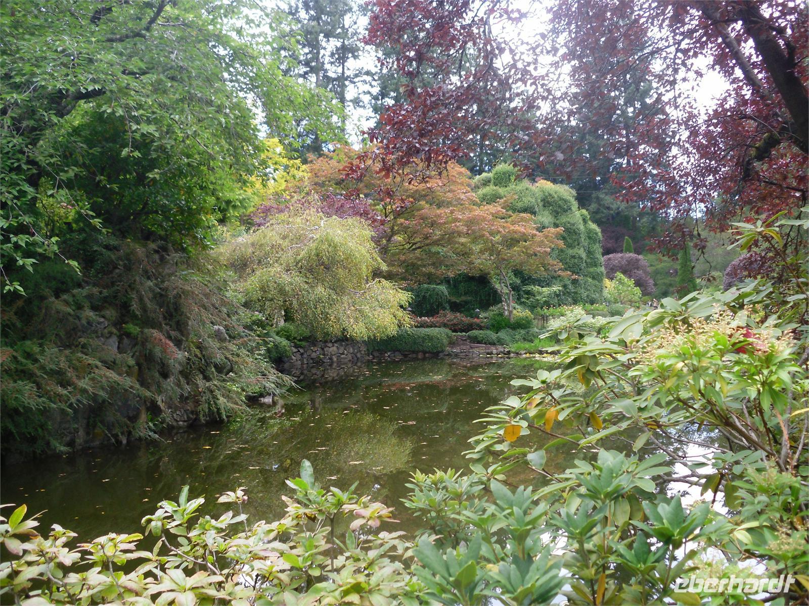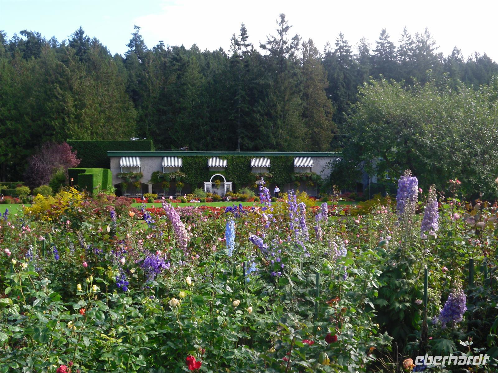 Eine davon gehört noch heute der Butchart Familie und in einer anderen hat früher Francis M. Rattenbury gelebt. Außerdem schauen wir uns das Nobel-Wohnviertel Uplands an. Nach einem kurzen Fotostopp im kleinen Park Cattle Point fahren wir am Royal Victoria Yacht Club vorbei und dann weiter zu den Butchart Gardens. Nachdem wir alle mit Übersichtsplänen und Pflanzenführern ausgestattet sind, kann unser individueller Rundgang durch die Gärten beginnen. Pünktlich zu unserer Ankunft ist auch die Sonne herausgekommen. Wir starten im Sunken Garden (versunkener Garten), laufen weiter durch den Rose Garden und den Japanese Garden und enden schließlich im Italian Garden. Es war Jenny Butchart, die Frau eines Steinbruchbesitzers, die Anfang des 20. Jahrhunderts einen Blumengarten anzulegen begann. Aus diesem einstigen Gärtchen ist ein 20 Hektar großer, idyllischer Park mit mehr als 5.000 Blumenarten und vielen Brunnen, Teichen und Wasserspielen entstanden. Im garteneigenen Restaurant „The Blue Poppy" essen wir heute zu Mittag. Wir bedienen uns von dem aus verschiedenen Salaten, Reis, Tortellinis, Lachs, Maiskolben und Hühnchen bestehenden Buffet.