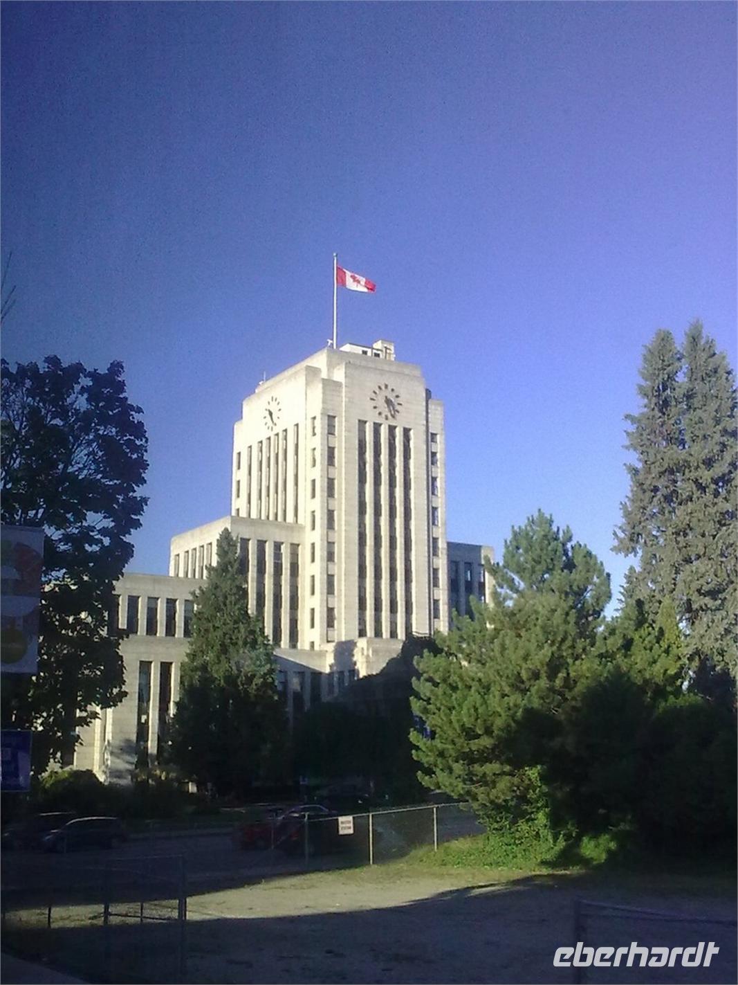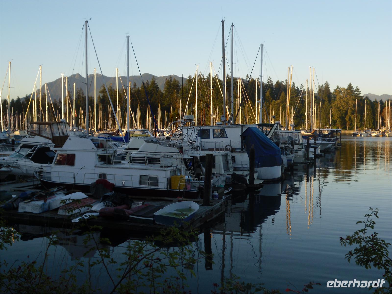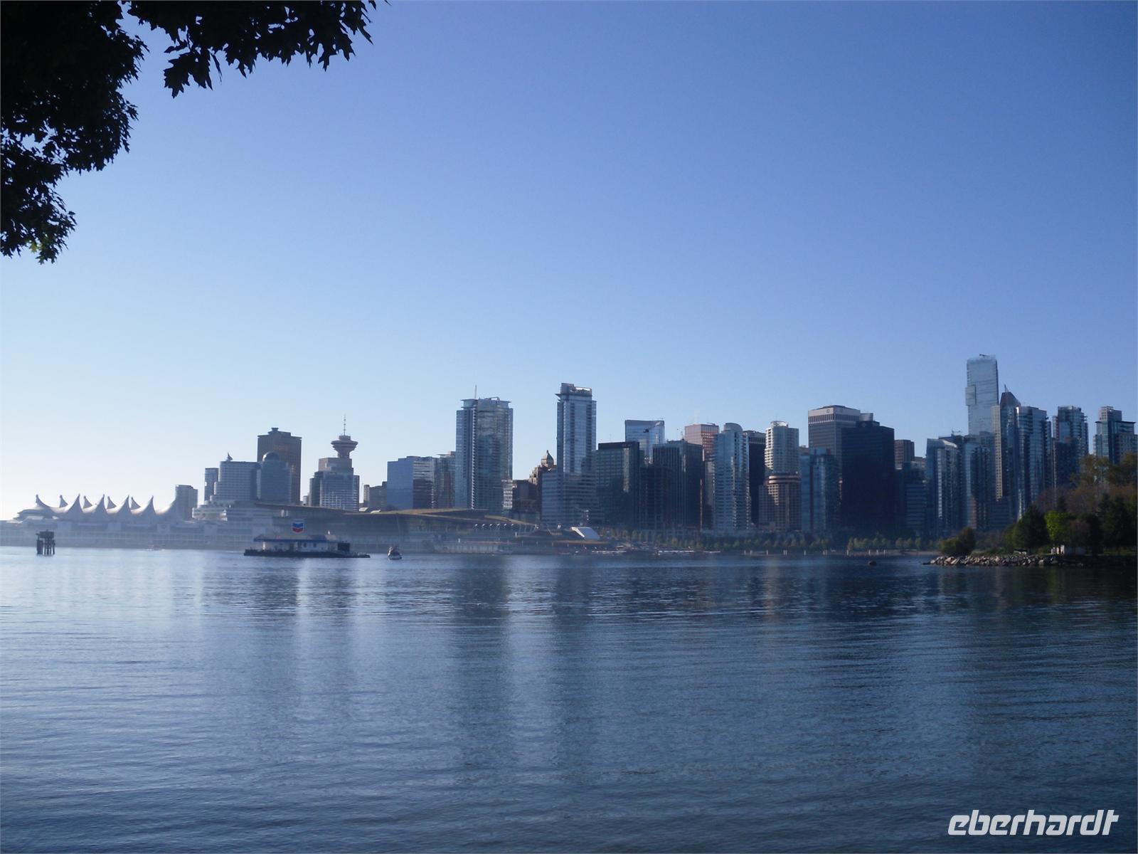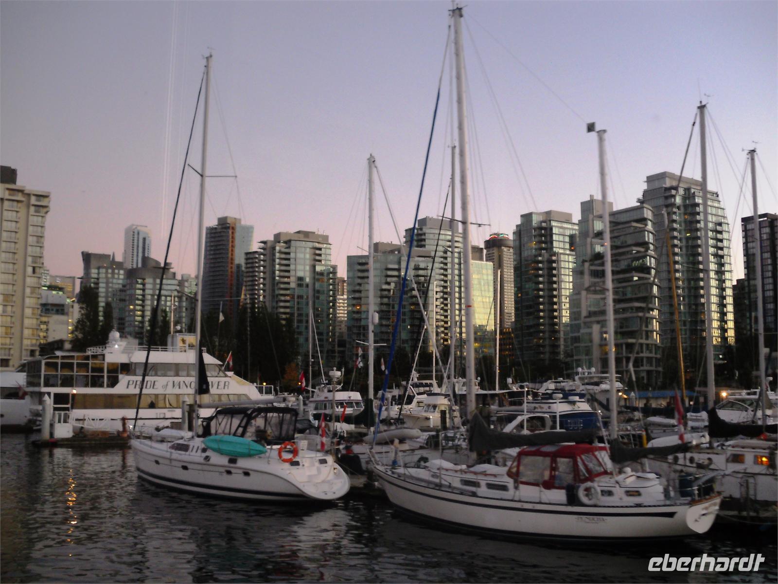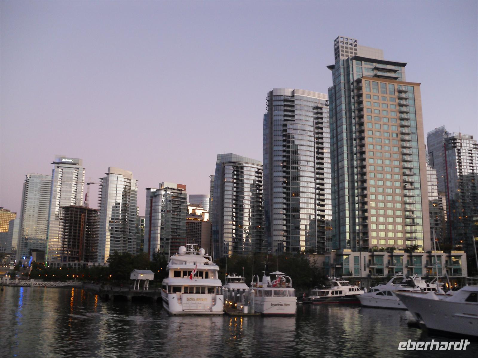 Von den leckeren Kuchenstückchen hätten aber ruhig noch mehr da sein können. Nach dem Mittagessen brechen wir zum Fährterminal Swartz Bay auf. Dabei durchqueren wir das Land der Panquachin-Indianer. Viktor lässt uns raten, wie viele Kilometer wir im Westen Kanadas zurückgelegt haben und noch werden. Es sind 2.879 Kilometer. Dann kommen wir auch schon am Fährterminal an. Die Sonne scheint noch immer und so genießen wir die Abfahrt auf offenem Deck. Wir freuen uns schon auf Vancouver - auf die Stadt, von der man sagt, sie hätte die weltweit höchste Lebensqualität. Am späten Nachmittag treffen wir in Tsawwassen, einem 30 Kilometer von Vancouver entfernten Örtchen ein. Wir müssen erst noch durch das Fraser-Delta und durch Richmond fahren, bevor wir in Vancouver ankommen. Wir nähern uns dem Zentrum über die Granville Street, biegen auf die West King Edward und dann auf die Cambie Street. Wir fahren am Rathaus vorbei und sehen auf der rechten Seite das Olympia-Stadion sowie das Olympische Dorf. Danach geht es weiter durch China Town, bis wir in der Gas Town ankommen. Hier stoppen wir an der berühmten Gasuhr (Steam Clock). Sie wurde in den 1870ern gebaut und stößt alle 15 Minuten einen pfeifenden Dampf aus. Wir haben Glück und können ¾ der Melodie hören. Kurze Zeit später kommen wir am ehemaligen Bahnhof vorbei, der 1986 als Ausstellungshalle für die Expo genutzt wurde. Am Canada Place am Hafen legen wir noch einmal einen längeren Stopp ein. Auf unserer Weiterfahrt in Richtung Hotel fahren wir am Marine Building, dem ältesten Bürogebäude Vancouvers, vorbei und durchqueren das Bankenviertel. Über die Hobson Street gelangen wir zur Denman Street, die uns direkt zu unserem Hotel an der English Bay führt. Es ist mittlerweile Abend, als wir in das Hotel „Best Western Sands" einchecken. Die meisten von uns ziehen aber noch einmal los, um Vancouver im Abendlicht kennenzulernen. Wir spazieren am Strand oder ziehen durch die vielen, belebten Straßen. Viele Geschäfte haben bis 21:00 Uhr geöffnet.
