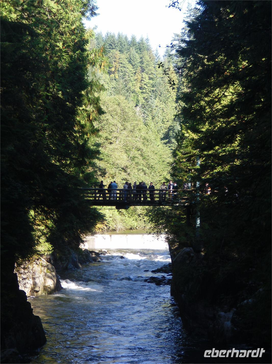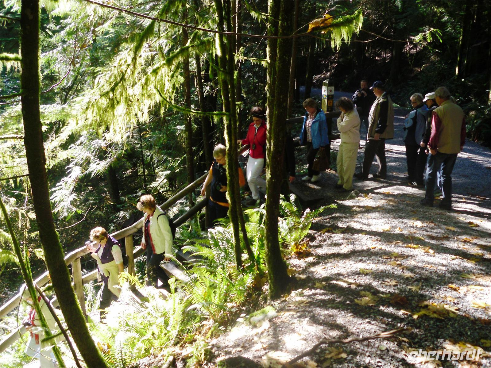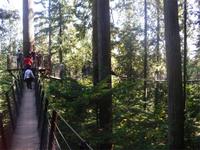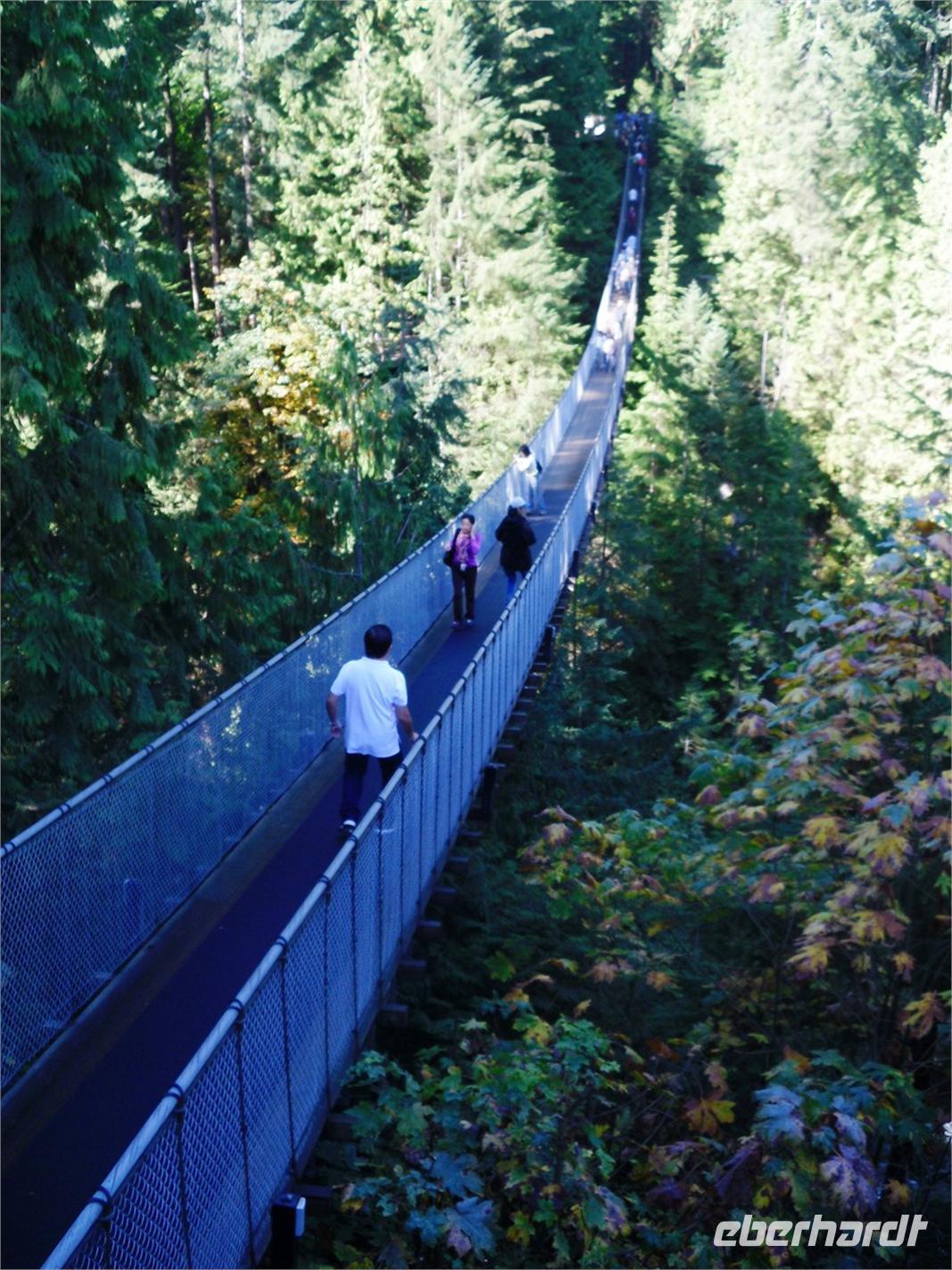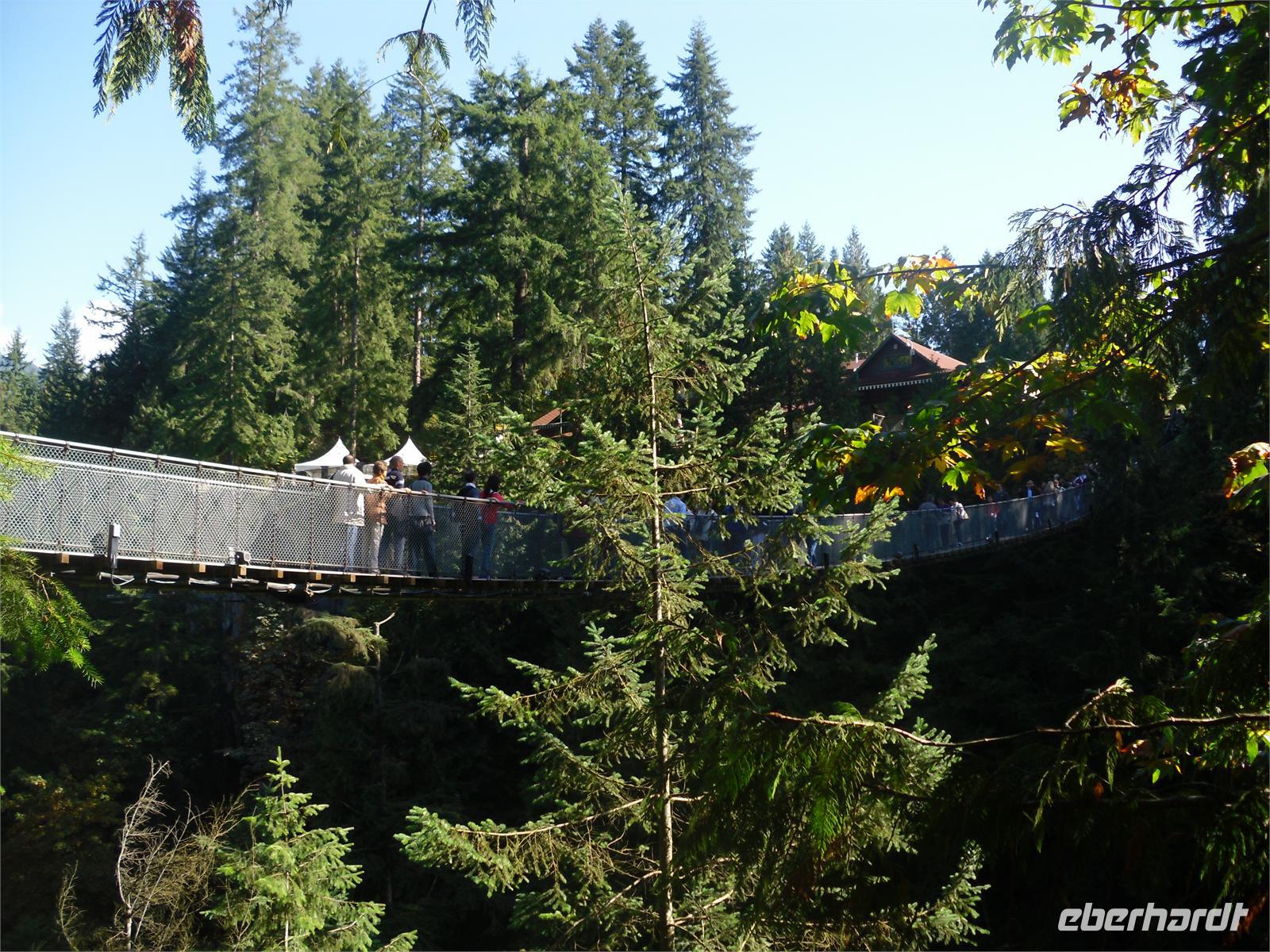 von dem aus man einen fantastischen Blick auf die Skyline Vancouvers hat. Außerdem fotografieren wir die vielen bunten Totempfähle. Weiter geht's über die Lion's Gate in den Norden der Stadt. Wir kommen am Capilano River Regional Park an. Von hier aus wandern wir zu einer Lachsaufzuchtstation. Wir starten am Cleveland Dam und laufen durch den Regenwald mit einigen abgeholzten Zedern. Wir legen einen kurzen Stopp am Cable Loop ein und erreichen wenig später die Capilano River Lachsaufzuchtstation. Hier werden die fünf Lachsarten Coho, Chinook, Pink, Steelhead und Sockeye aufgezogen. Endlich können wir einmal die berühmten Lachssprünge hinter einer Glasscheibe beobachten. Mit dem Bus fahren wir als nächstes zum Gelände der Capilano Suspension Bridge. Hier hängt seit Ende des 19. Jahrhunderts die 70 Meter hohe Hängebrücke, die mit ihren 140 Metern Länge den Capilano Canyon überspannt. In dem alten Bestand von Rotzedern und Douglasien ist eine Art Hochseilgarten entstanden. Mit einem Geländeplan ausgestattet, gehen wir auf individuelle Entdeckertour.