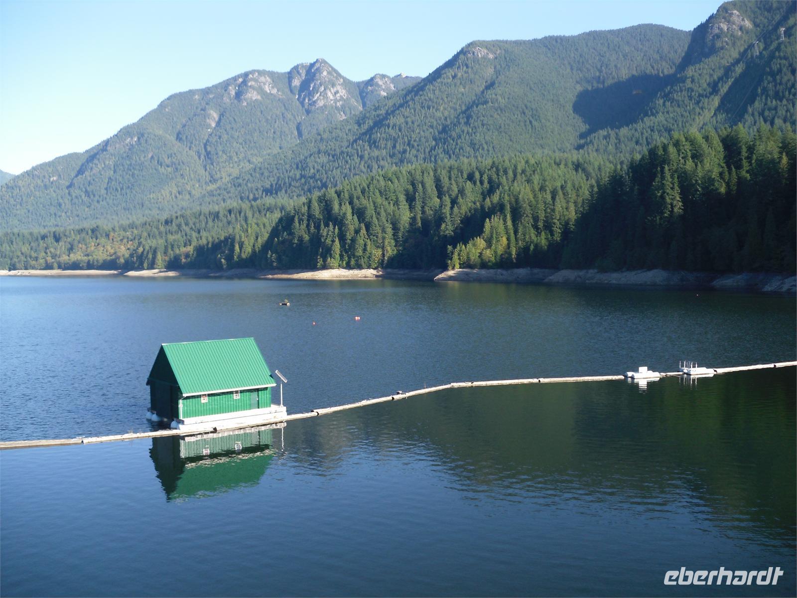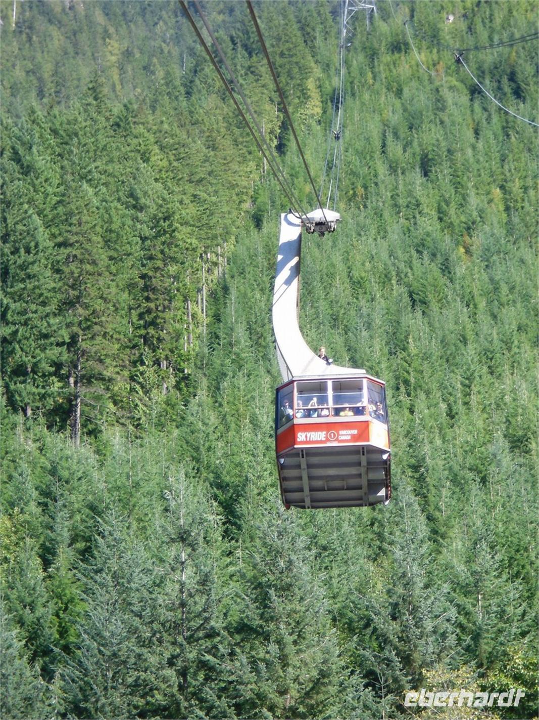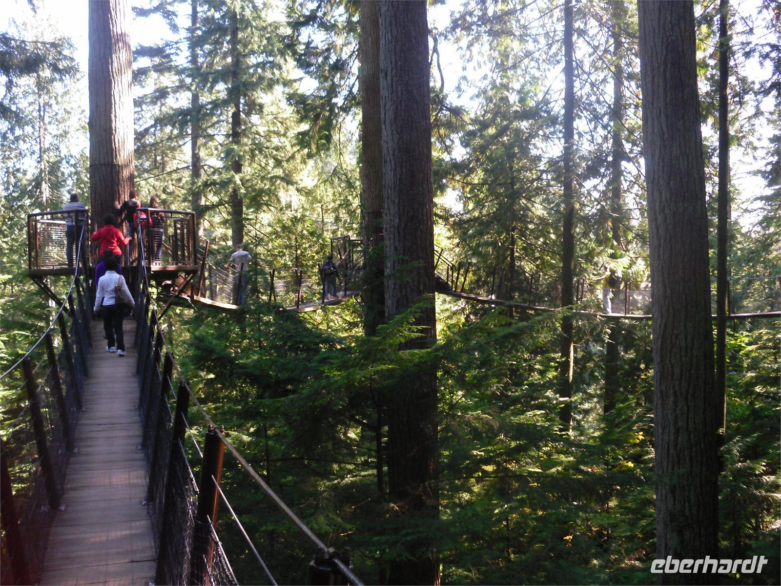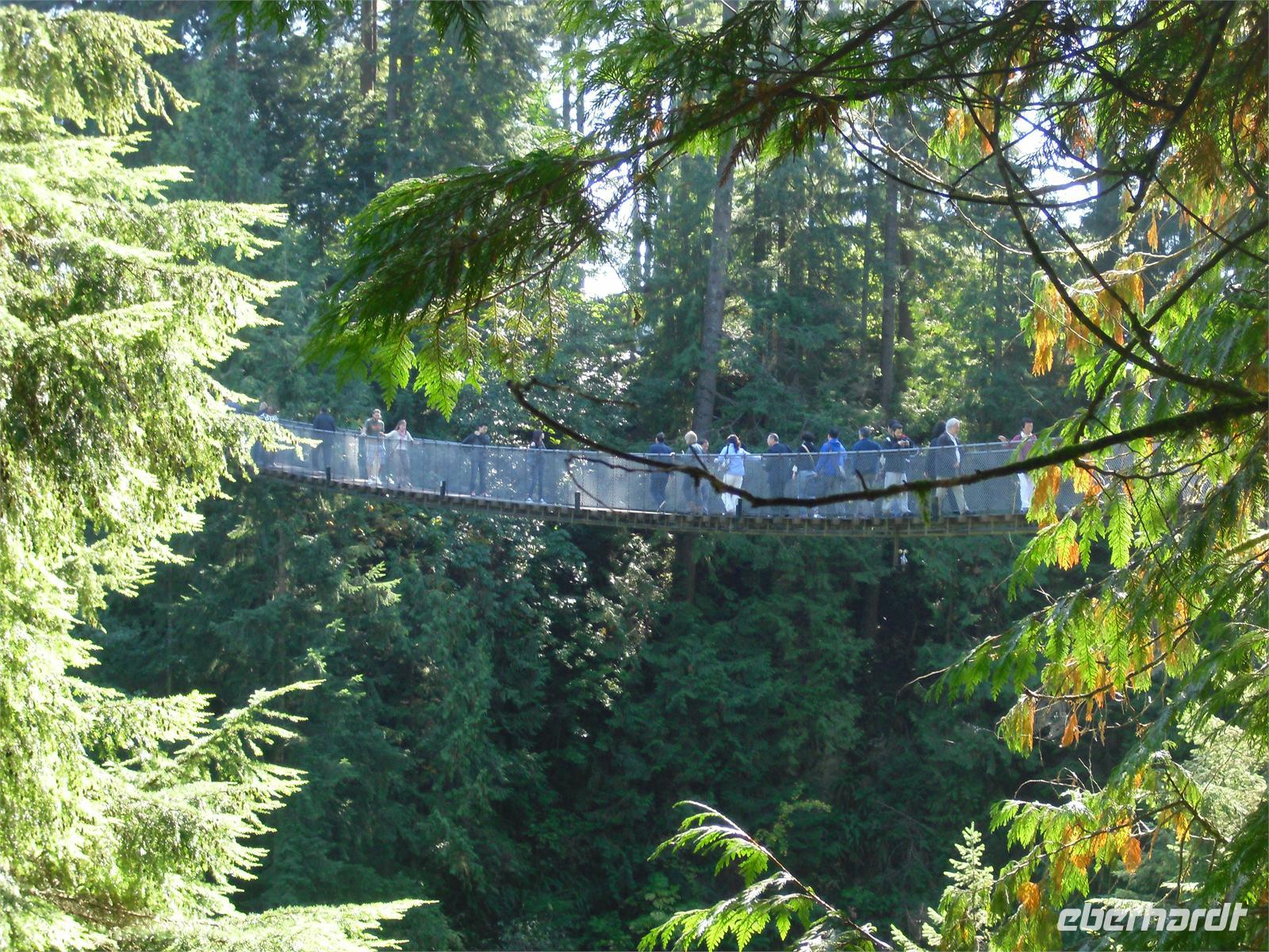 von dem aus man einen fantastischen Blick auf die Skyline Vancouvers hat. Außerdem fotografieren wir die vielen bunten Totempfähle. Weiter geht's über die Lion's Gate in den Norden der Stadt. Wir kommen am Capilano River Regional Park an. Von hier aus wandern wir zu einer Lachsaufzuchtstation. Wir starten am Cleveland Dam und laufen durch den Regenwald mit einigen abgeholzten Zedern. Wir legen einen kurzen Stopp am Cable Loop ein und erreichen wenig später die Capilano River Lachsaufzuchtstation. Hier werden die fünf Lachsarten Coho, Chinook, Pink, Steelhead und Sockeye aufgezogen. Endlich können wir einmal die berühmten Lachssprünge hinter einer Glasscheibe beobachten. Mit dem Bus fahren wir als nächstes zum Gelände der Capilano Suspension Bridge. Hier hängt seit Ende des 19. Jahrhunderts die 70 Meter hohe Hängebrücke, die mit ihren 140 Metern Länge den Capilano Canyon überspannt. In dem alten Bestand von Rotzedern und Douglasien ist eine Art Hochseilgarten entstanden. Mit einem Geländeplan ausgestattet, gehen wir auf individuelle Entdeckertour.