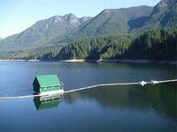 Außerdem ist es sehr nebelig. Nach 1 ½ Stunden Fahrtzeit, vorbei an den Shannon Falls und dem Lion's Bay, kommen wir überpünktlich in Horseshoe Bay an. Wir haben sogar noch ein Stündchen Zeit, um uns in dem kleinen, überschaubaren Örtchen umzusehen. Am Vormittag setzen wir nach Nanaimo über. An Bord der Fähre gibt es einen hübschen Souvenirshop und es liegen viele Prospekte aus. Die Überfahrt vergeht rasch und so kommen wir am Mittag in Nanaimo auf Vancouver Island an. Unsere heutige Mittagspause legen wir in dem Ort Coombs am Old Marketplace ein. Besonders bekannt sind hier die Ziegen auf dem Dach. Leider sind sie heute aufgrund des Nieselregens nicht zu sehen, sondern haben sich in ihre Hütten verkrochen. Wir bummeln durch die niedlichen Geschäfte und decken uns im Supermarkt mit Lebensmitteln für den morgigen Ausflug ein. Danach fahren wir weiter in Richtung Tofino und kommen dabei am Cameron Lake vorbei. Hier können wir einen Blick auf die stillgelegte Eisenbahnstrecke mit der kleinen Holzbrücke werfen.