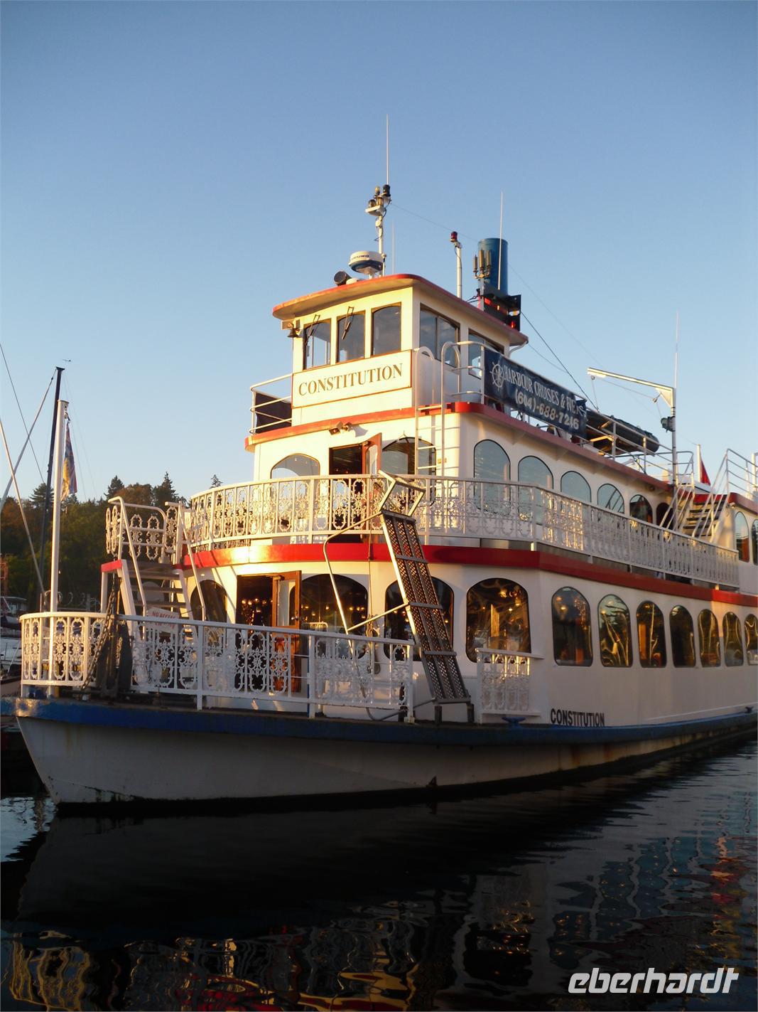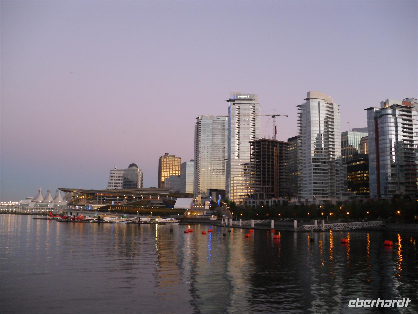 Am Nachmittag treffen wir wieder im Hotel ein. Bis zum Abendessen haben wir noch zwei Stunden Freizeit. Am Abend fahren wir mit dem Bus zum Hafen, um an der Sunset Dinner Cruise teilzunehmen. Wir sind im oberen Teil des Bootes „Constitution" untergebracht und können es kaum erwarten, in den Sonnenuntergang zu fahren. Wir bedienen uns vom leckeren Buffet. Es stehen verschiedene Salate, Lachs, Rinderbraten, Reis und Kartoffeln zur Auswahl. Leider ist der Kuchen, vor allem Schoko, sehr schnell vergriffen. Die Deutschen essen allen die Haare vom Kopf. Diesen Eindruck muss so manch kanadischer Koch gehabt haben. Das Essen wird allerdings zur Nebensache, wenn man sich die beeindruckende Skyline Vancouvers anschaut. Die Stadt ist vom Wasser aus einfach wunderbar anzuschauen, vor allem, wenn sie sich so schön ins Abendlicht hüllt. Wir genießen die vielen herrlichen Aussichten bei netter Live-Musik. Die 3 ½ Stunden gehen zügig vorbei und so holt uns Gerard am späten Abend wieder ab. An diesem Abend müssen wir uns bereits von ihm verabschieden, denn er fährt nach Calgary zurück.