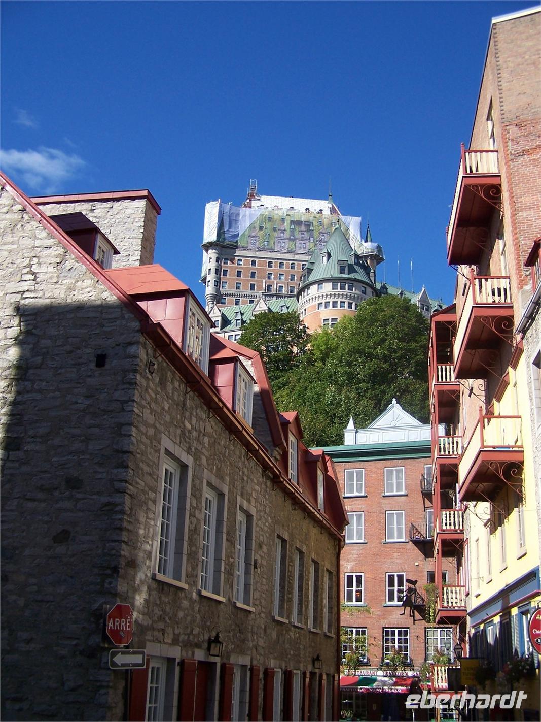 Ähnlich wie in Montreal begeben wir uns zunächst zu einem Aussichtspunkt. Die Fields of Abraham liegen über der Stadt und waren Schauplatz der Unabhängigkeitskriege zwischen der britischen Krone und der Kolonialmacht Frankreich. Wir setzen unsere Besichtigung fort. Nächste Station ist die Oberstadt Quebecs. Besonders markant thront über der Stadt das Chateau Frontenac mit der direkt angeschlossen Dufferin Terasse. Vor hier aus genießt man einen einmaligen Blick über die Unterstadt und den St-Lorenz-Strom.